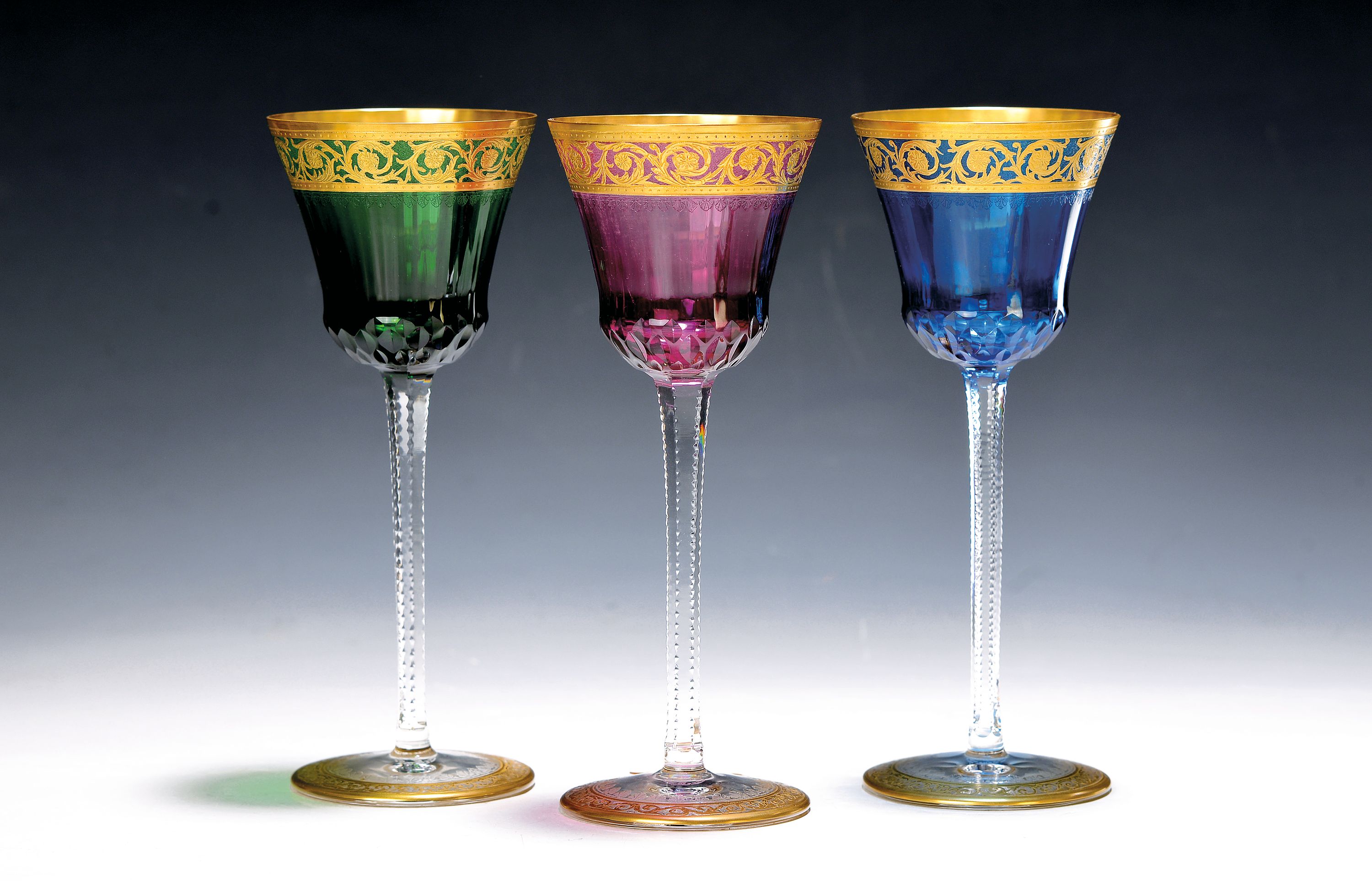 3 Weingläser mit Überfängen, Thistle, Saint Louis, mundgeblasenes und fein geschliffenes
