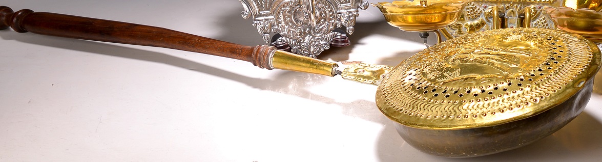 Bettpfanne und zwei Blaker, 19. Jh., , Messing, Bettpfanne mit reich verziertem Deckel in Durchbrucharbeit, Adam und Eva, gedrechselter Nussbaumgriff, L.ca. 99 cm zwei Blaker 18./19. Jh., Messing, a. mit gravierter/punzierter umlaufender Bordüre, eine Brennstelle, ca. 32 x 15 cm, b. geprägtes Blumenmontiv, gebördelter Rand, eine Brennstelle, 22.5 x15.5 cm