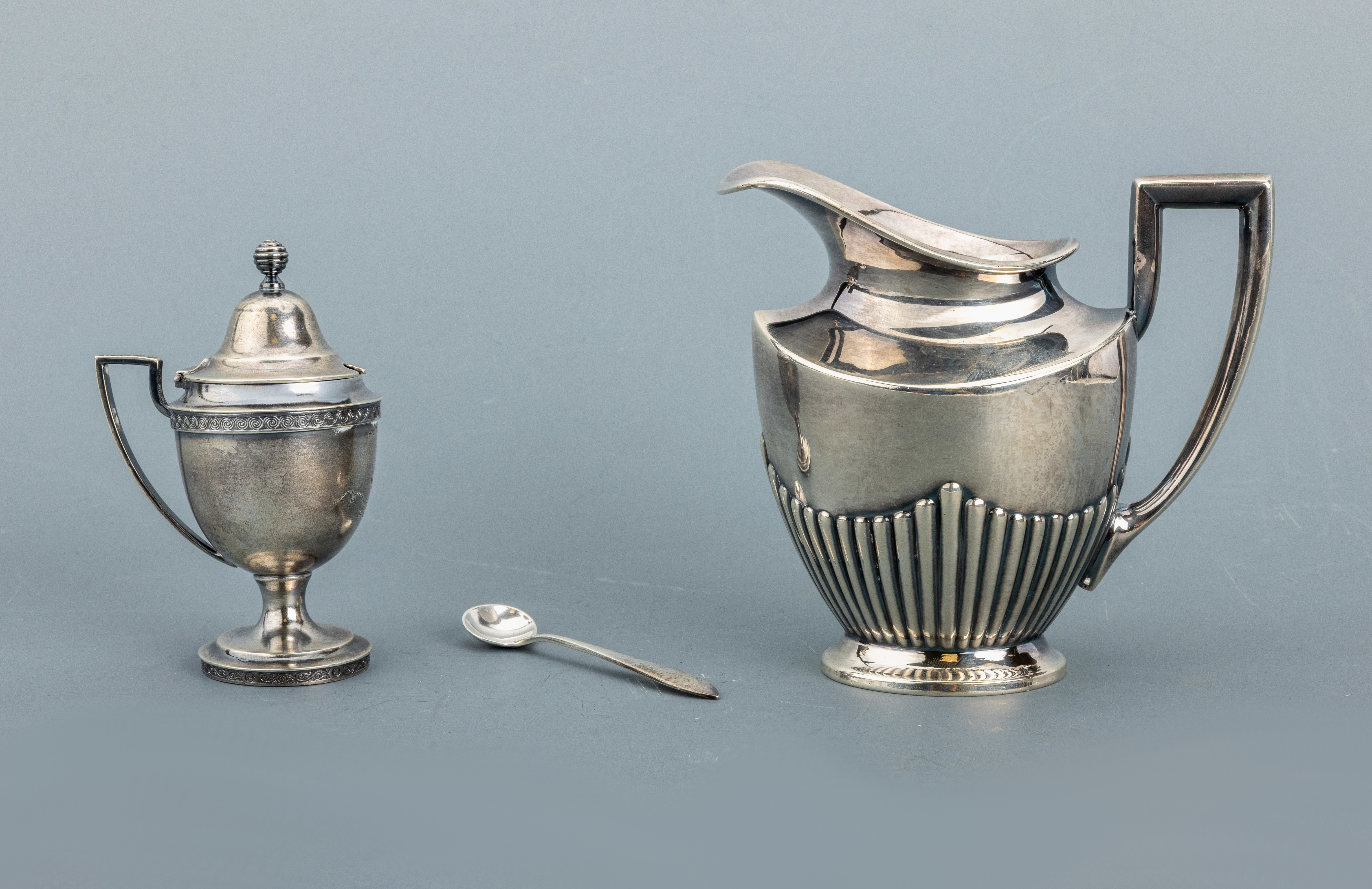 Sahnegießer, 925er Silber, deutsch, bauchige Form mit geripptem Unterteil, weiter Ausguss, geometrischer Henkel, H. ca. 11 cm, ca. 200.6 g, Hersteller Gebrüder Kühn, dazu 1 Senftöpfchen, um 1900, innen verg., klassizistische Form mit seitl. grav. Blüten und Blättern, geometrischer Henkel, leicht verbogen, H. ca. 10 cm, Löffel, 925er Silber, sek., ca. 81.7 g, Gebr.-Spuren