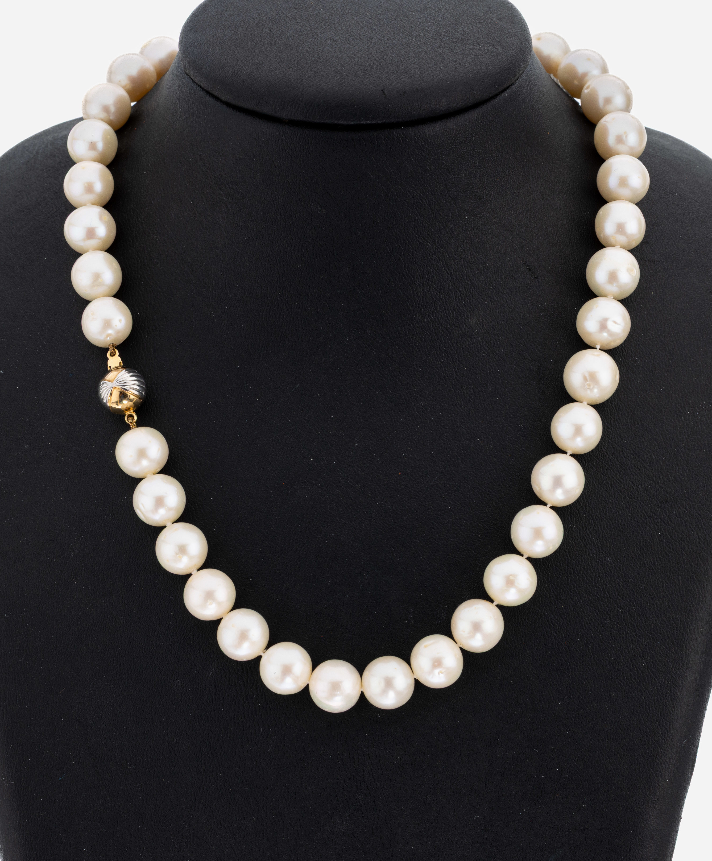 Zuchtperl-Collier mit 18 kt Gold Schließe, GG/WG 750/000, 38 unrunde Süßwasserzuchtperlen, D. ca. 10.7 mm, L. ca. 44 cm, Kugelschließe