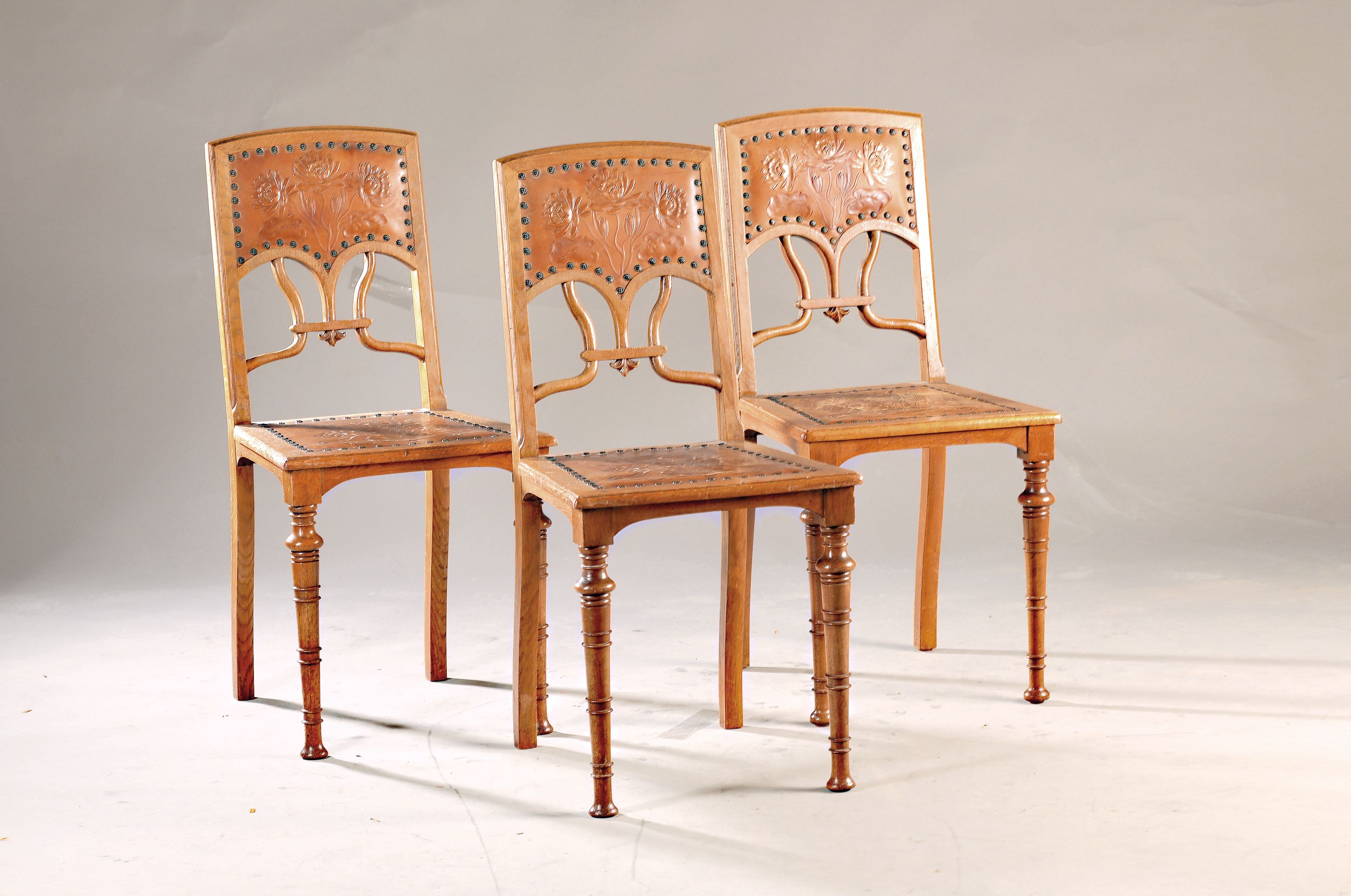 6 Jugendstilstühle, deutsch, um 1900, , Eiche massiv, floral geprägte Lederbezüge