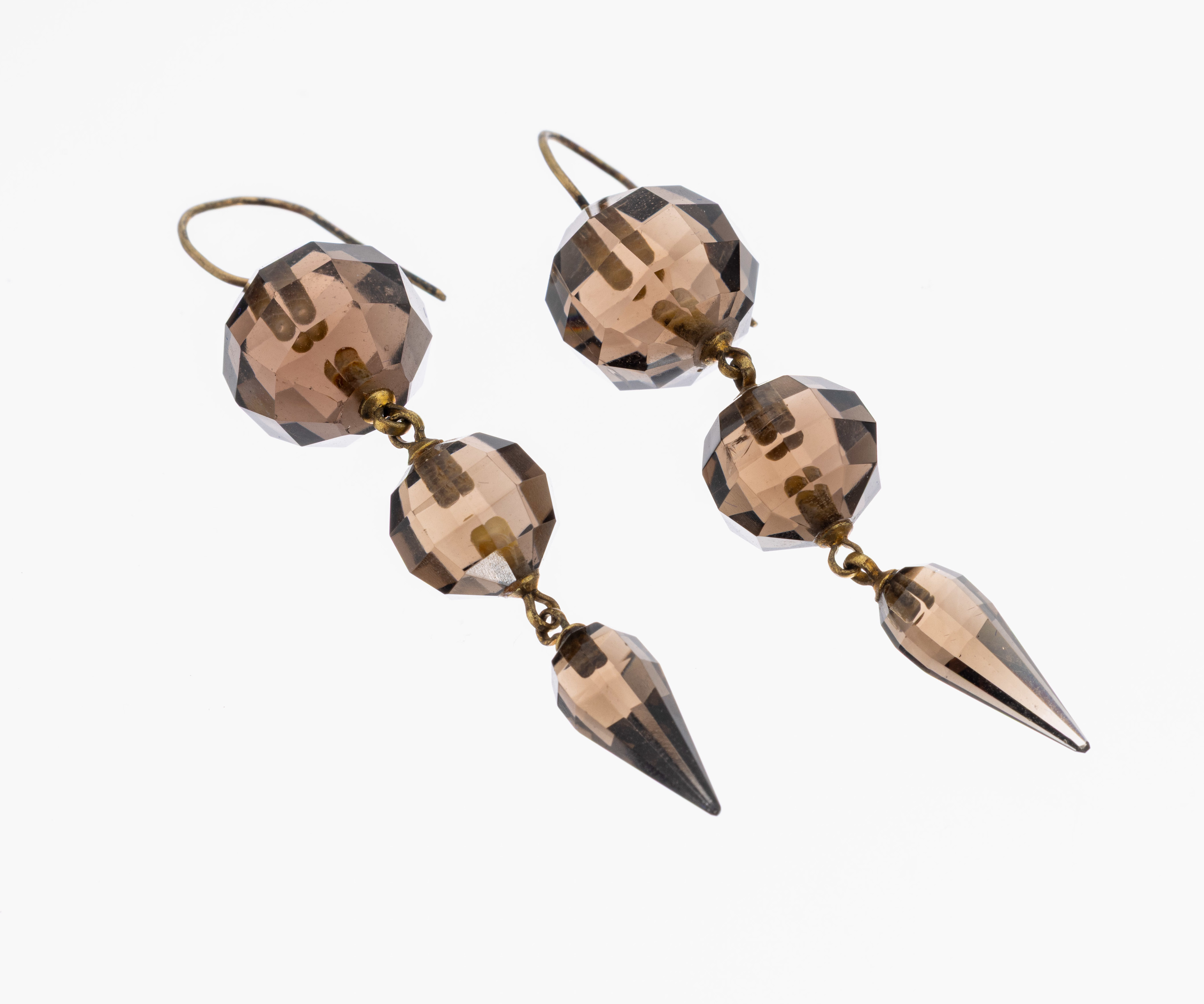 Paar Rauchquarz-Ohrhänger, Idar-Oberstein um 1880-1900, Metall verg., bewegl. Abhängung mit facett. Rauchquarzen in versch. Formen, L.ca. 5.5 cm