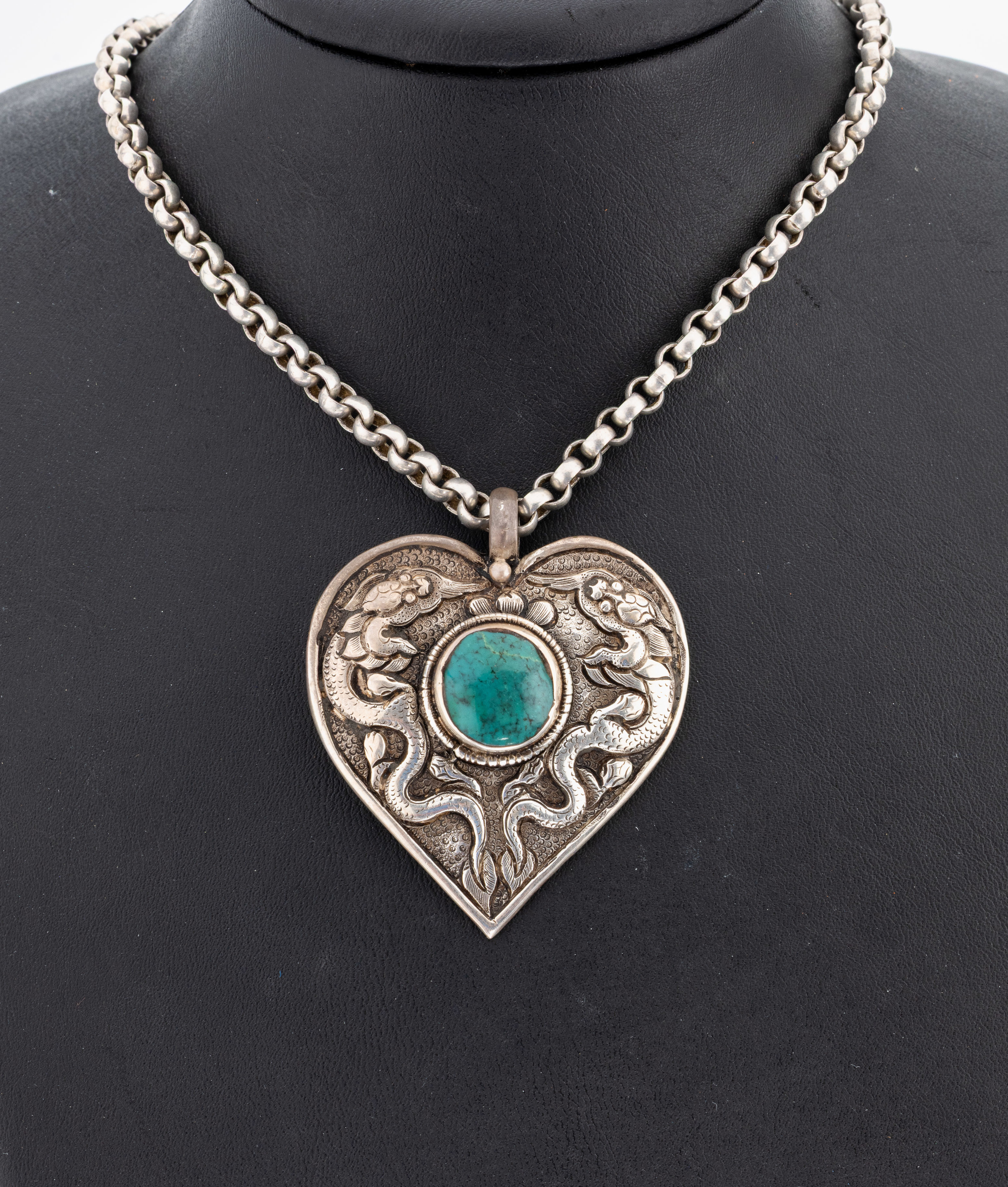 Türkis-Anhänger, China 1950er-60er Jahre, Silber gepr., Herz, mit 2 Drachen, mittig