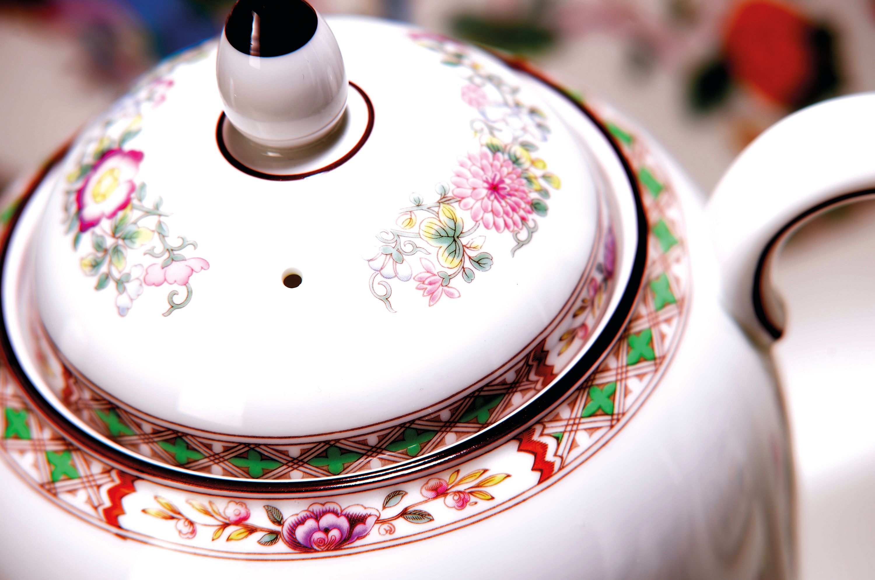 Speiseservice, Wedgwood, England, Dekor Kutani Crane, Porzellan, Umdruckdekor, 10 Speiseteller, 10 Suppentassen mit 4 UT, 4 Beilagenschüsseln D. 20cm, Sauciere, Schüssel (Deckel besch.), 15 Kuchenteller, 2 ovale Platten (berieben), Kaffeekanne (Ausguß best.), 2 Zuckerdosen, 2 Milchkännchen, 2 Gebäckschalen, 6 Kaffeetassen mit 9 UT, 1 Mokkatasse mit UT, Gebrauchsspuren