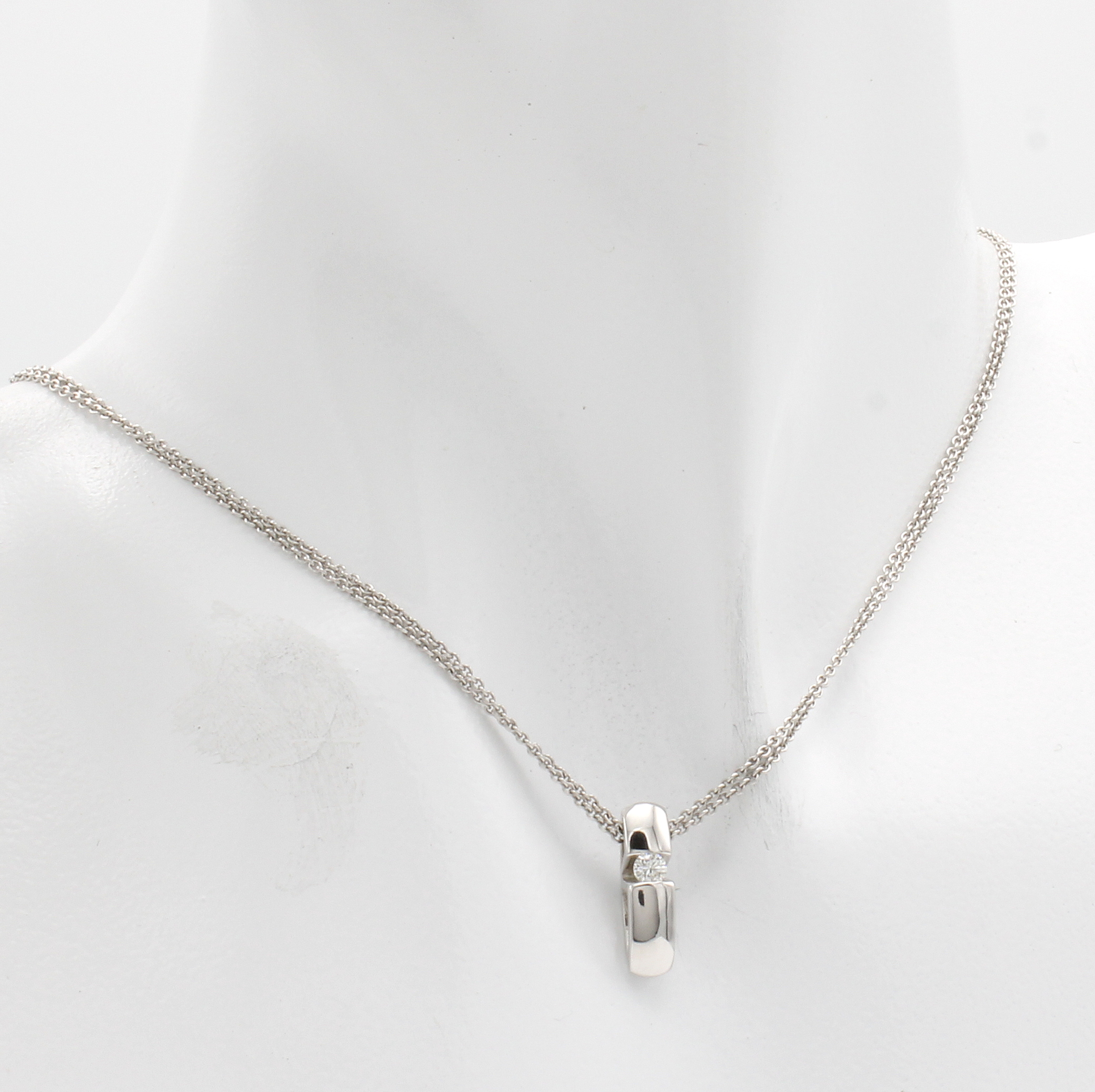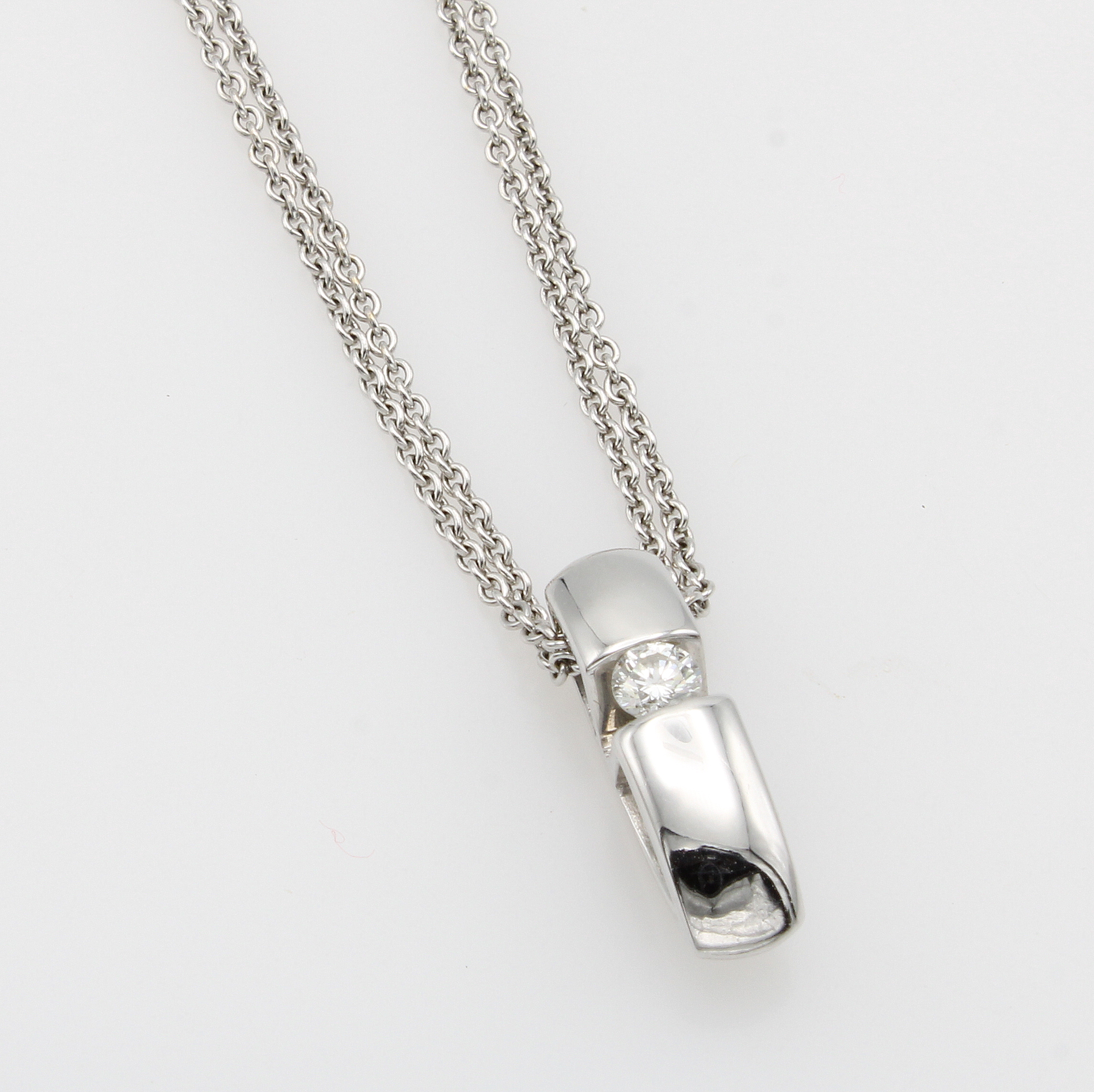 Anhänger mit Brillant an Kette, WG 750/000, Brill. ca. 0.10 ct Weiß/si, anged. Stabform, 2 rhg. Kette, L. ca. 43 cm Schätzpreis: 2510, - EUR