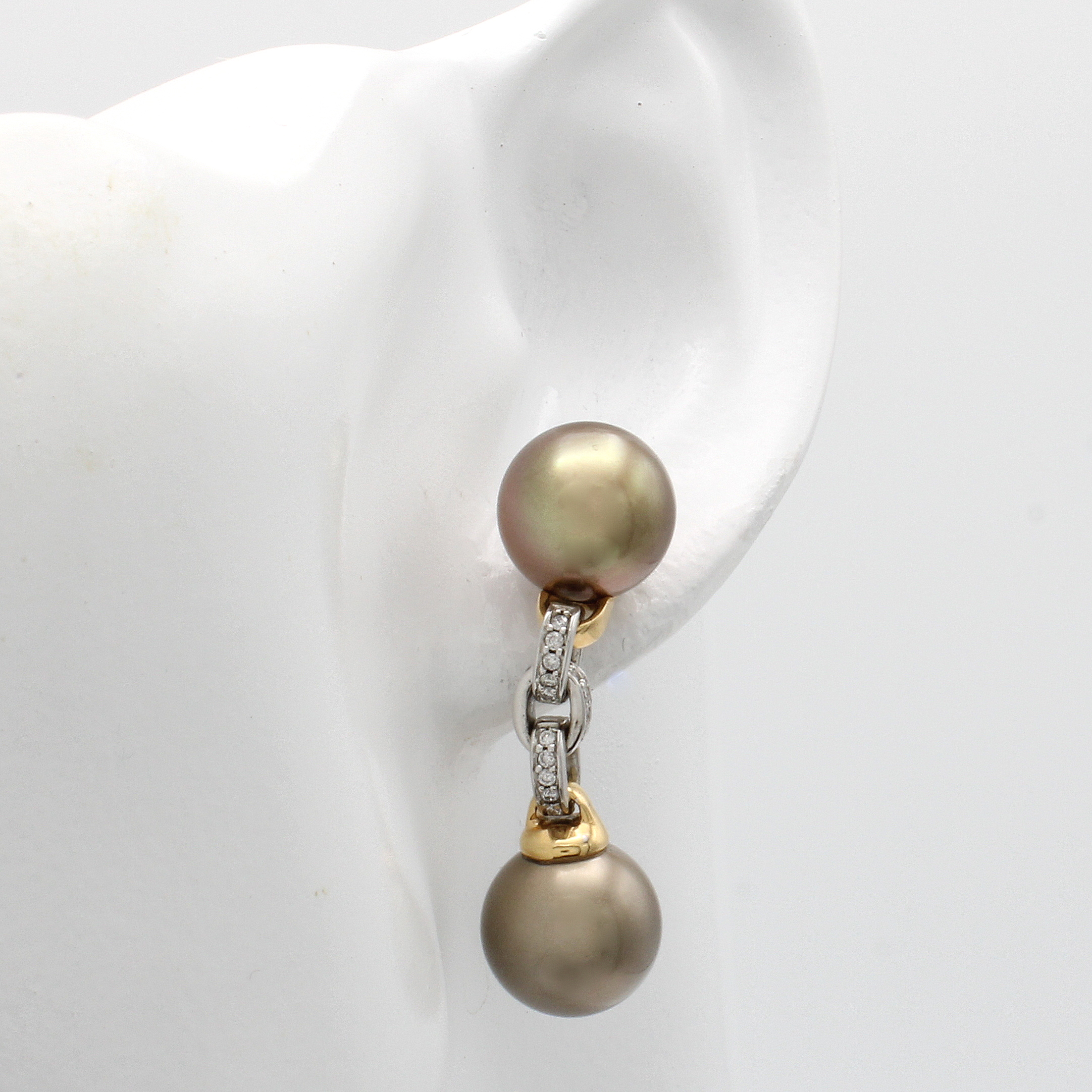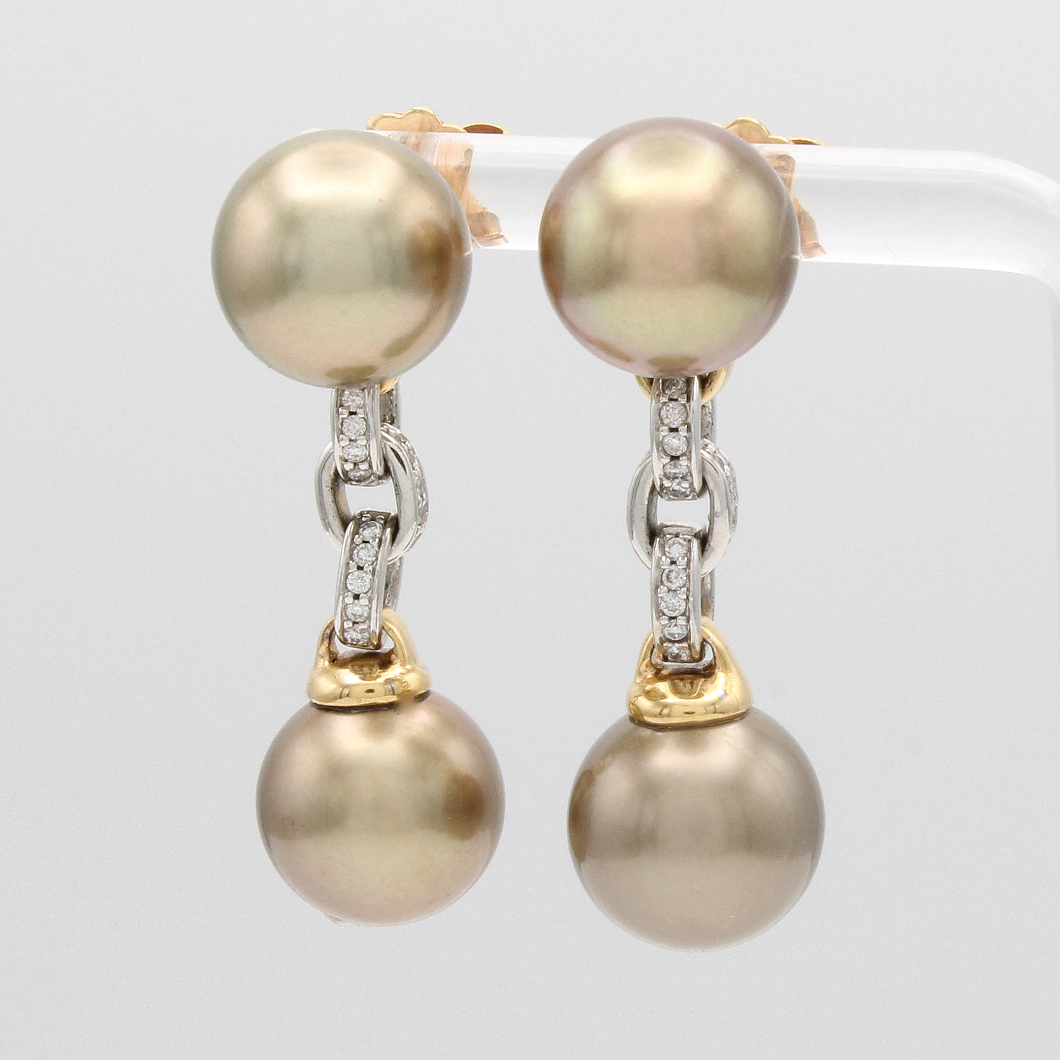 Paar Ohrgehänge mit Tahitizuchtperlen und Brillanten, RG/WG 750/000, 40 Brill. zus. ca. 0.20 ct feines Weiß/vs, 4 braune Perlen (gef.) D. ca. 11 mm Schätzpreis: 6960, - EUR