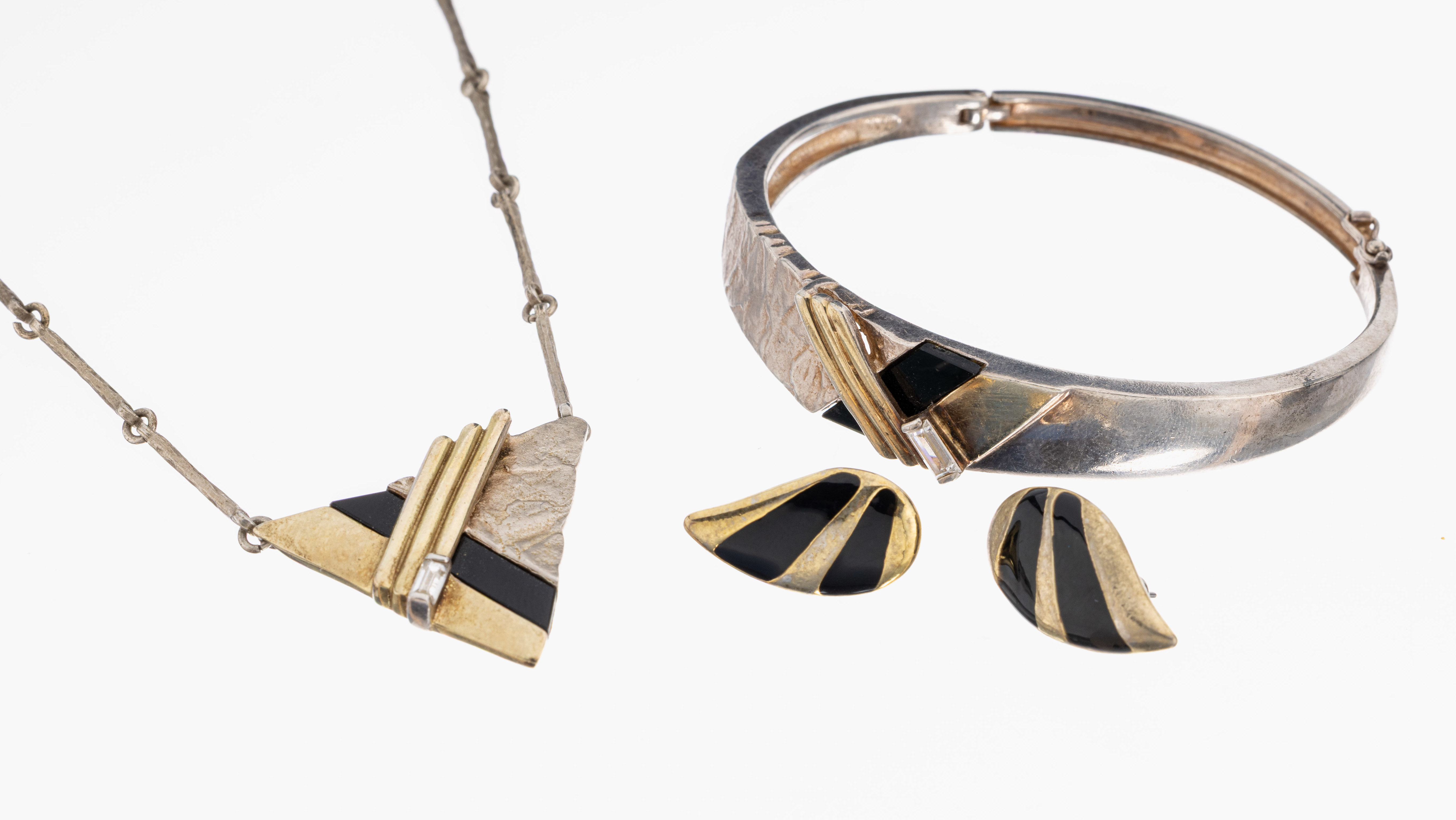 Design Schmuckset, 925er Silber, part. verg., best. aus: 1 Armreif, ca. 6 x 5.4 cm,