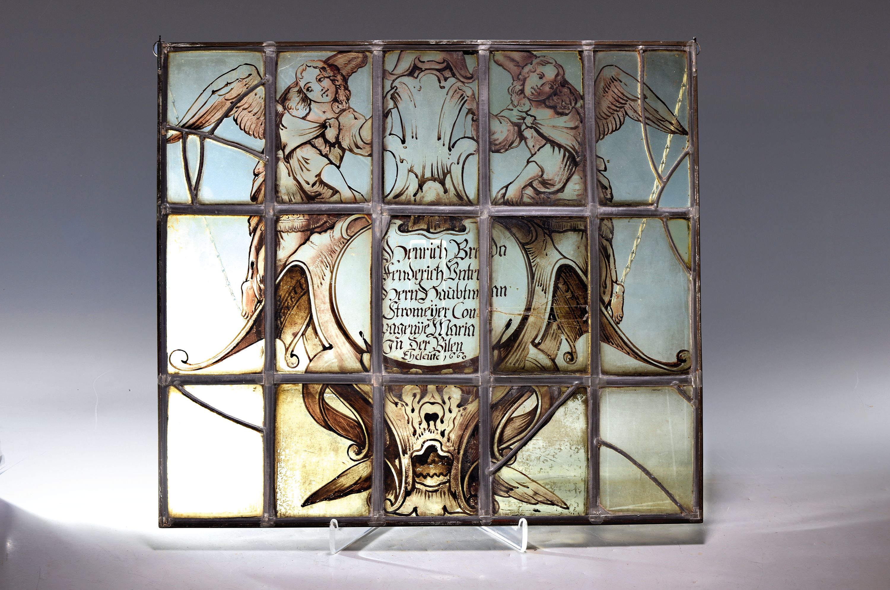 Barocke Bleiverglasung/sog. Hochzeitsscheibe, deutsch, Namenskartusche und datiert