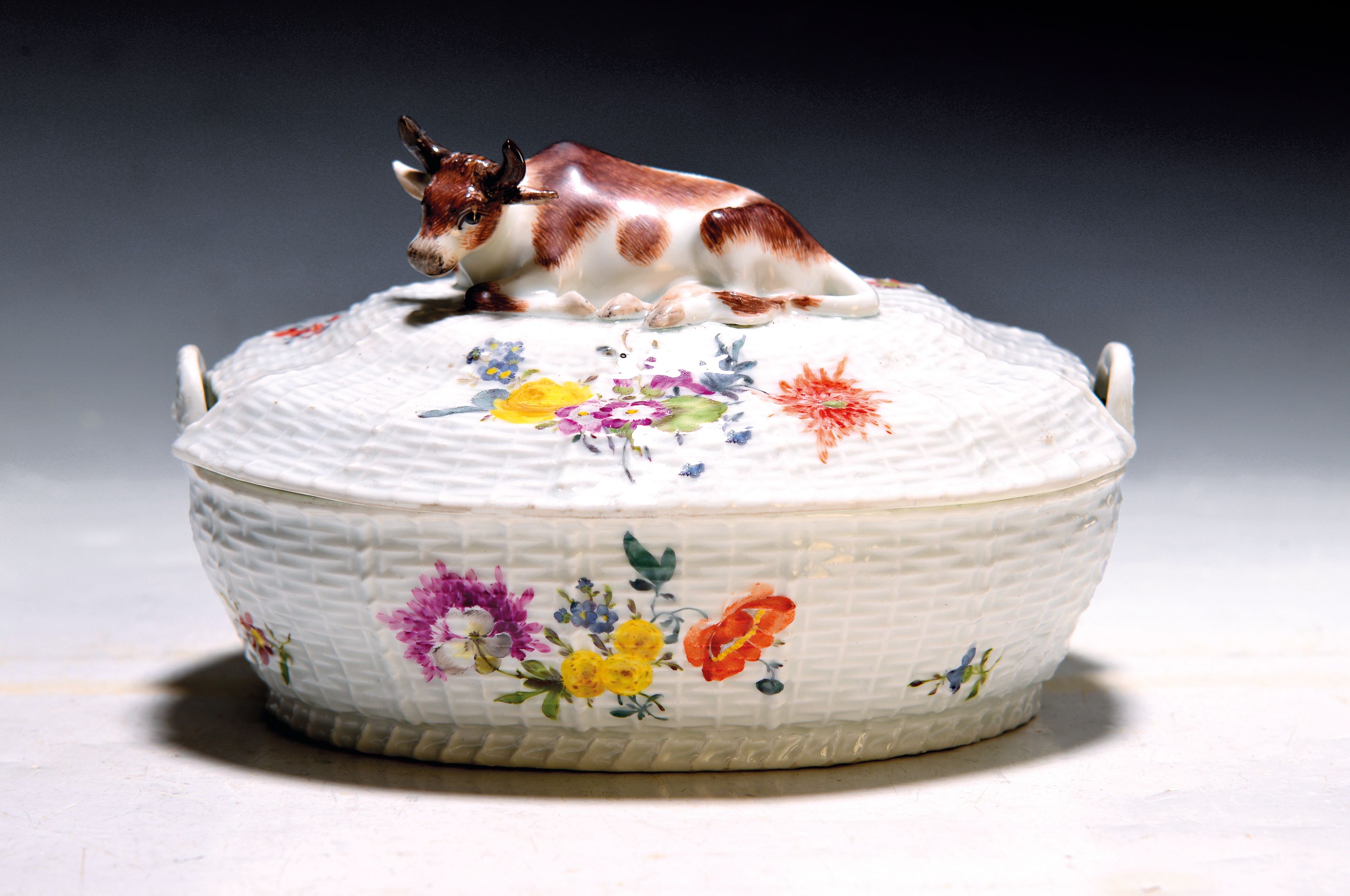 Frühe Butterdose mit Kuhbekrönung, Meissen, um 1750, Ozier, Korbrelief, Deckel