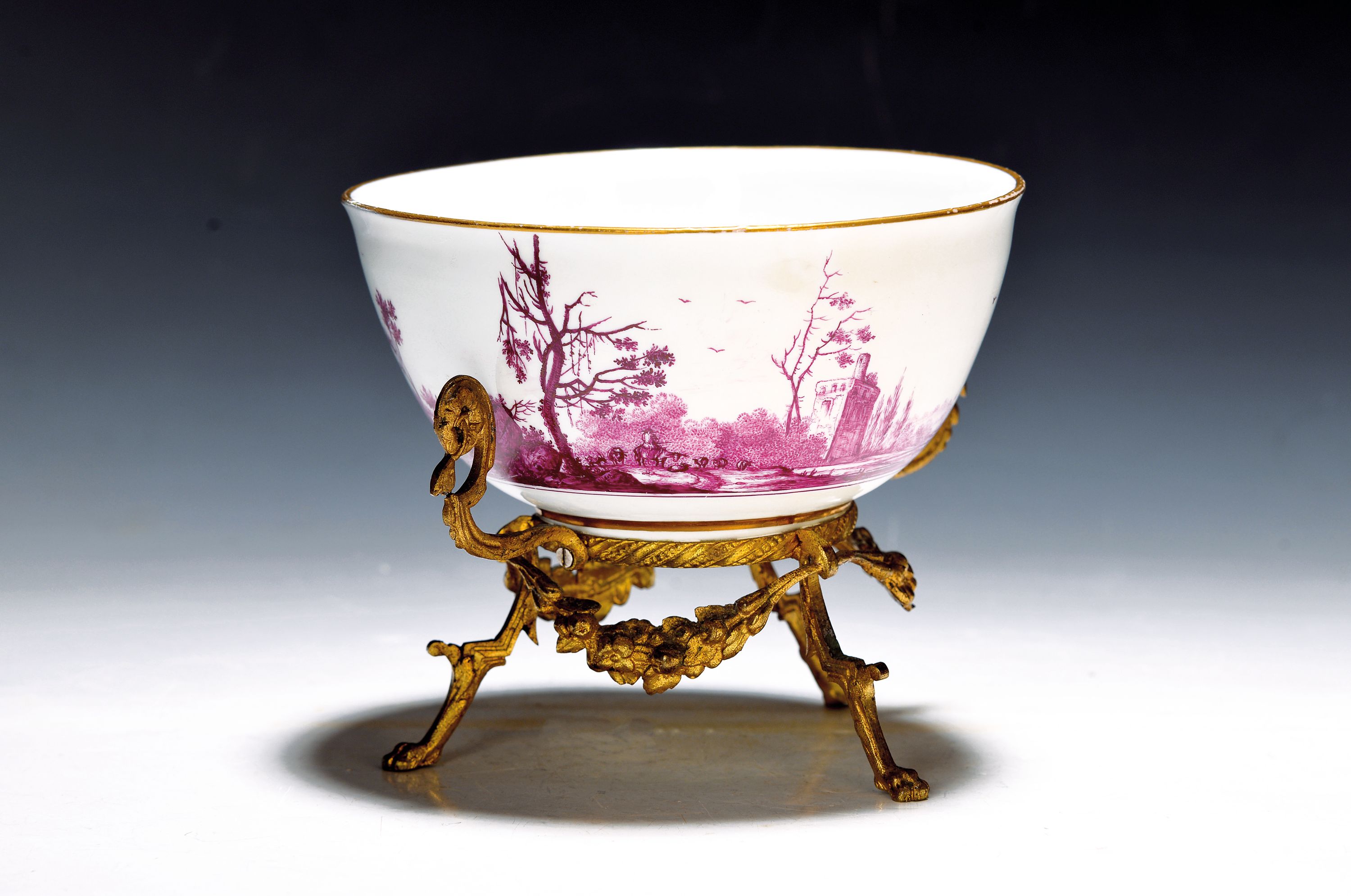 Prunkschale/Kumme mit Bronzemontur, Meissen, um 1745/50, feine monochrome Purpurmalerei,