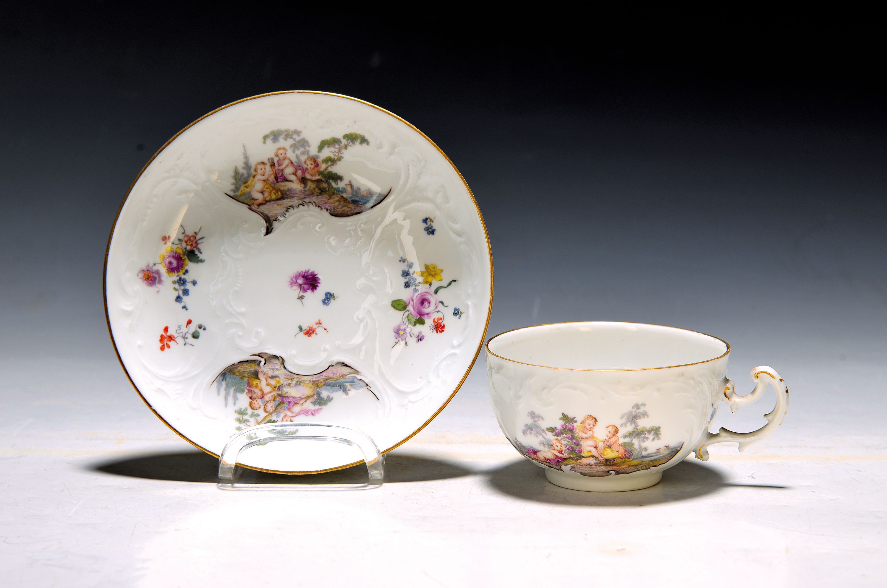 Tasse mit Untertasse, um 1750, feine Miniaturbemalung in Reliefkartuschen, spielende