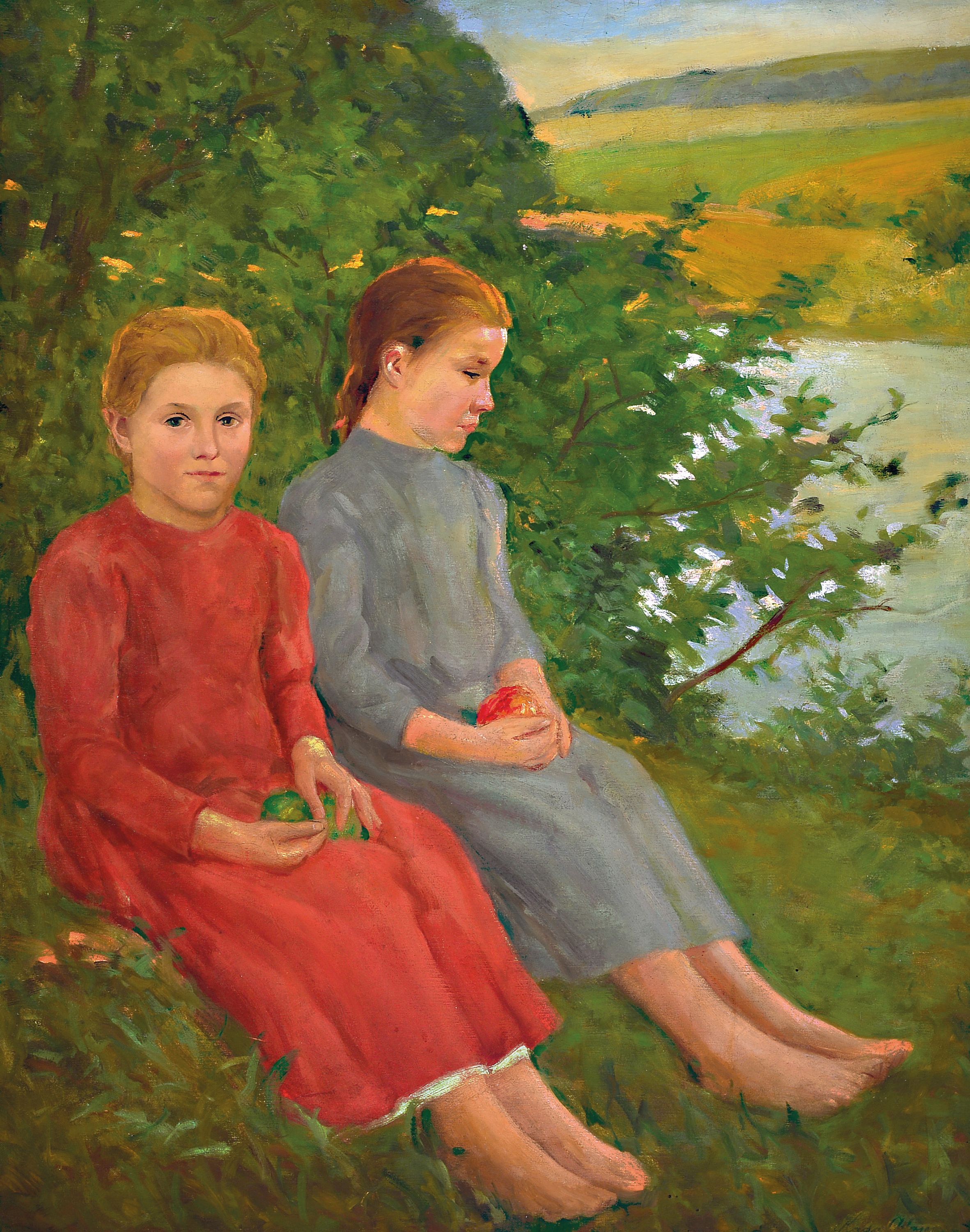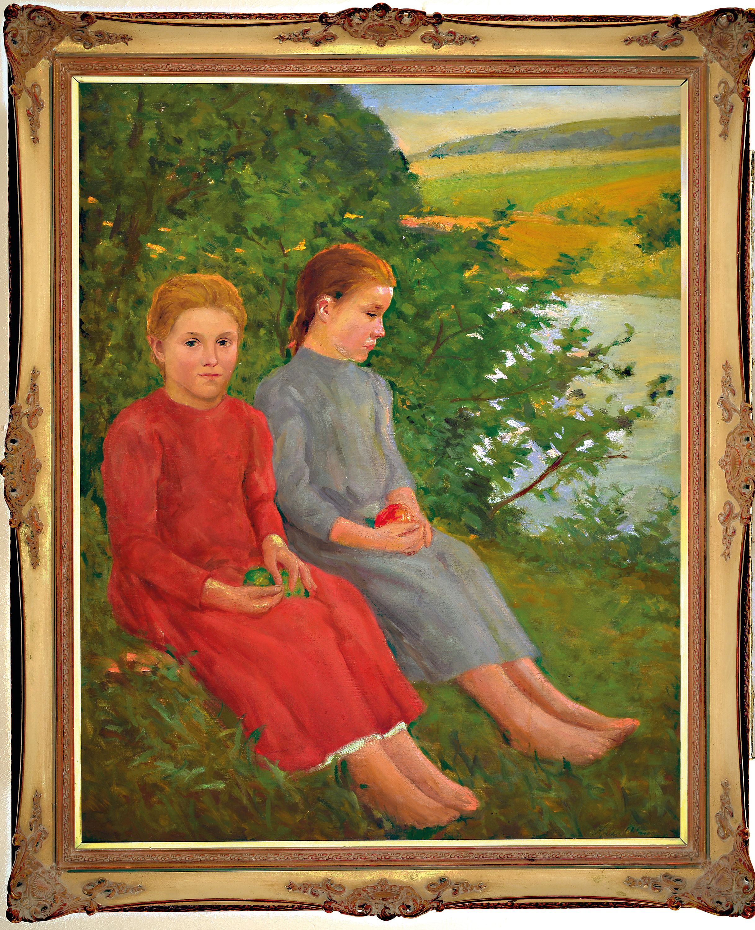Alajos Kada, ungarischer Maler, geb. 1882, Porträt zweier Schwestern in Landschaft