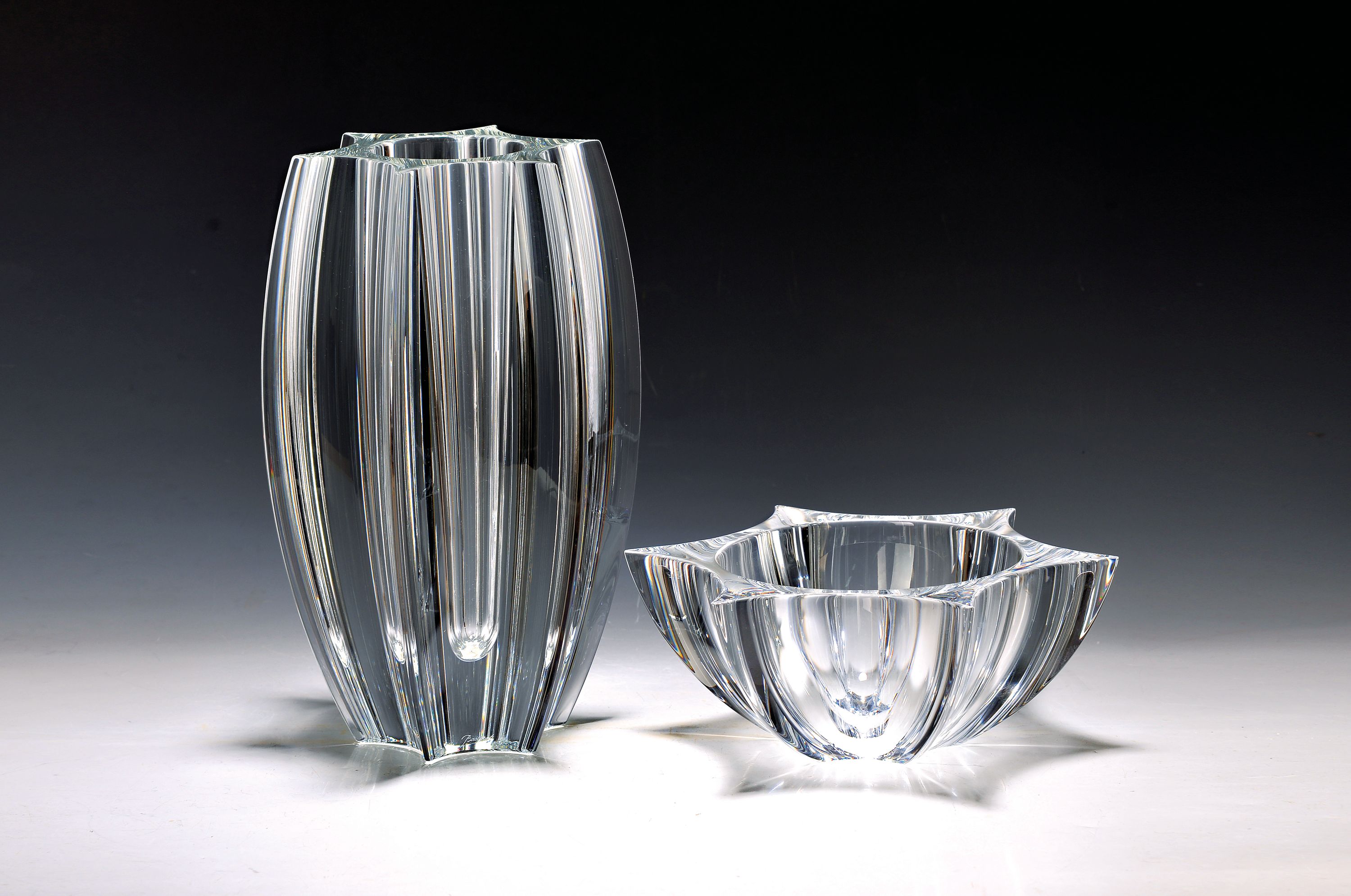 Vase und Schale "Carambole", Baccarat, dickwandiges Kristallglas in Sternform, beide