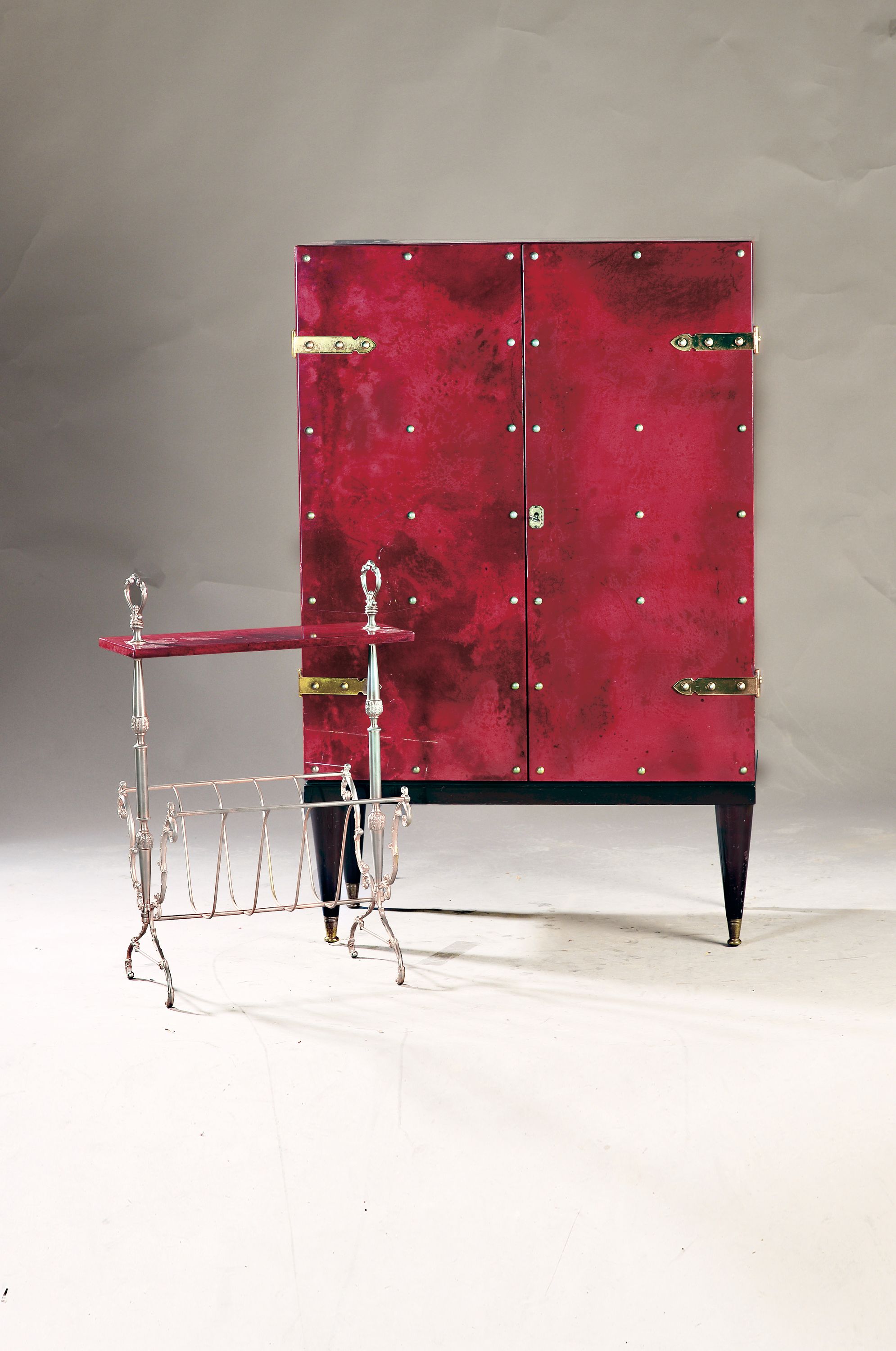 Barschrank und Zeitungsständer, von Aldo Tura, Italien, 60er Jahre, aus rotem Ziegenleder