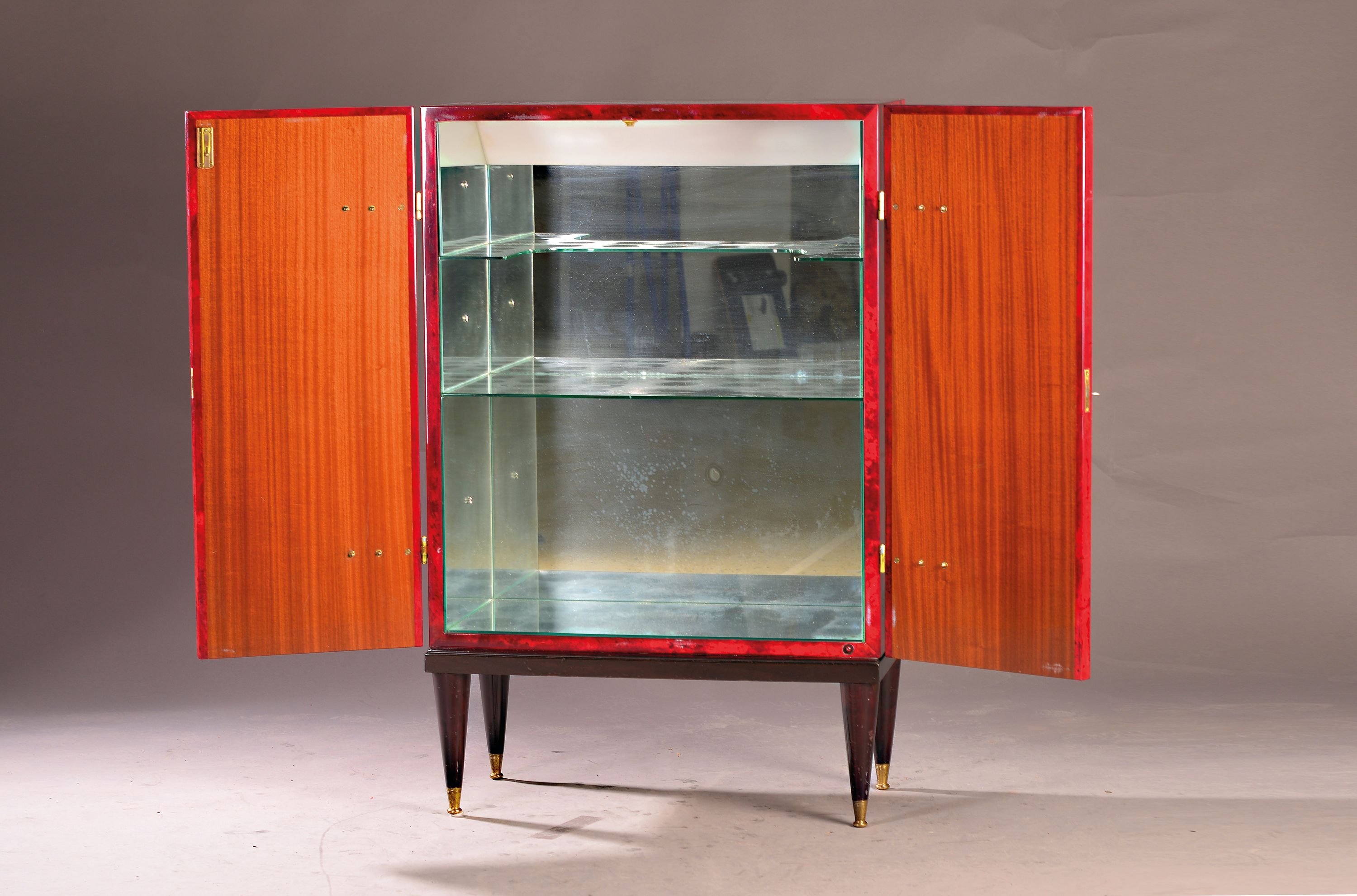 lackiert, zweitürig, innen verspiegelt und mit 2 Glasböden, kräftige Messingleisten,