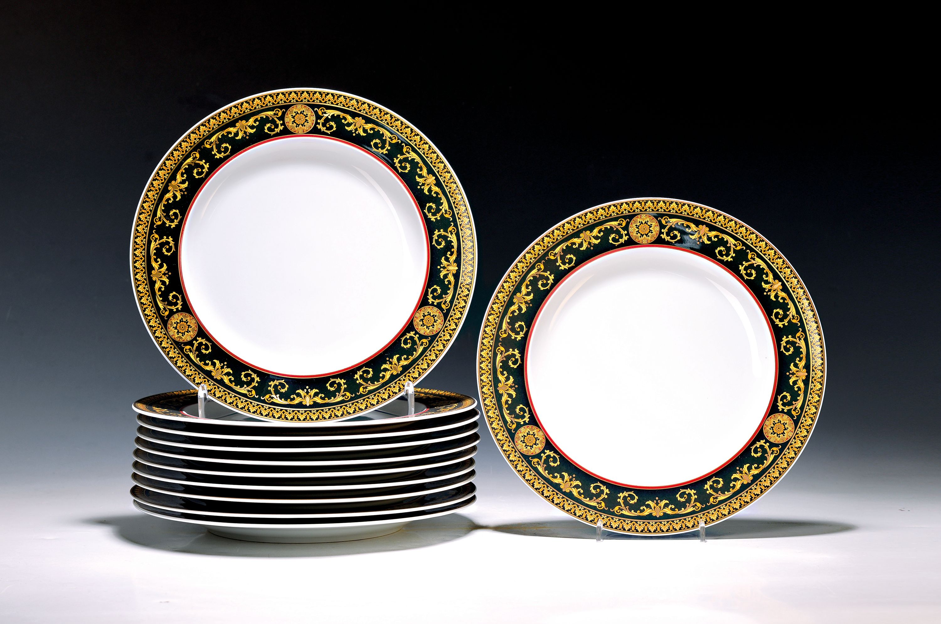 11 flache Speiseteller, Rosenthal, Dekor Medusa, Entwurf Gianni Versace, D. ca. 27.5