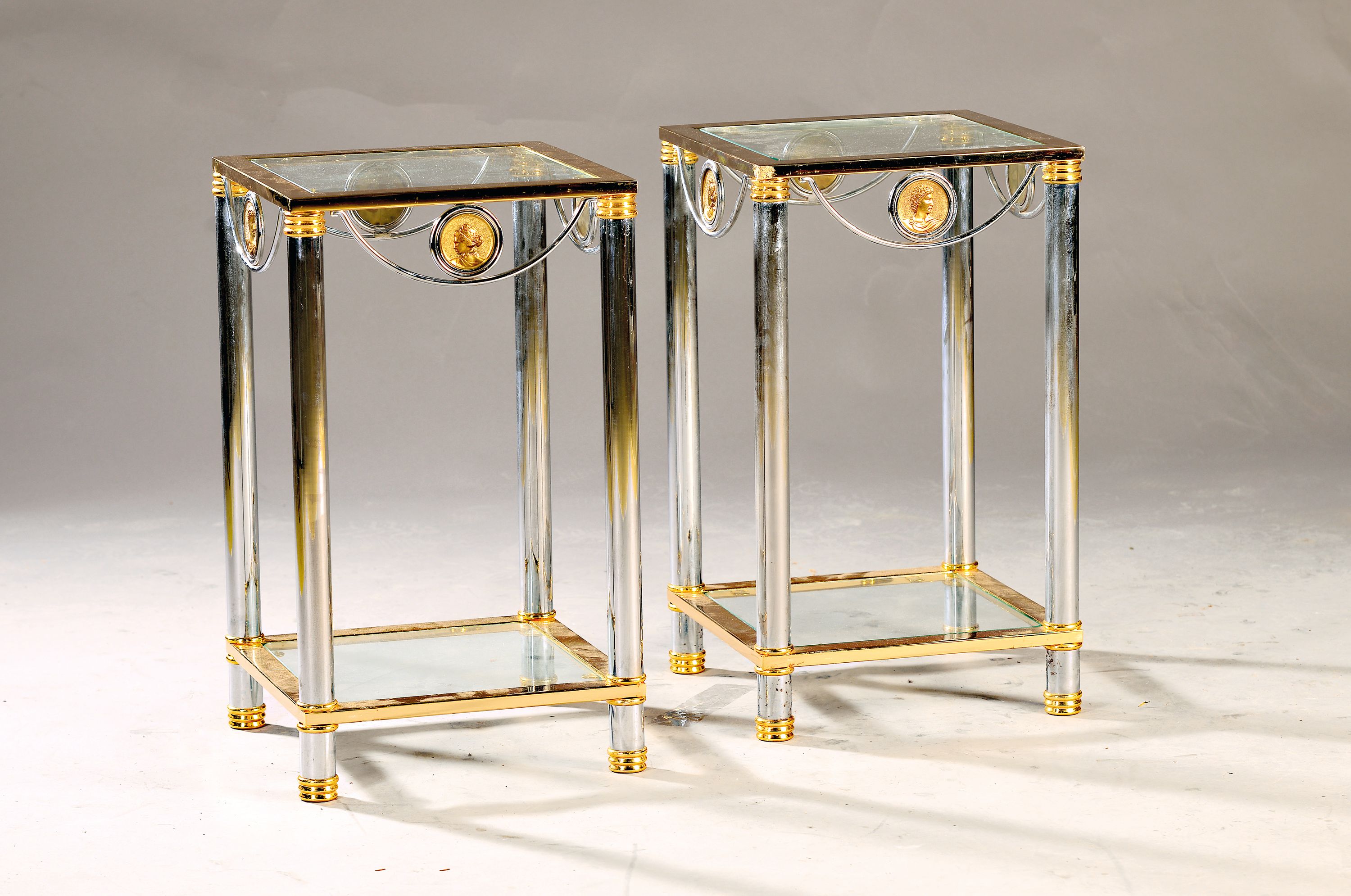Paar Beistelltische, neuzeitlich, Stahlrohr mit Messingapplikationen und Medaillons