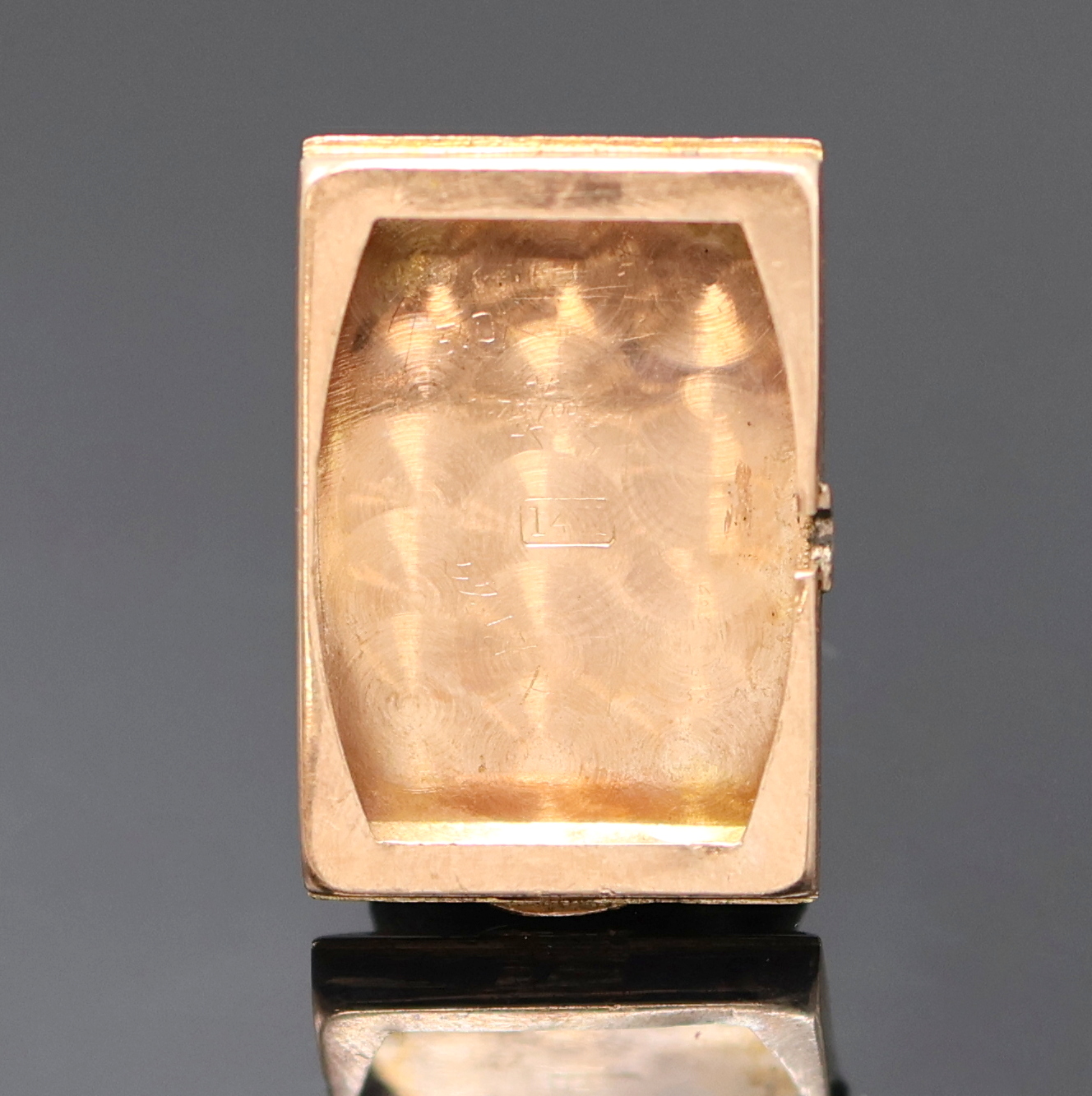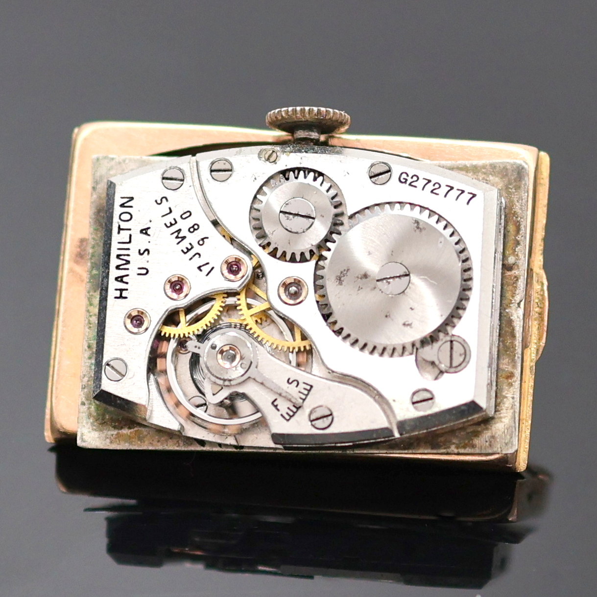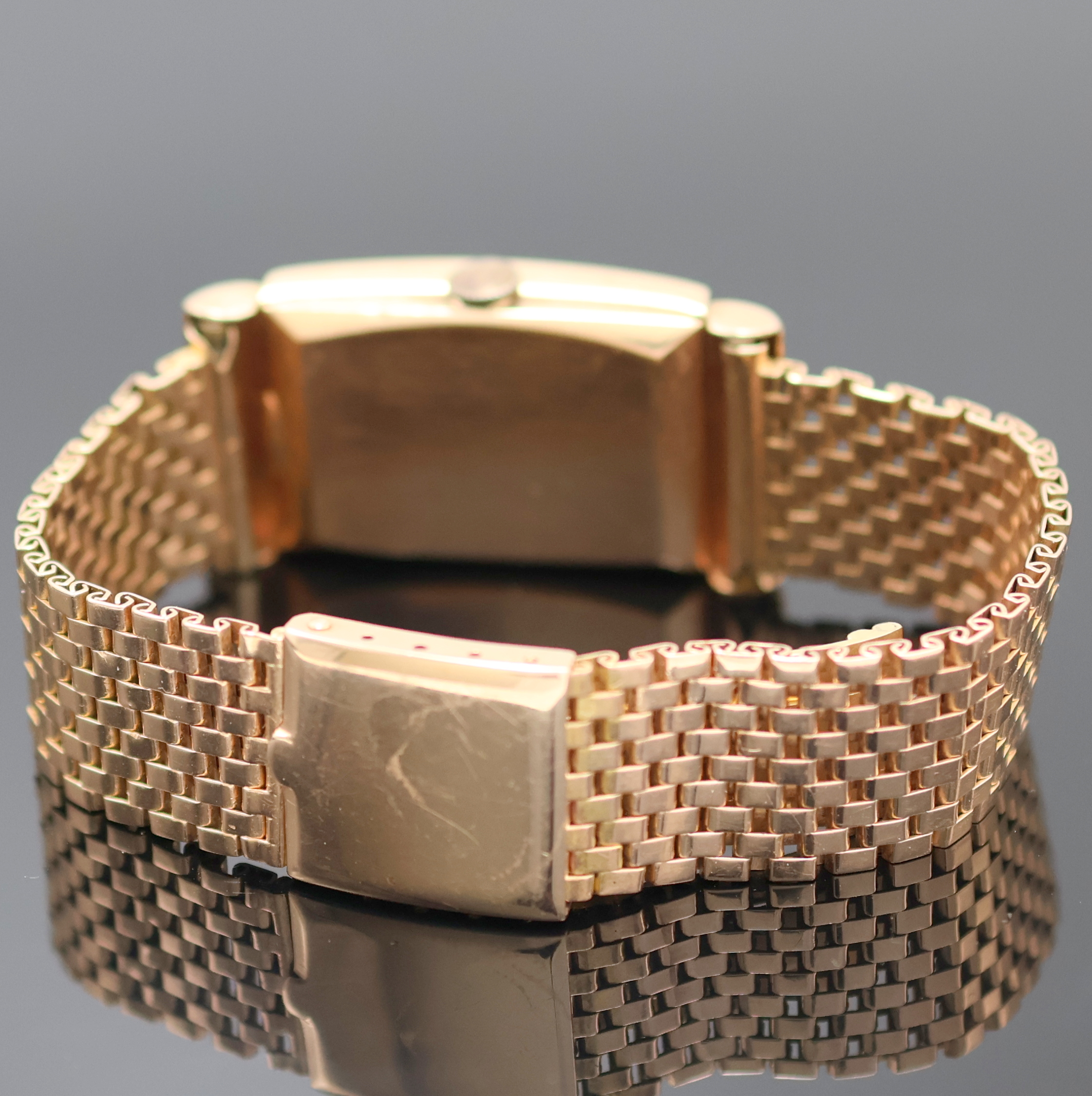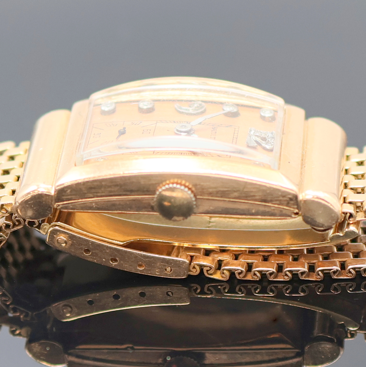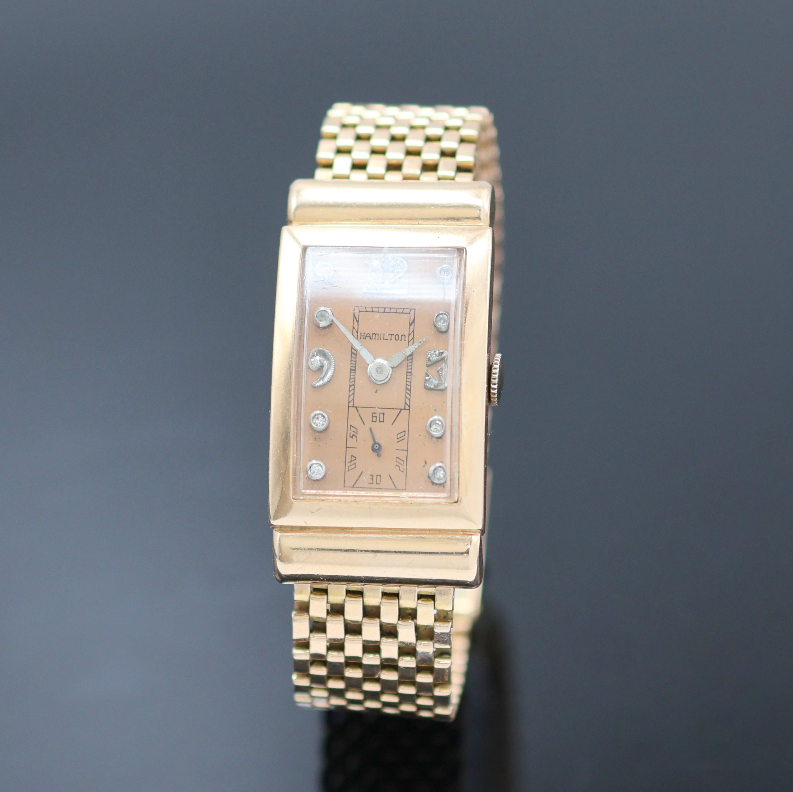 HAMILTON ausgefallene Schmuckbanduhr in RG 585/000, USA um 1938, Handaufzug, ausgef., unsign. Goldgeh. inkl. unsign. RG 585/000 Band, verd. Bandanst., Boden aufgedr., kupferfarb. Zifferblatt m. aufges. Diamantindizes, altersbed. starke Nutzsp., Formankerw., Kal. 980, 17 St., gepr. Chatons, Schr.-Unr., Breg.-Spir., Geh. M. ca. 40 x 21 mm, L. ca. 17,5 cm, EZ 2-3, Gew. ca. 50g, aus Sammlungsauflösung