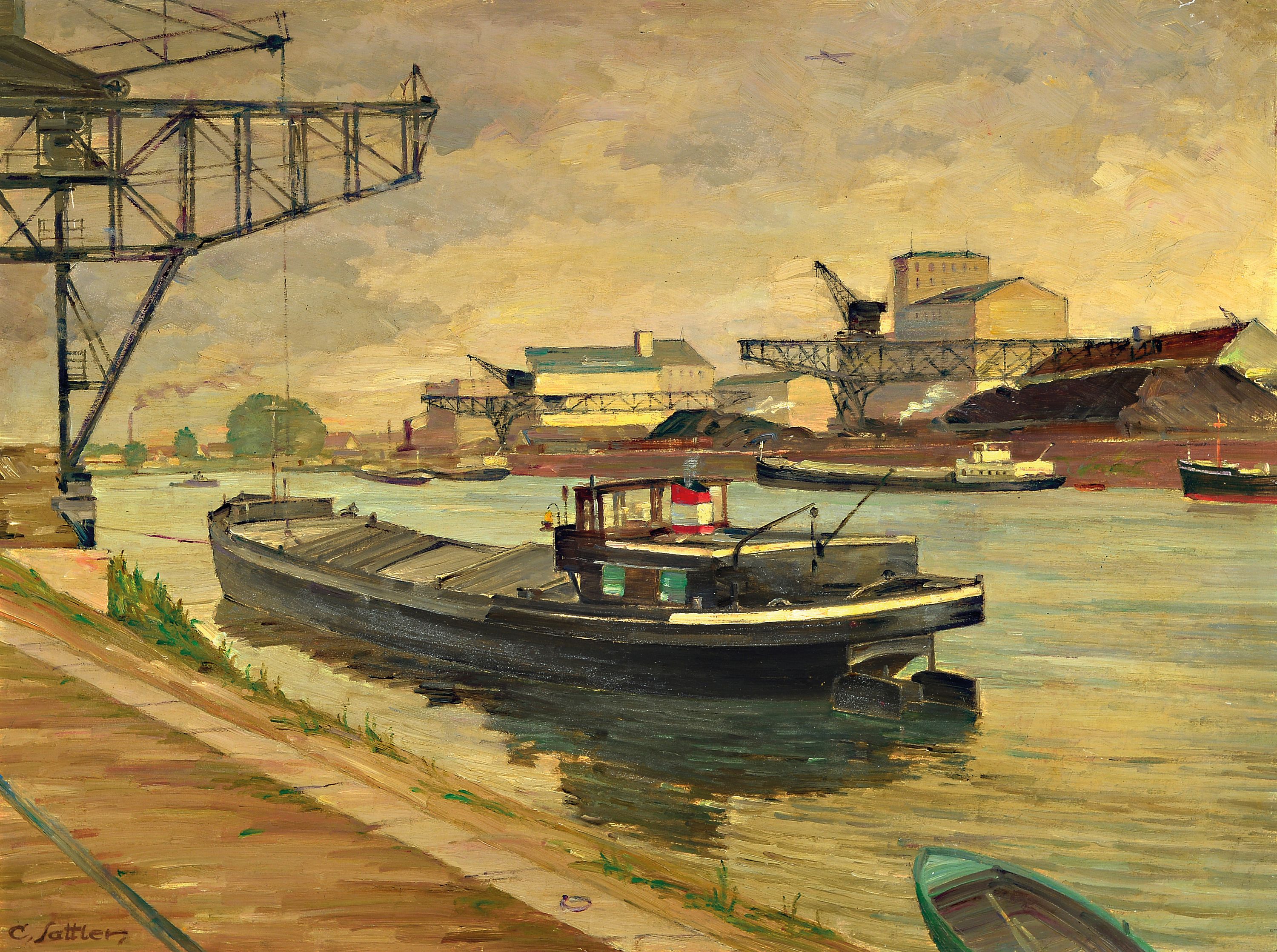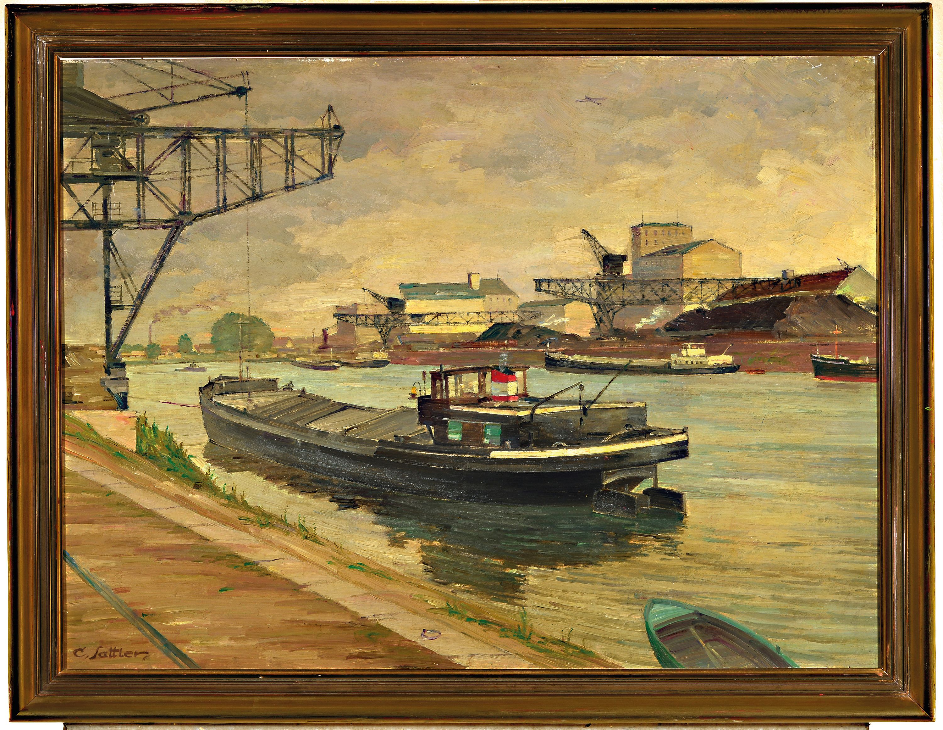 C. Sattler, Künstler der Mitte des 20.Jh., "Rheinhafen karlsruhe" so verso auf altem