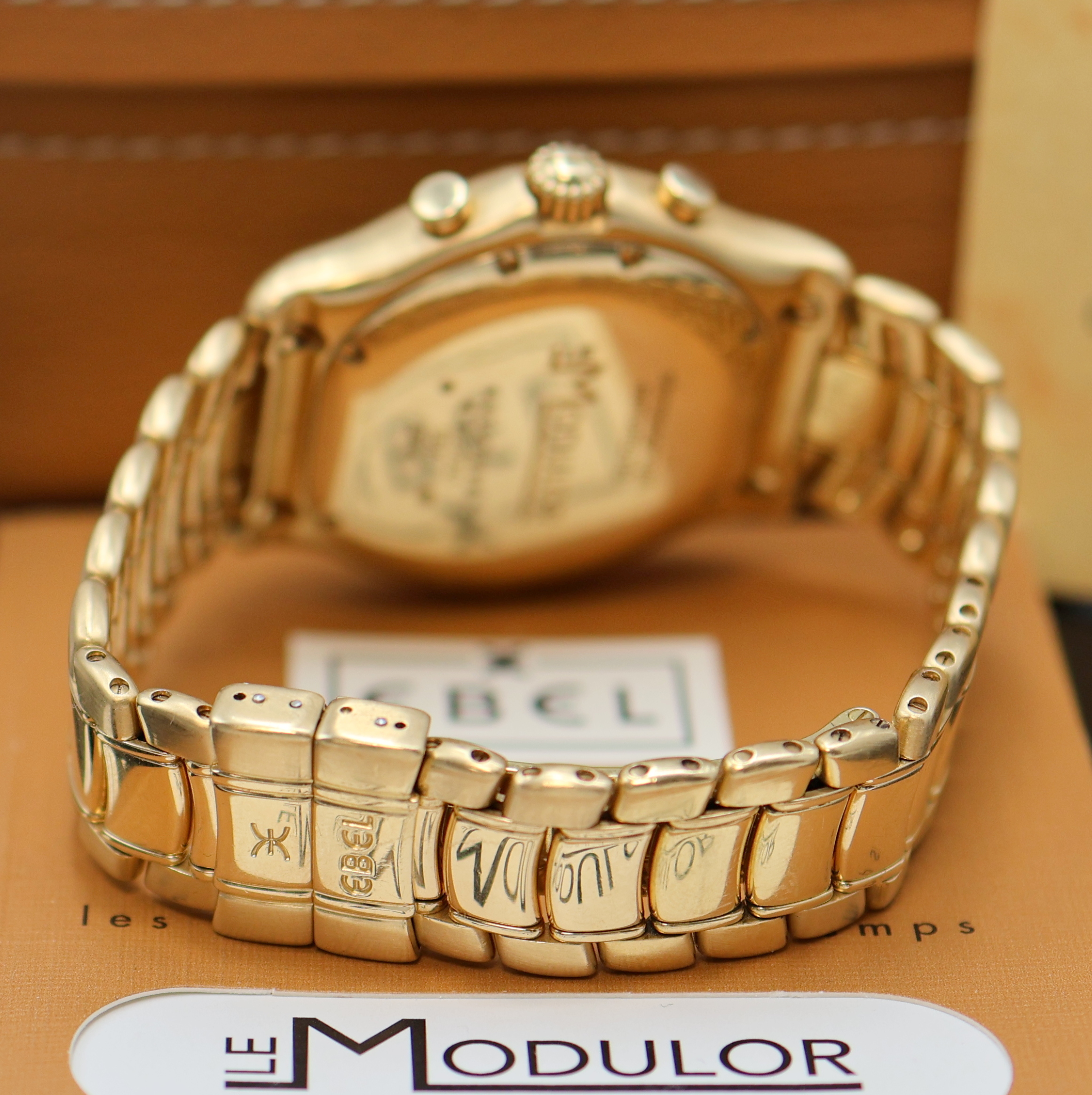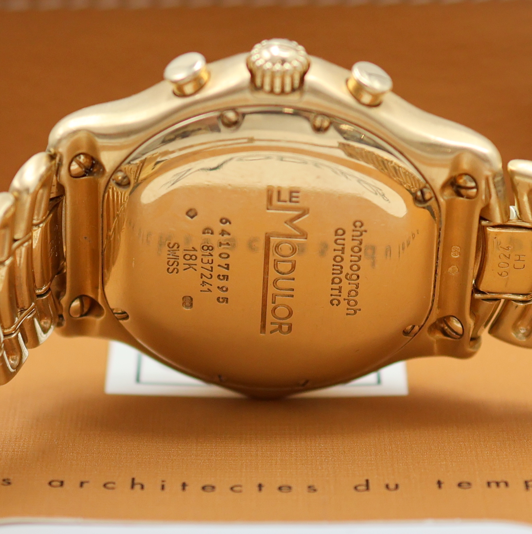 EBEL Armbandchronograph Le Modulor Referenz 8137241, Schweiz verk. lt. Pap. 09/2003, Automatik, Chronometer in massiv GG 750/000 inkl. Gliederband m. Faltschl., Boden 8-fach verschr., 2-farb. Zifferbl. m. röm. Zahlen z. T. guill., Tachymeterskala, Anz. v. Std., Min., kl. Sek., Datum und Chronographenz., Kal. 135, 27 St., D. ca. 42 mm, L. ca. 19,5 cm, Gew. ca. 200g, orig. Etui (berieben) u. Pap. anbei, EZ 2