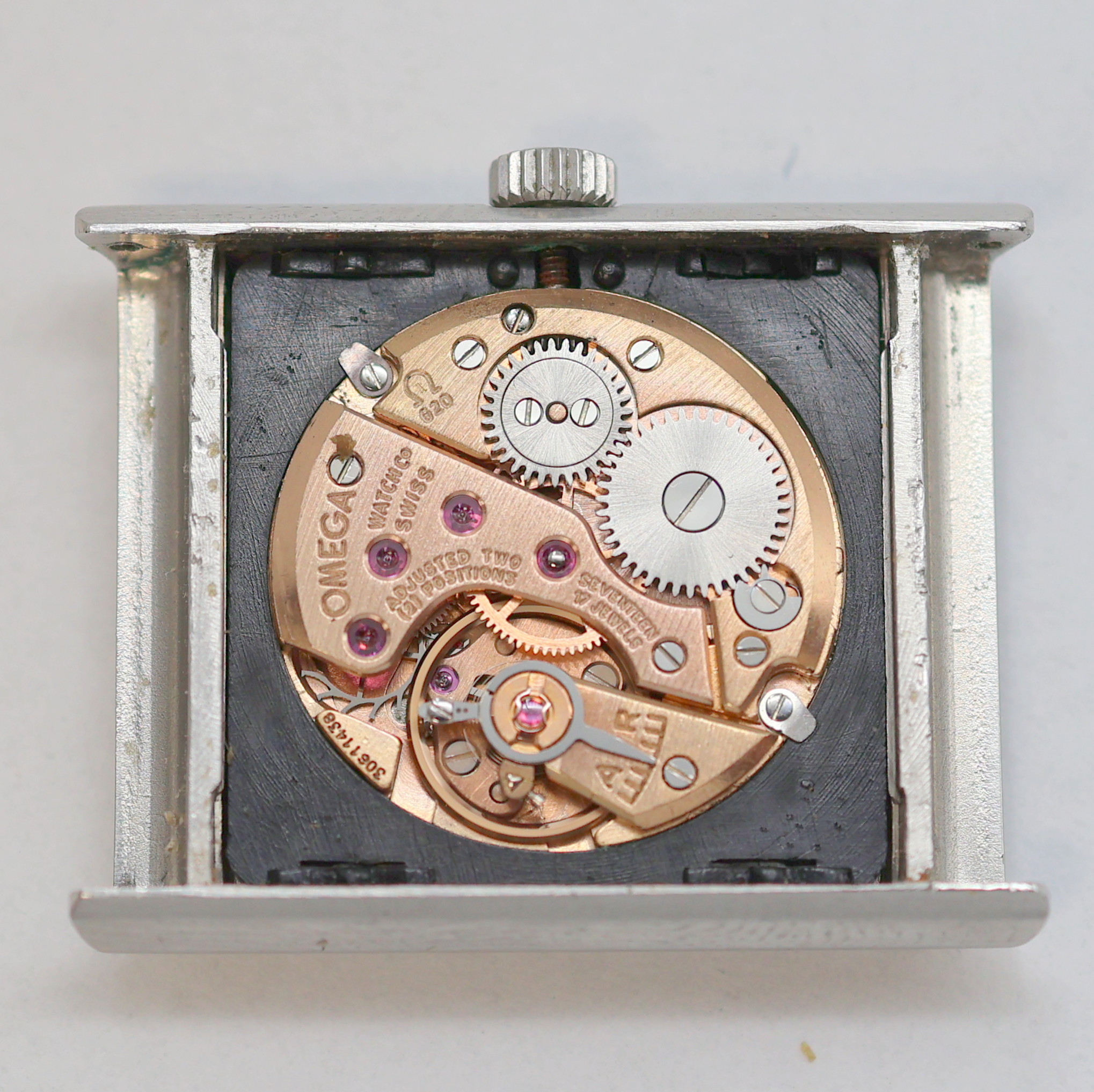 silb. Zifferbl. m. schw. Ind., schw. Zeiger, rotverg. Werk Kal. 620, 17 St., 2 Adj.,