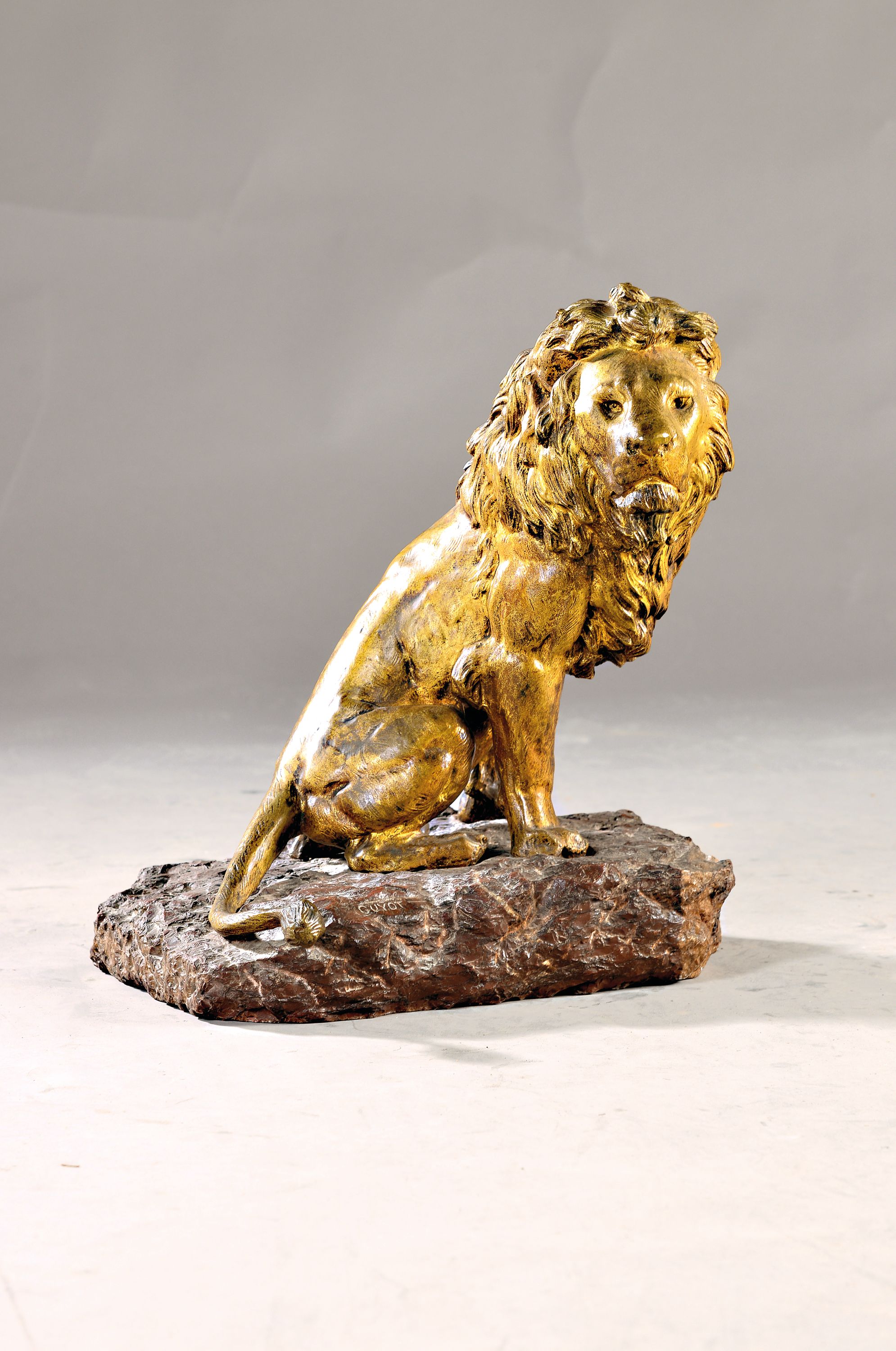 Löwe auf einem Fels, signiert, späterer Guß, H 50 cm