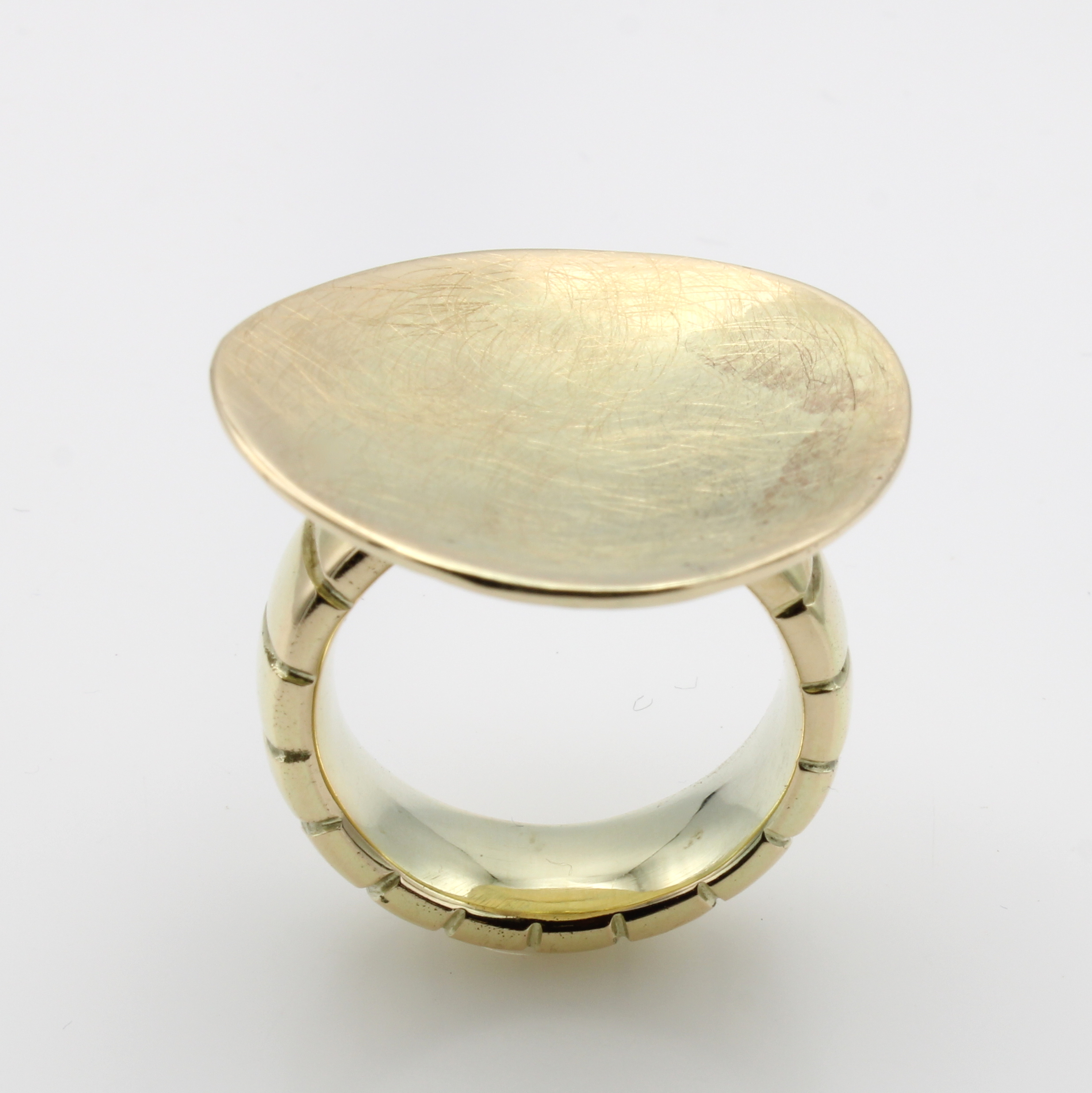Massiver ausgefallener Ring, GG 585/000, Ringkopf gebürstet, Ringschiene breit gerieft,ca. 30 g, RW ca. 62