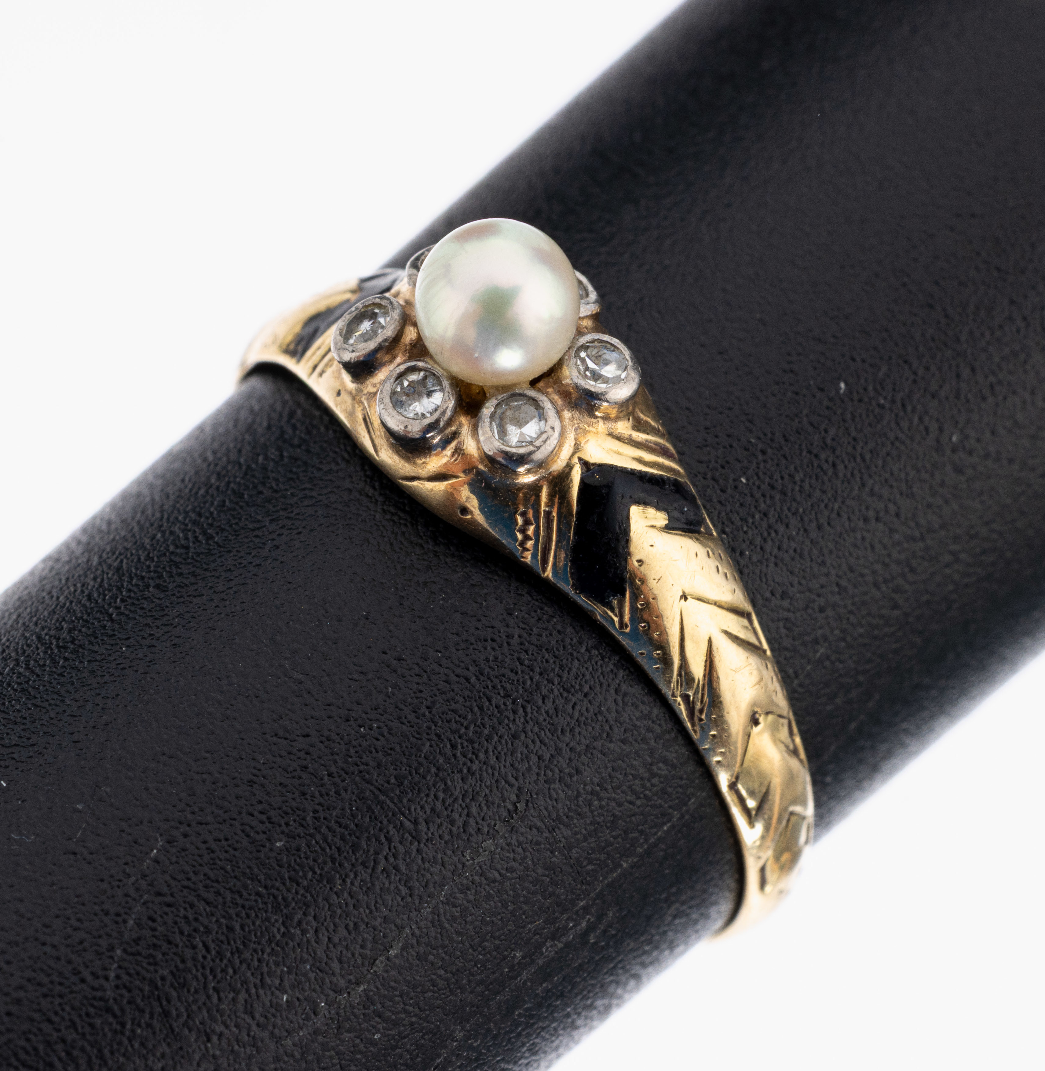 3.8 mm, umgeben von kl. 8/8-Diamanten, Ringschultern part. schwarz emailliert, min.