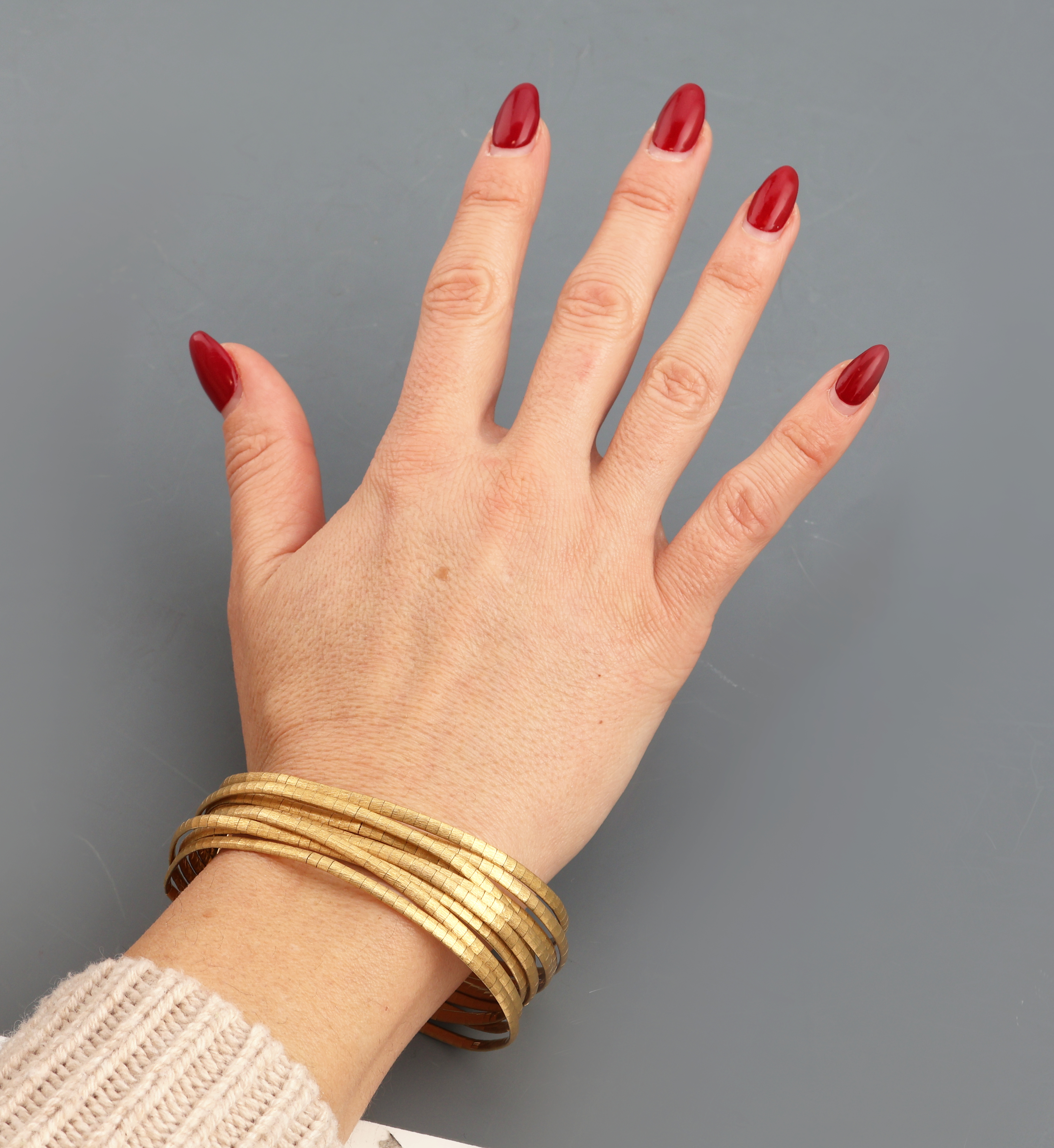 | Beschreibung | 18 kt gold bracelet , YG 750/000, satin finished, 9 rows, l. approx. 19.5 cm, case lock with 2 safety eights, approx. 58.0 g |