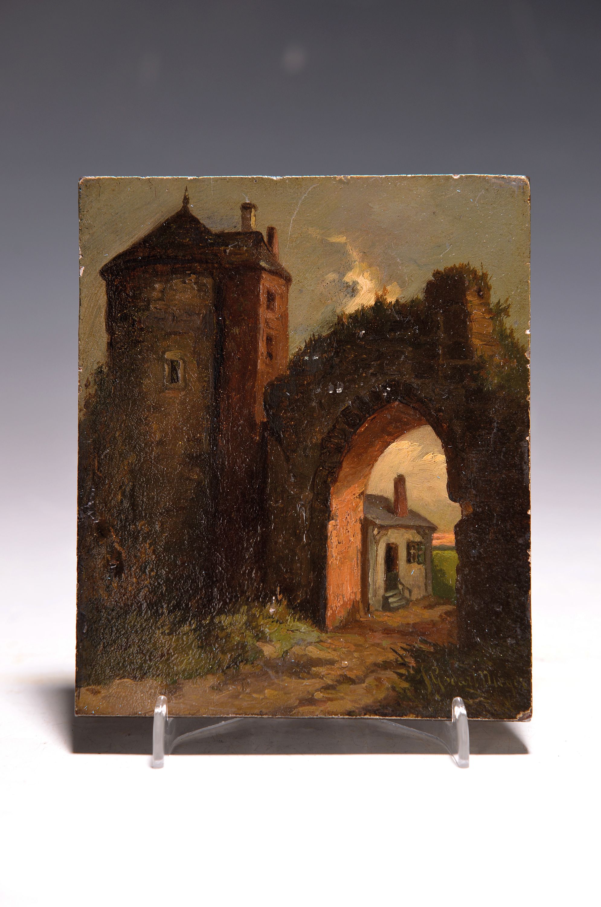 Ruine eines Stadttores, rechts unten signiert, Öl/Holz, 14x11,5 cm