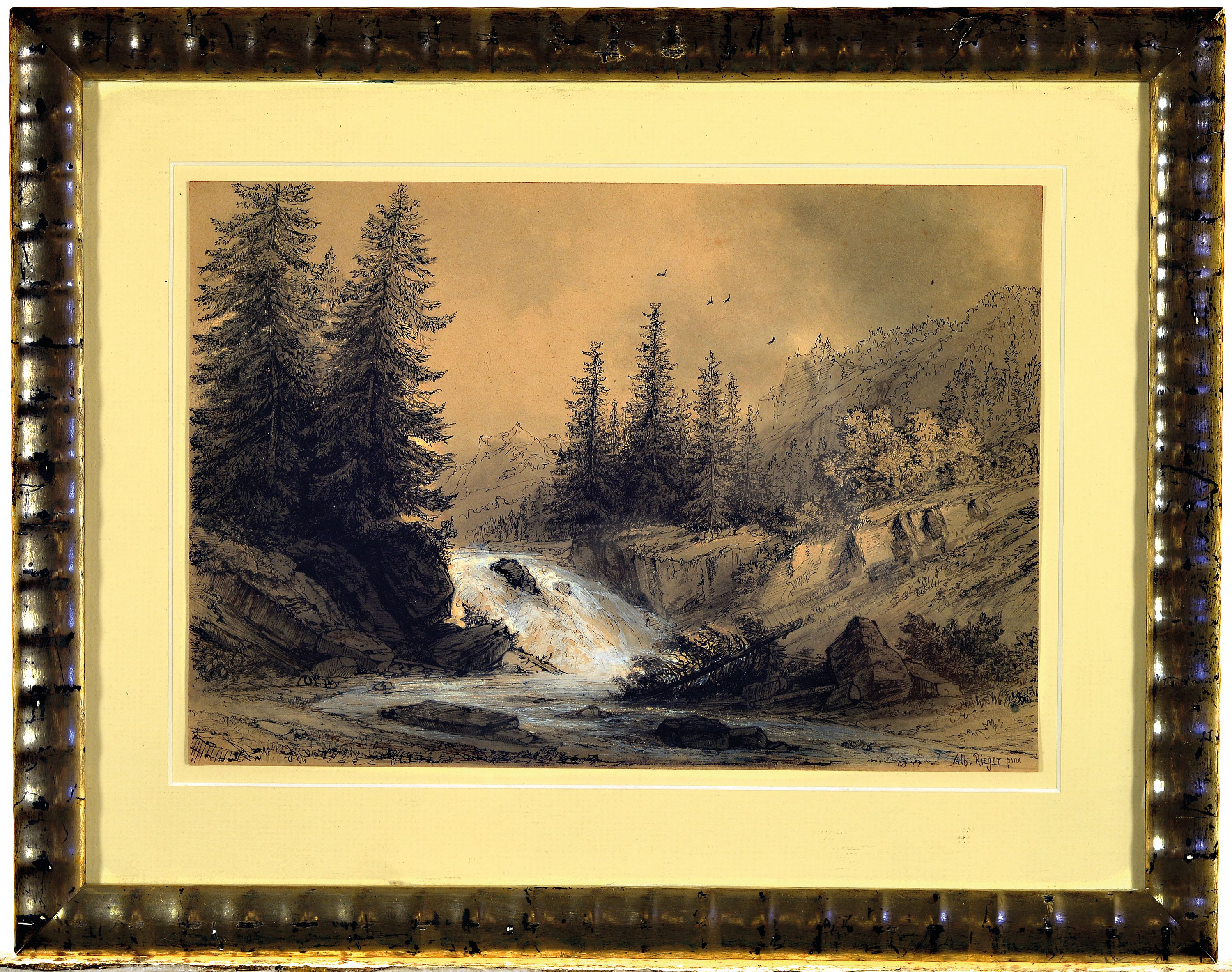 Albert Rieger, 1834 Triest -1905 Wien, Federzeichnung mit schwarzer Tinte, weißgehöht, Gebirgslandschaft mit Wildbach, rechts untensigniert, unter Glas gerahmt 29x36 cm