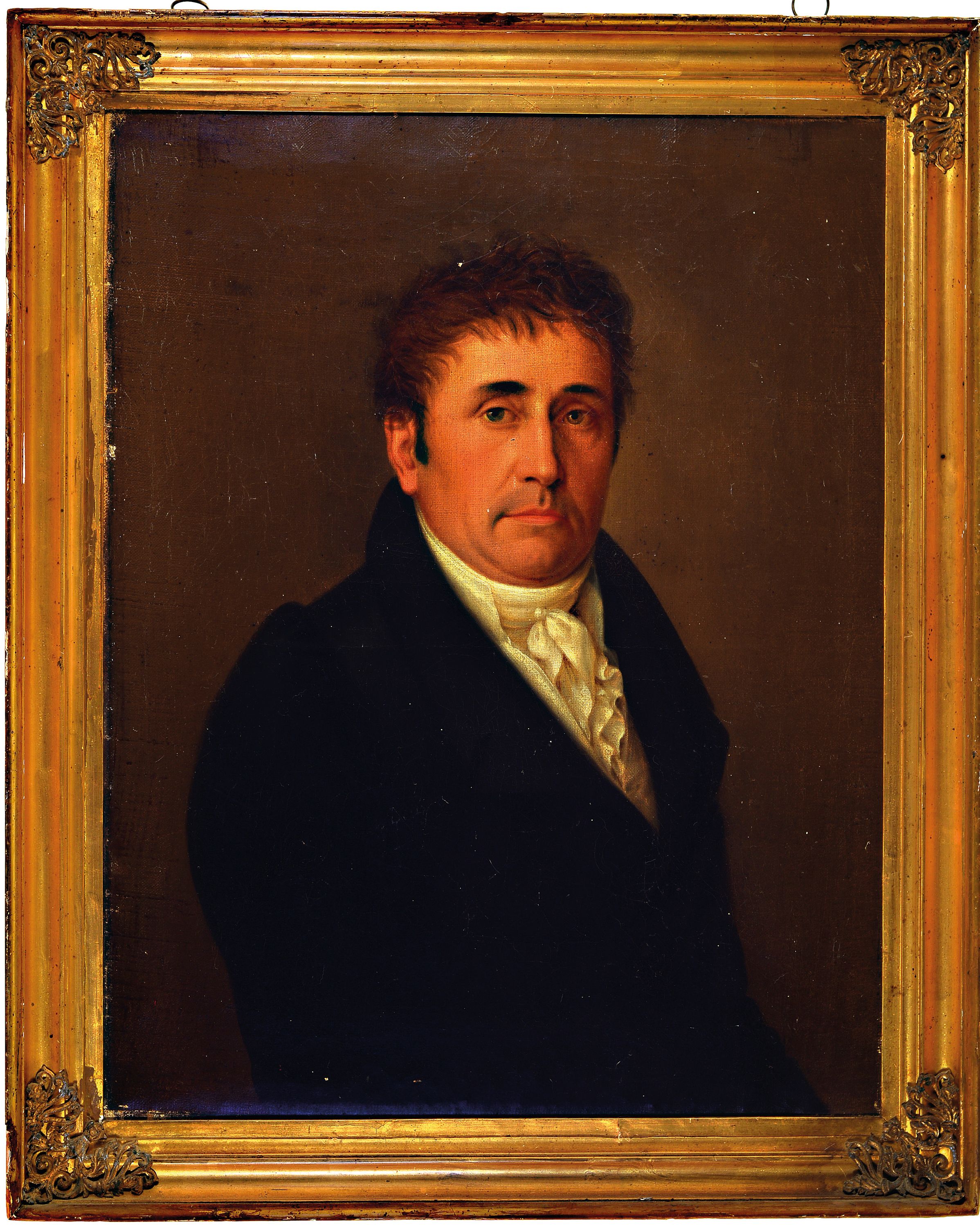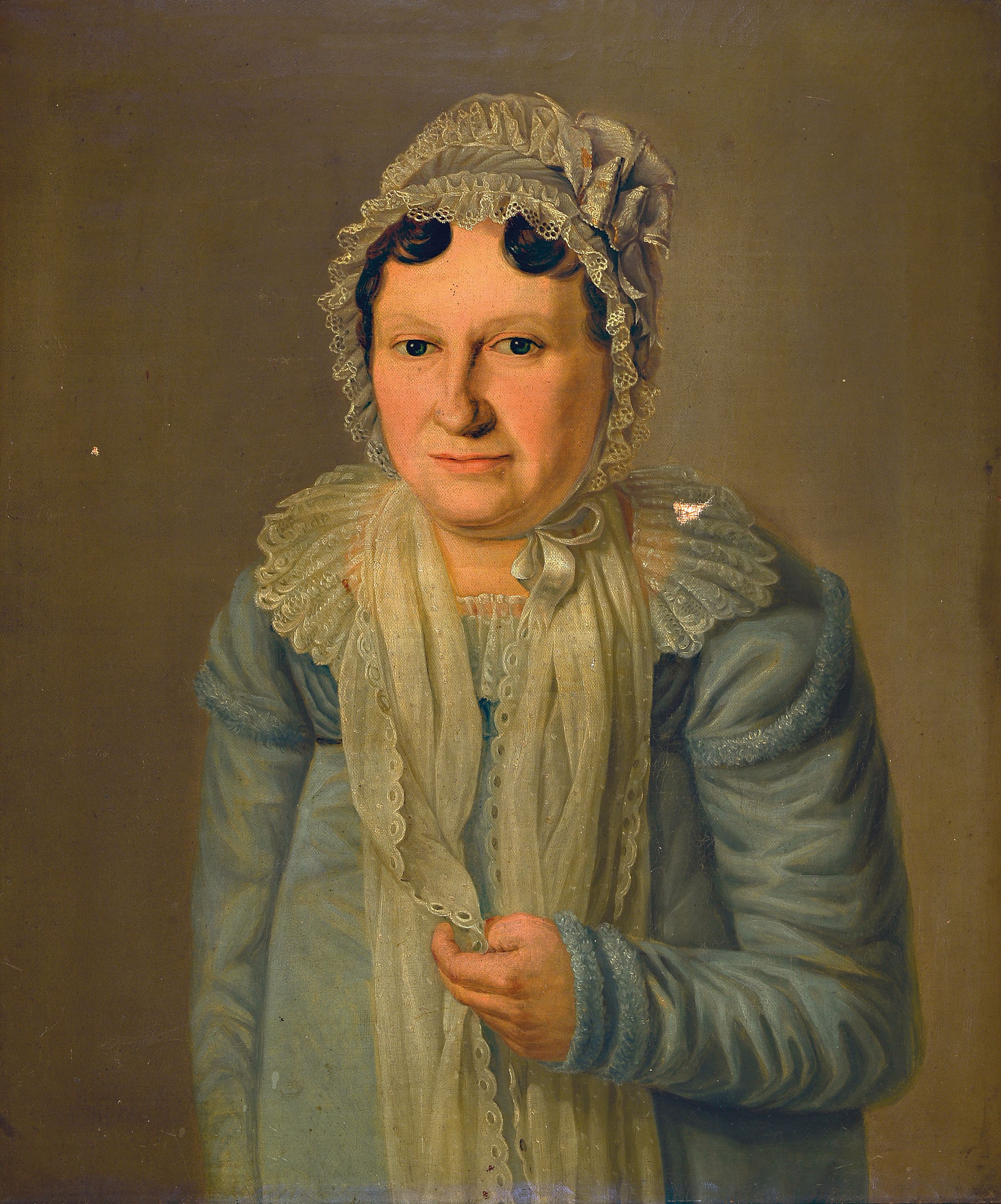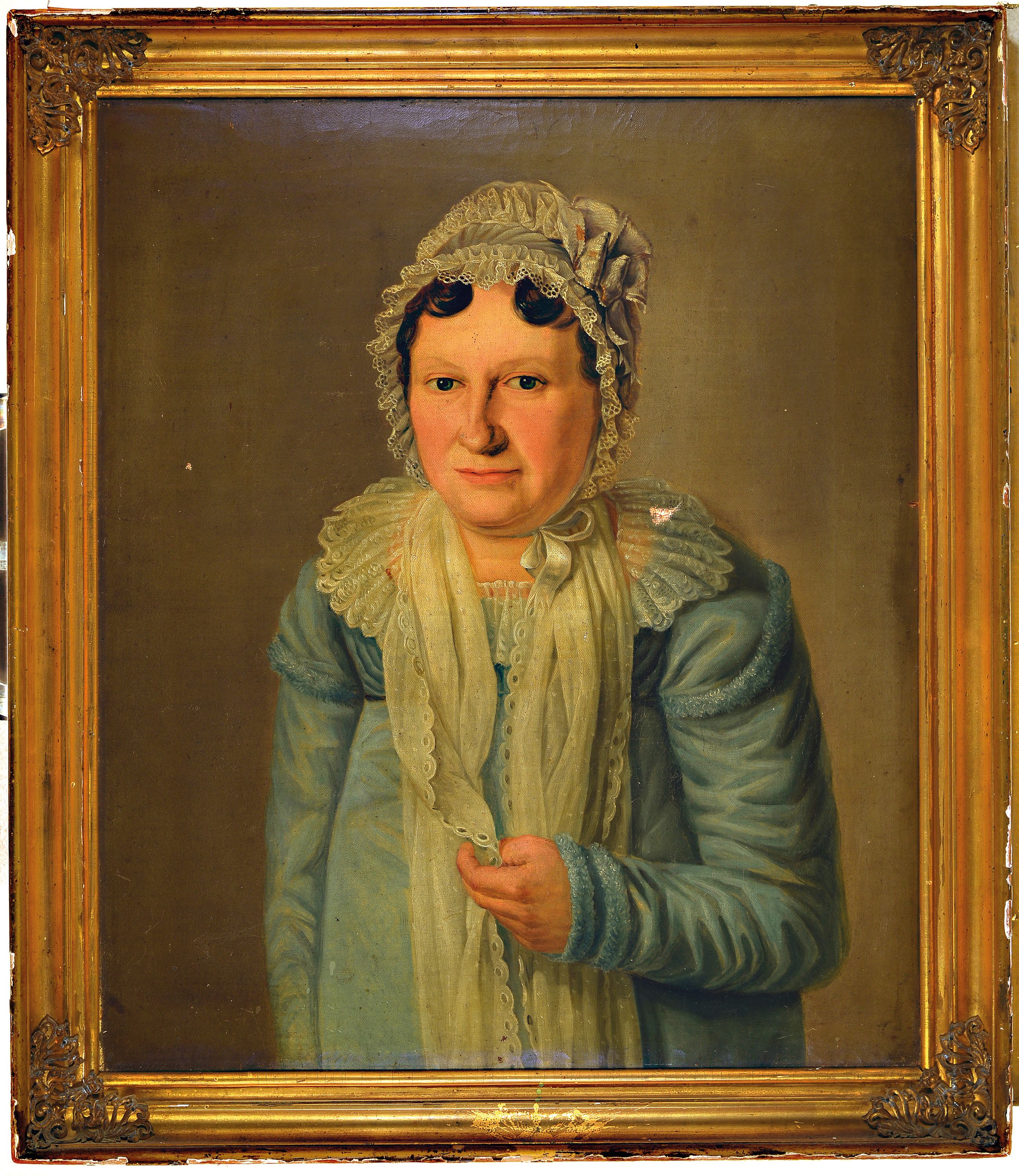 Porträtmaler, 18./19. Jh., Porträt der Dame mit Spitzenhaube u. der dazugehöriger Ehemann, Christian Gottfried Puruckherr und Ehefrau Christiana Wilhelmina, geb. Drandorf, Altenburg Thüringen, Öl/Lwd, lasierende Malerei, Damenporträt mit leichten Leinwandschäden und kl. Loch, ca. 70 x 57 cm, rückseitig mit alter Beschriftung, Zuordnung durch die Familie der Dargestellten, orig. Rahmen vergoldet, l. besch.