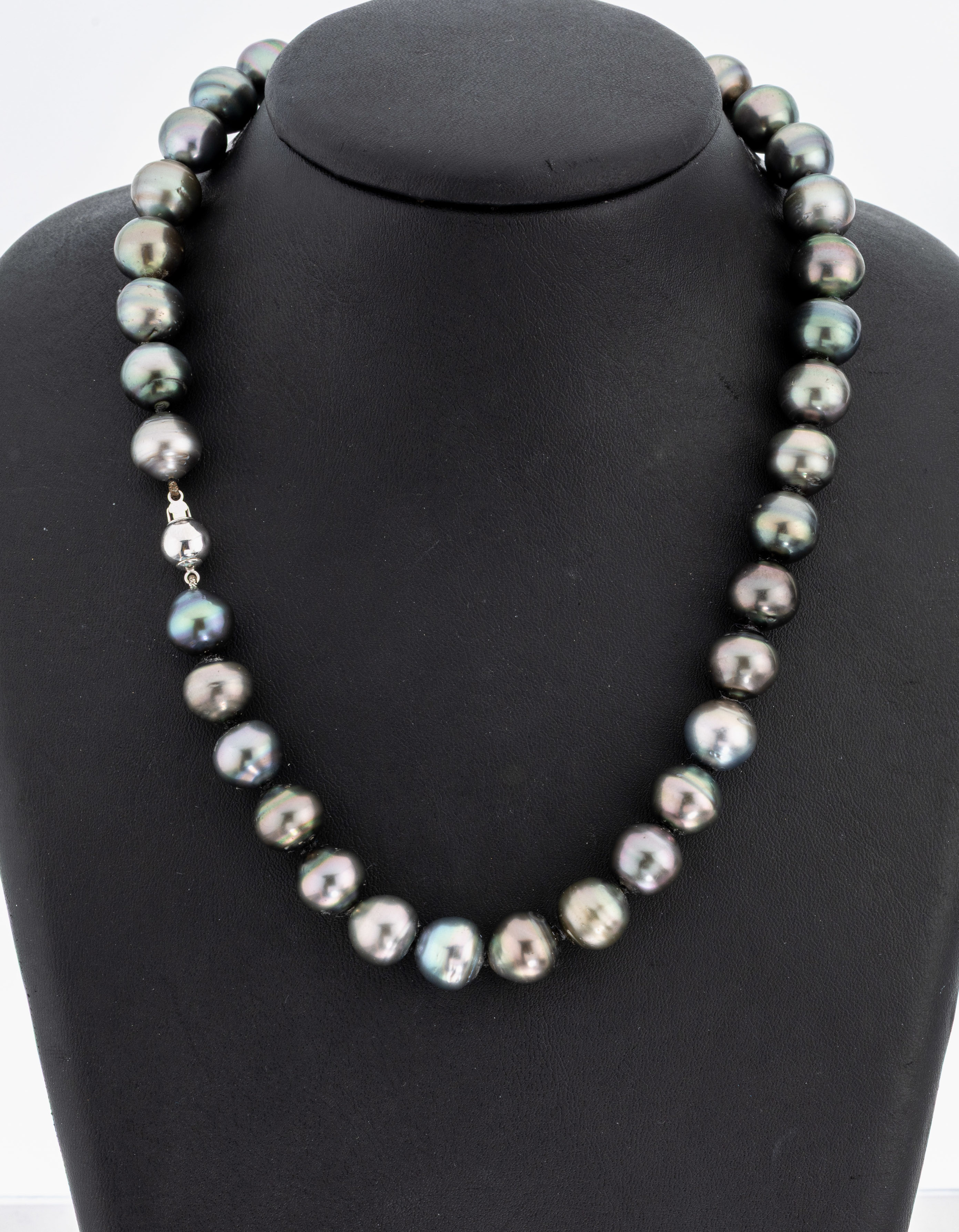 Perl-Collier mit 14 kt Gold Schließe, WG 585/000, 37 unrunde Tahitizuchtperlen in