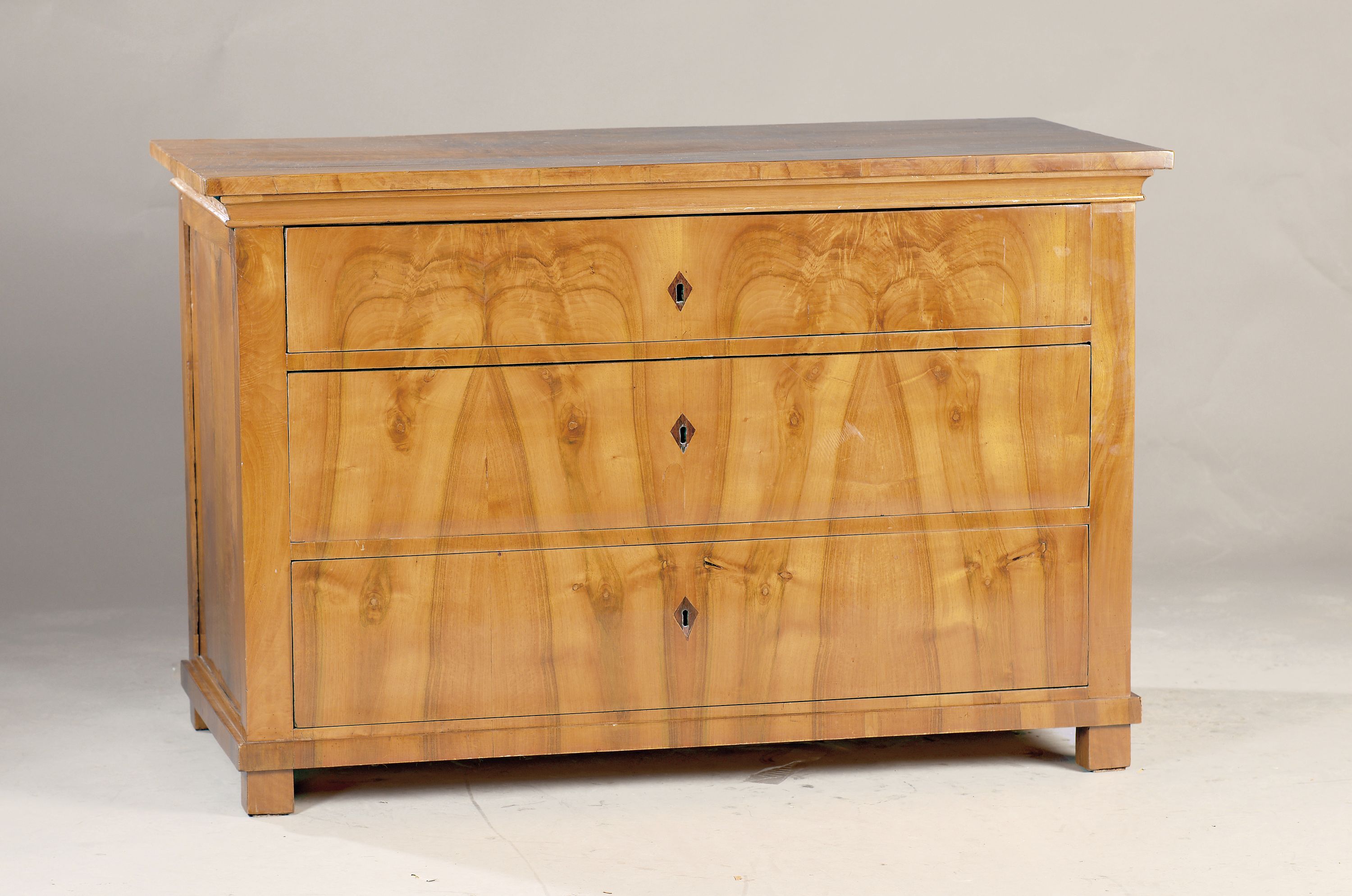 Biedermeier Kommode, um 1820/30, Nußbaumfurnier, 3 Schubladen, auf Pfostenfüssen,