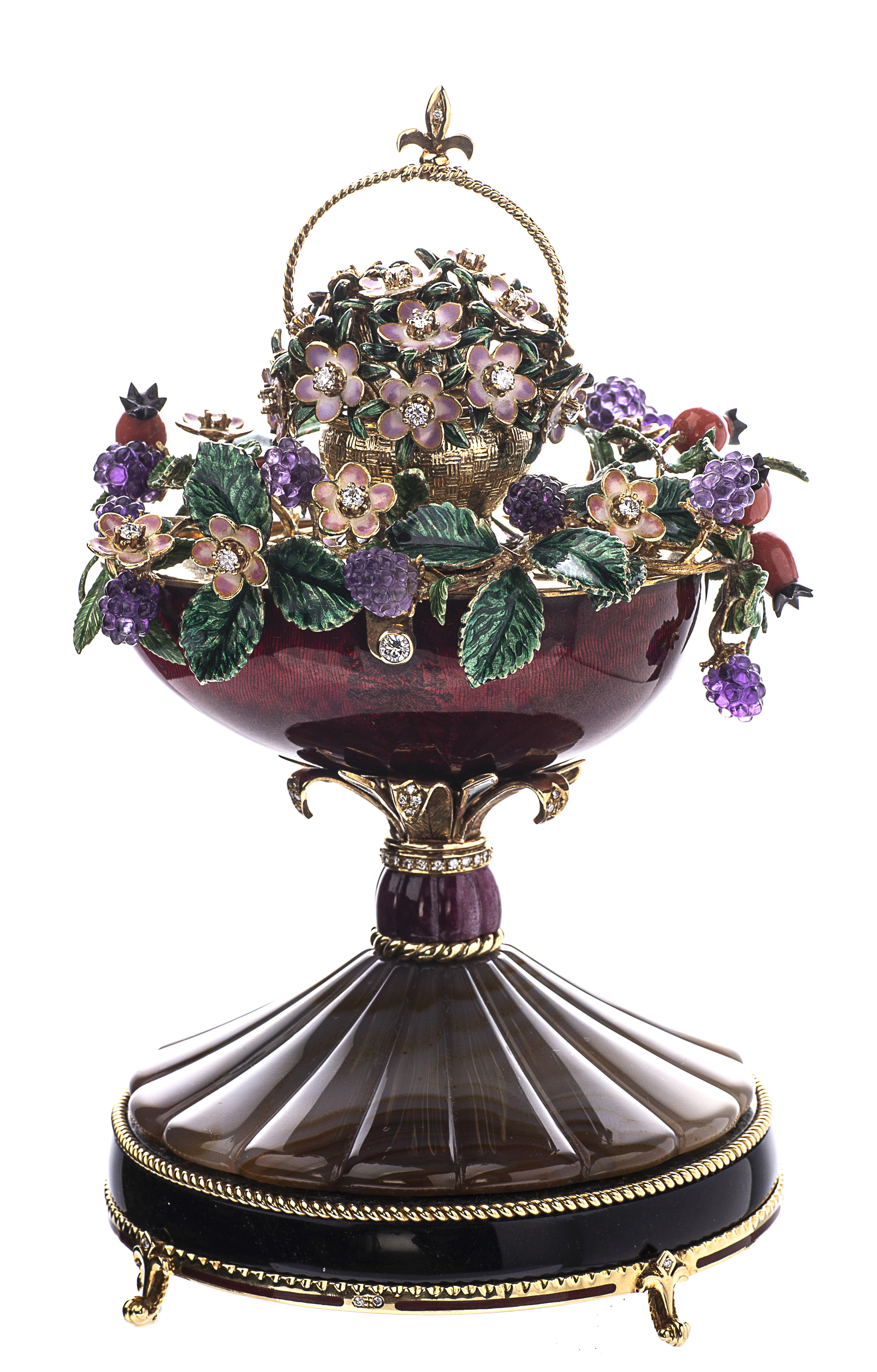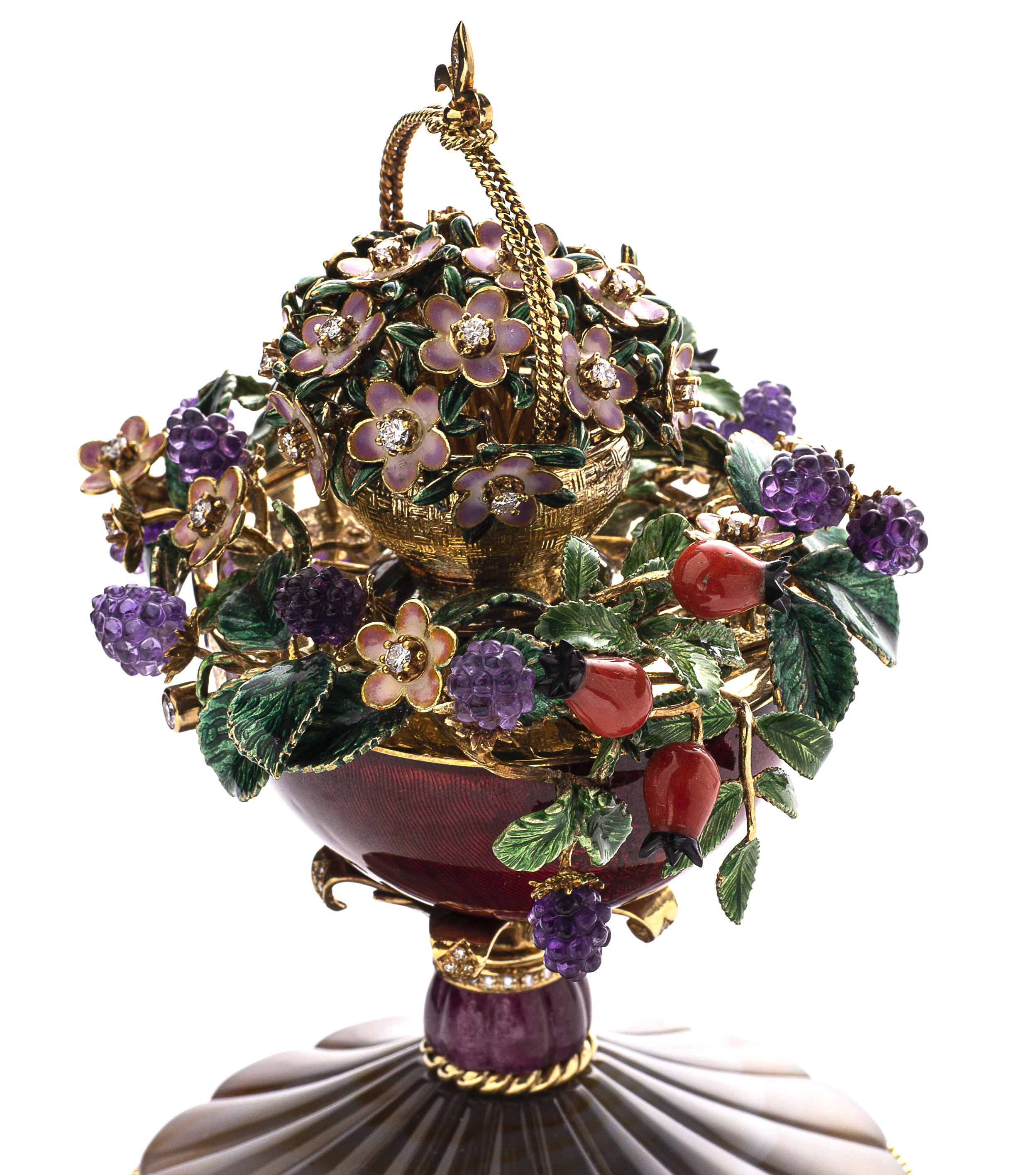 18 kt Gold FABERGE by VICTOR MAYER Spieluhr Herbst-Ei 1998, limit. Auflage, hier 9/10, GG 750/000, Sockel aus Obsidian-Achat auf Goldfüßchen, Kordelverzierung, Stiel mit grav. Rubin in Form einer Bourbonenlilie, Ei- Halbschale mit transluzid auberginefarb. Email, Halbschale gefüllt mit goldenen grün emaill. Blätterranken und herbsttyp. Obst: Hagebutten aus Koralle und Onyx, Brombeeren aus handgrav. Amethysten in versch. Farbabstufungen, Blüten weiß-rosafarb. emailliert, Brillanten zus. ca. 3.345 ct, Musikspielwerk von Reusch (Schweiz), Vivaldis Herbstmusik wurde eigens für Faberge überarbeitet, der Blumenkorb dreht sich auf Knopfdruck, eine Henkelseite lose, H. ca. 20 cm, B. ca. 13 cm, Orig.-Faberge-Geschenkbox mit Wurzelfurnier, Orig.-Umkarton, mehrsprachiges Zertifikat, Versand nur innerhalb der EU Schätzpreis: 87110, - EUR