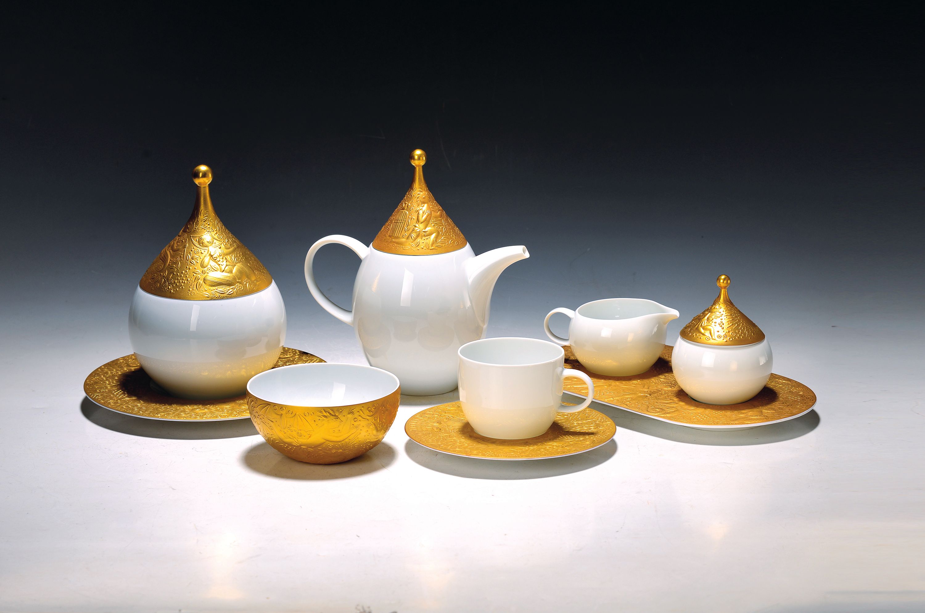 reich reliefiert und teilvergoldet, 2 Mokkakännchen, Zuckerdose und Sahnegießer