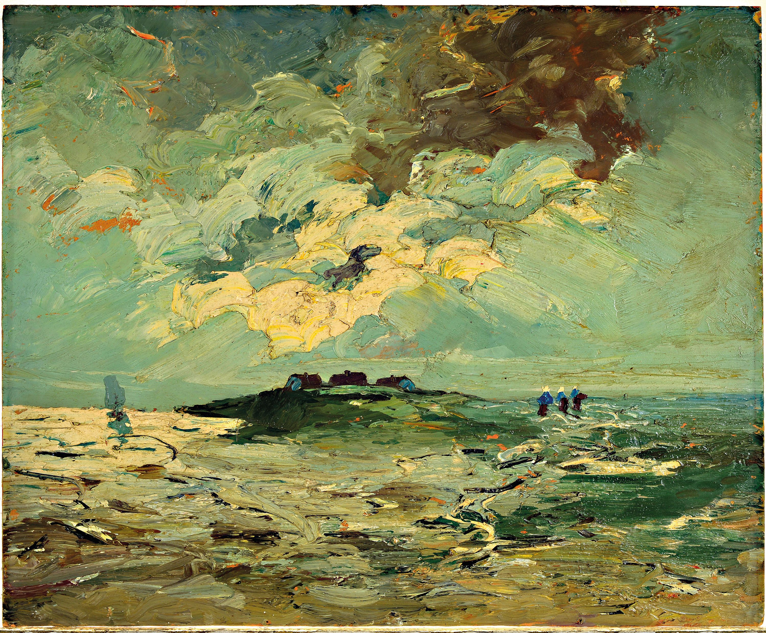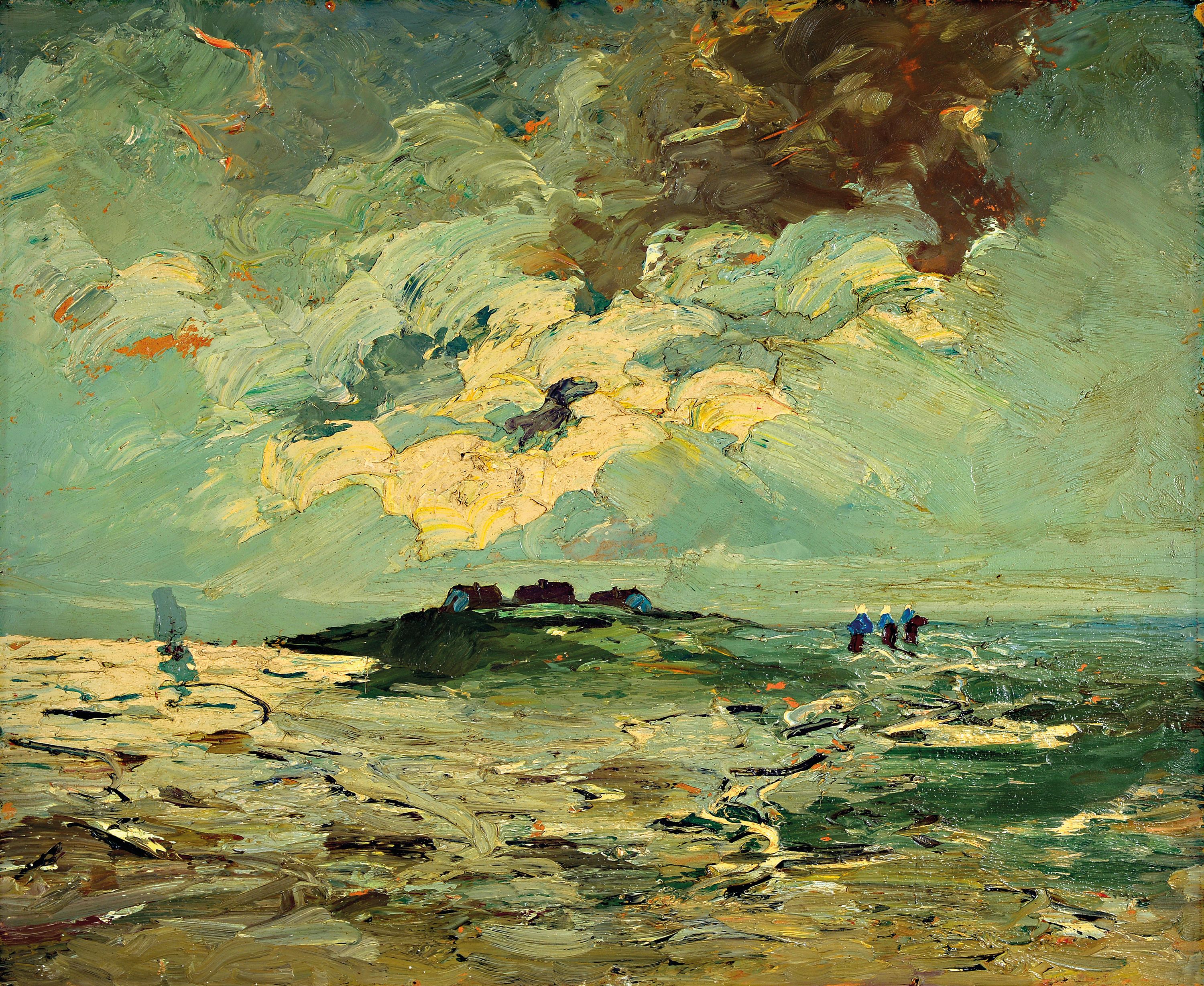 Halligunter bewegtem Himmel, Öl/Masonit, stark pastoser Farbauftrag, unsigniert,