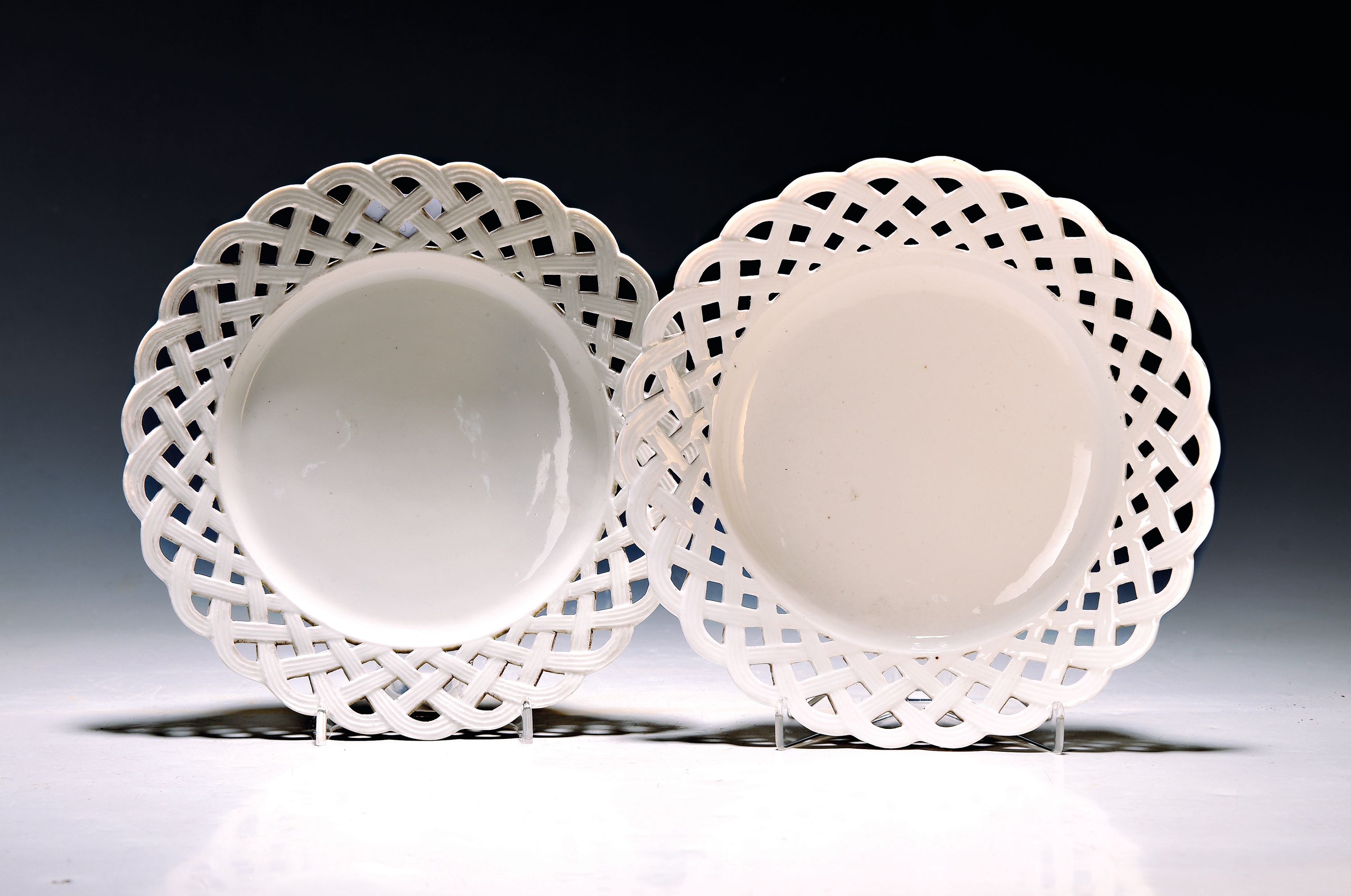 Zwei Dessertteller, Frankenthal, 1787, Fahne geflochtene Durchbrucharbeit, Bossierermarke