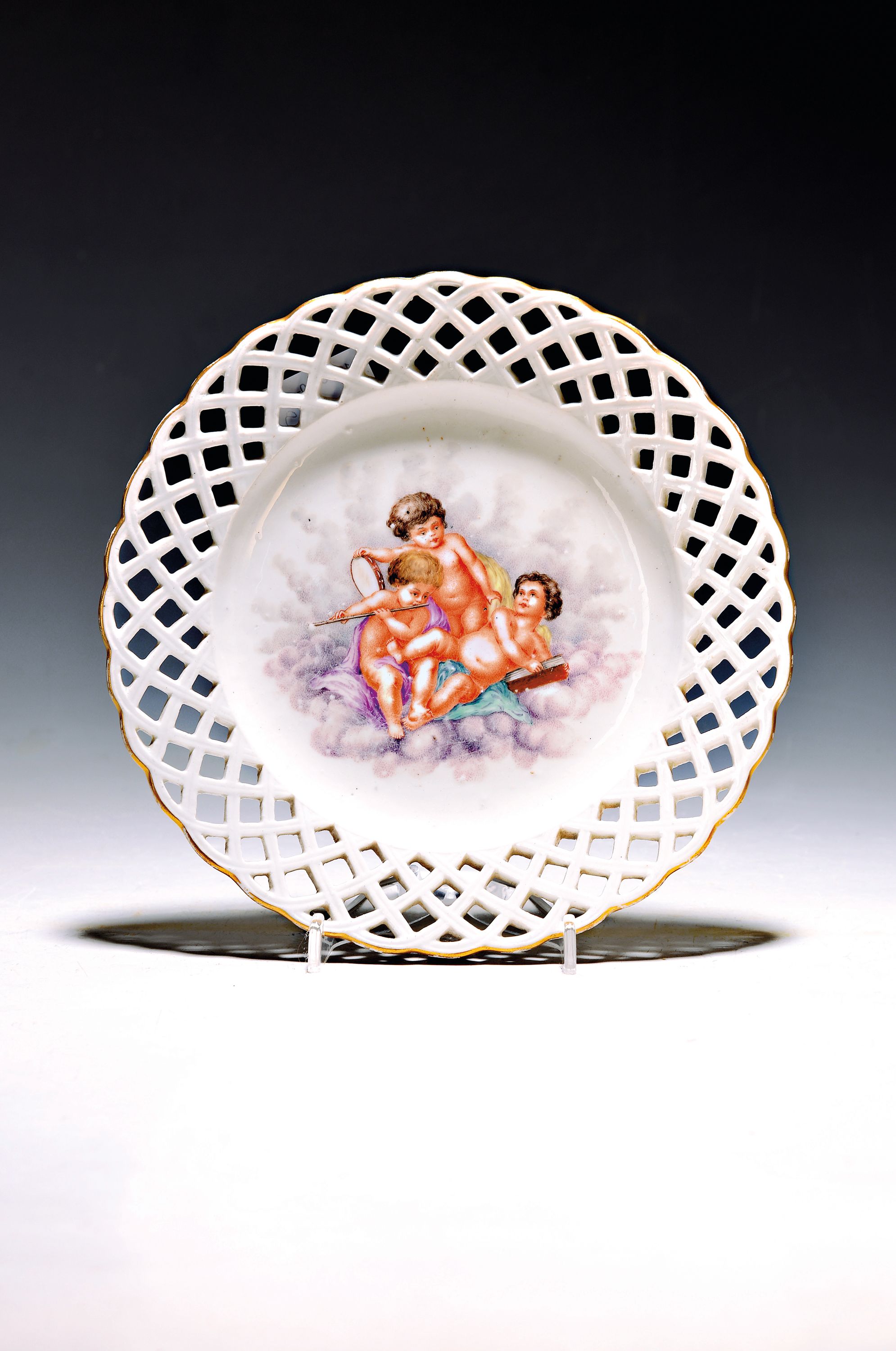 Dessertteller, Höchst, um 1765, Porzellan drei musizierende Putten auf Wolken, bunt