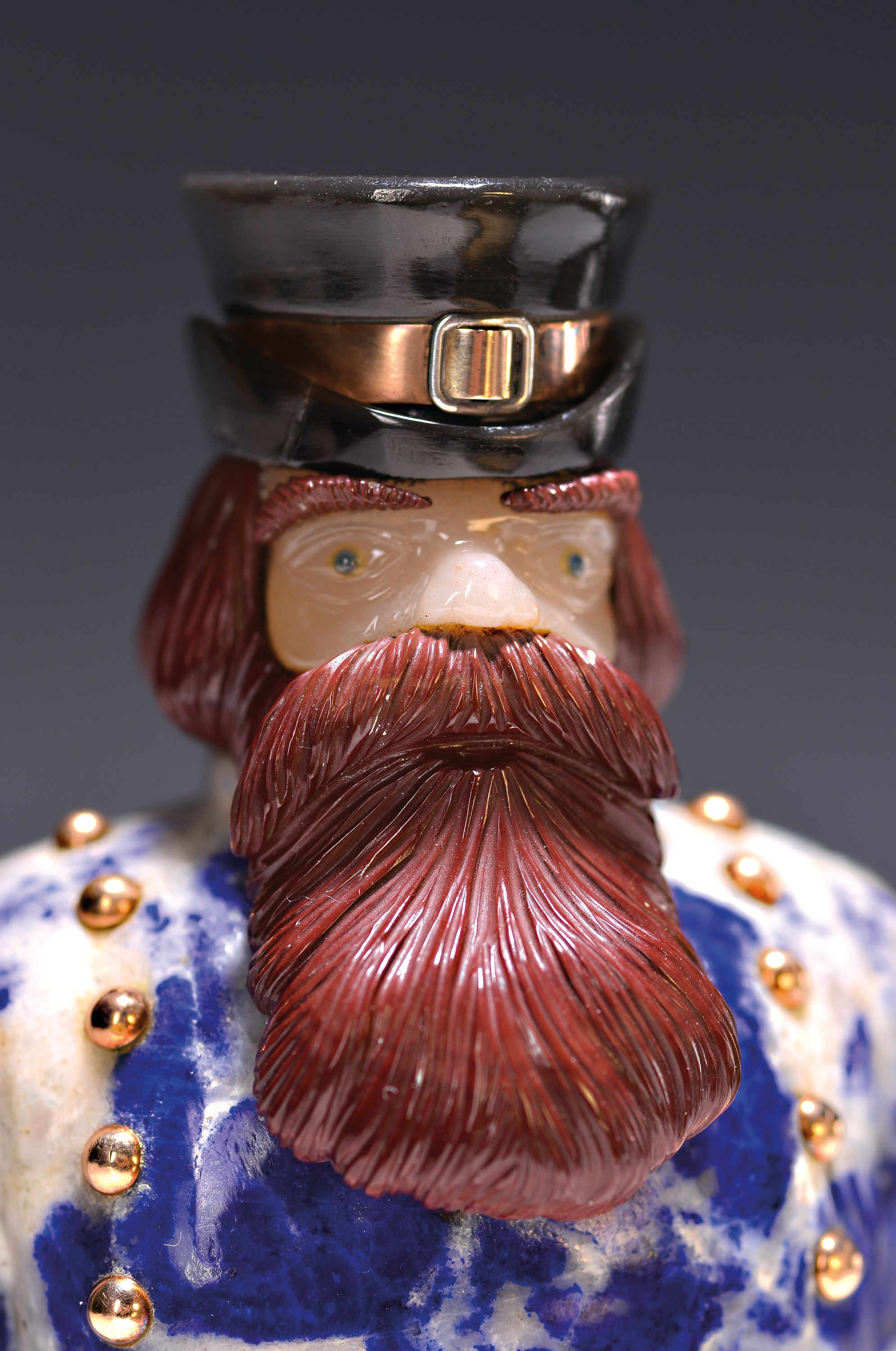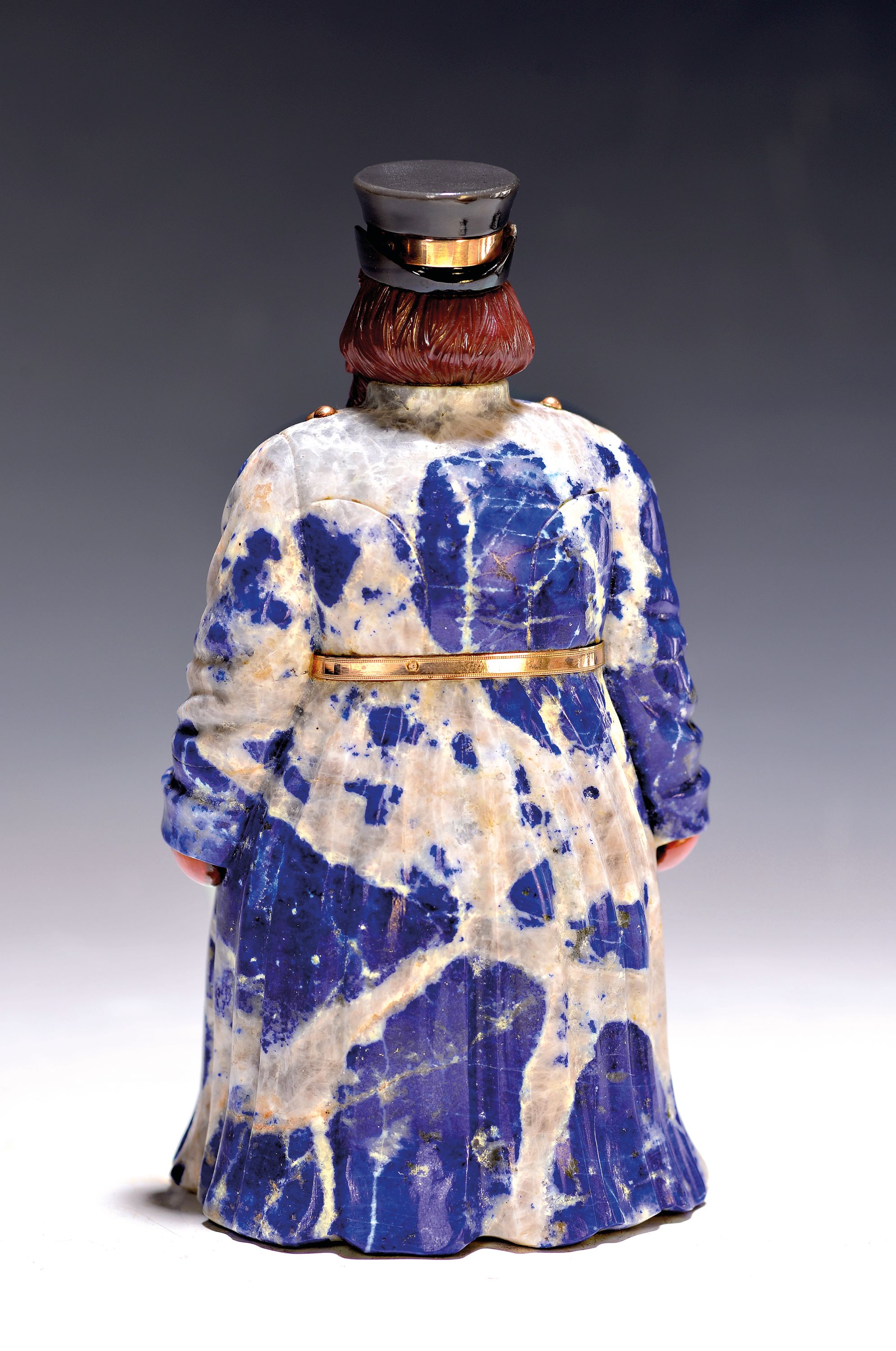 Lapislazuli-Figur in der Art Faberge, "Kutscher", Russland, 1908-1917, naturalistische Darstellung aus Halbedelsteinen gefertigt, vollplastisch gearbeitete Darstellung eines stehenden Mannes, Mantel aus blauem Lapislazuli mit dekorativer weißer Calcit-Äderung, Handschuhe aus rotem Achat, Zylinder wohl aus schwarzem Obsidian, Gesicht und Bart aus Eosit oder Obsidian gebildet, Gürtel, Hutriemen und Mantelknöpfe aus Silber vergoldet, Gürtel mit Pseudo-Faberge-Marke, Kokoshnik-Marke 56 Zolotniki St. Petersburg, Hutriemen mit Fabergemarke KF, 1146g, H. 16 cm, Hutkrempe l. gesprungen; Provenienz: seit den 1940er-Jahren in südwestdeutschem Privatbesitz, lt. Überlieferung aus dem Russlandfeldzug mitgebracht