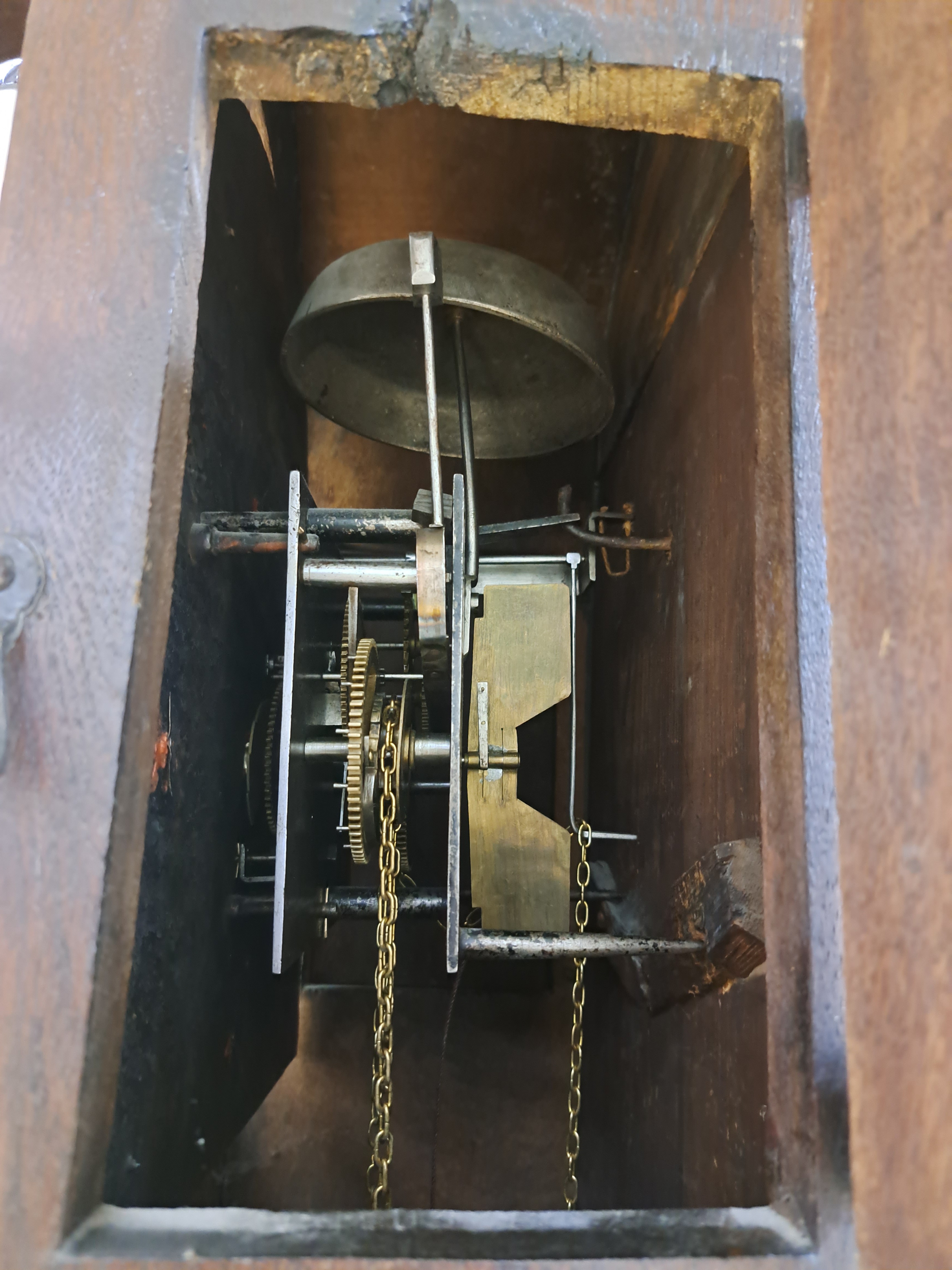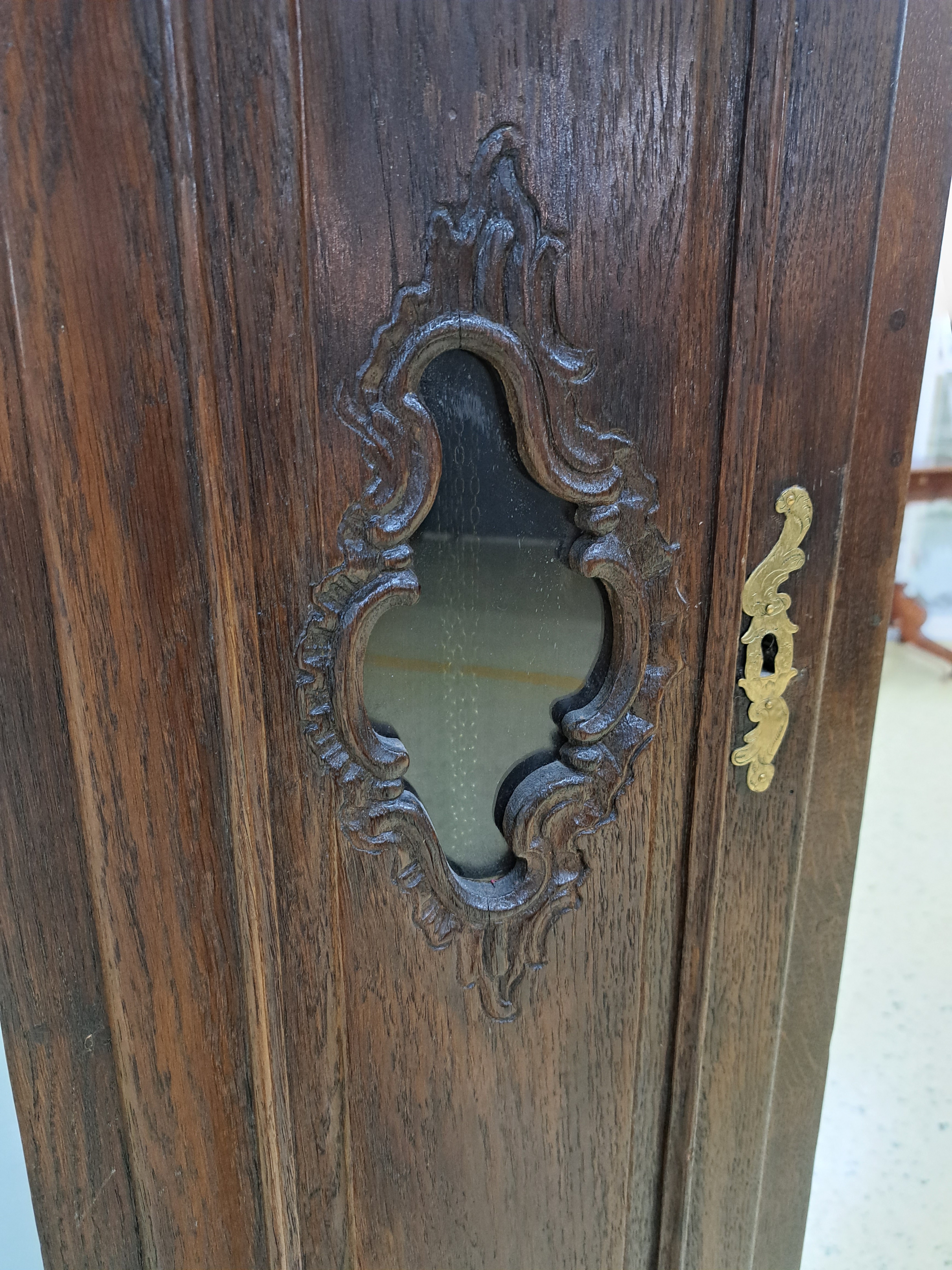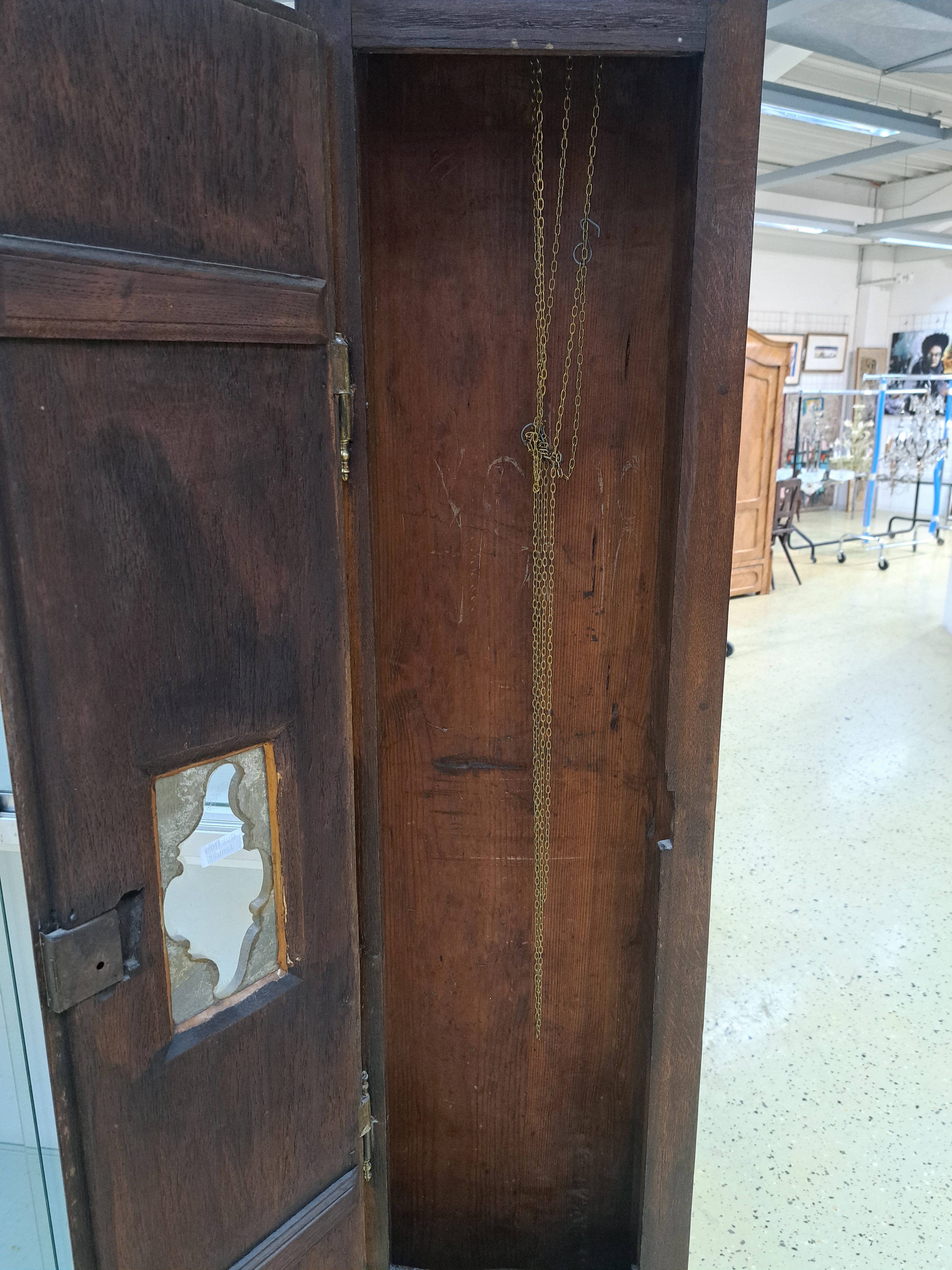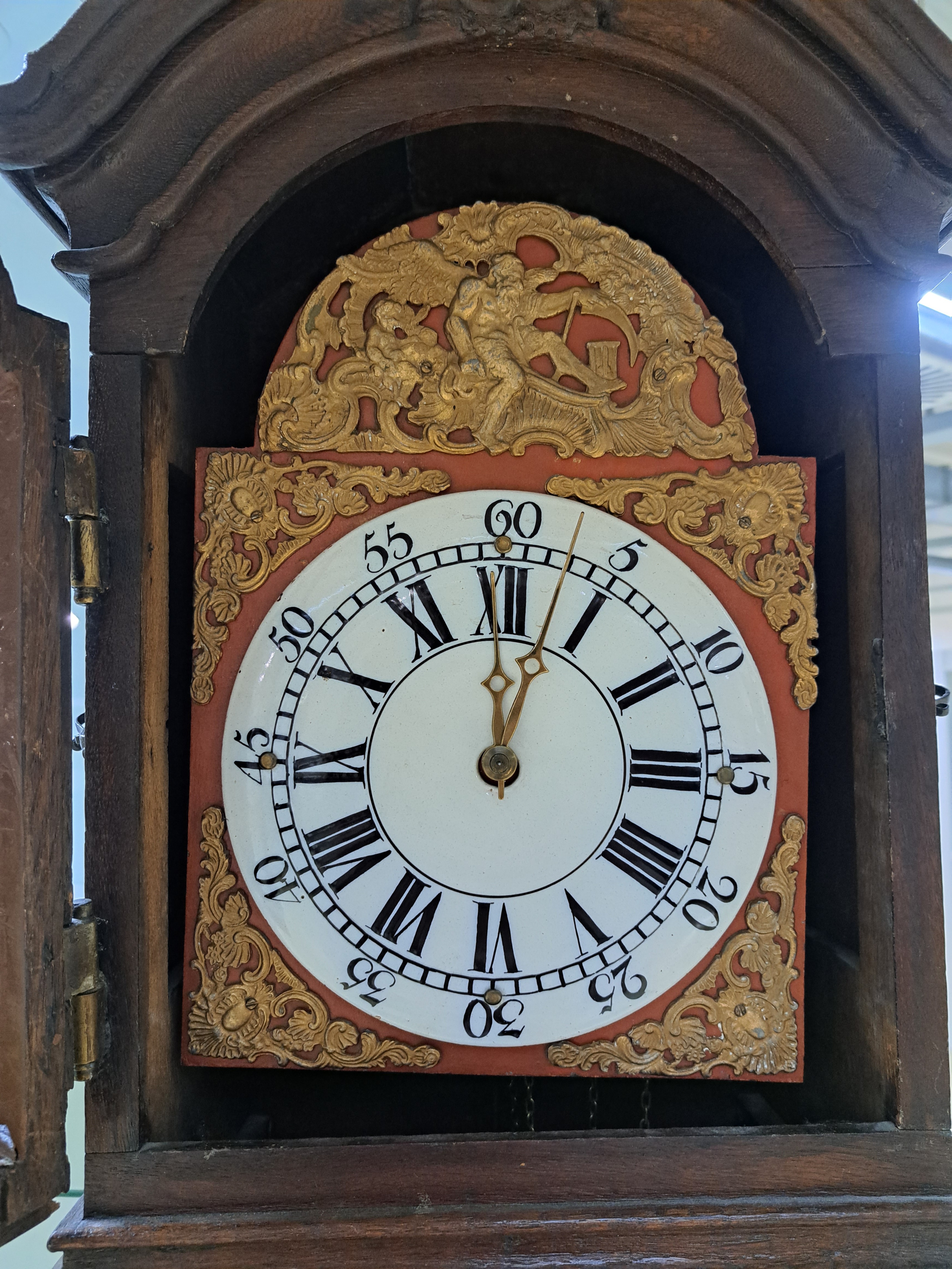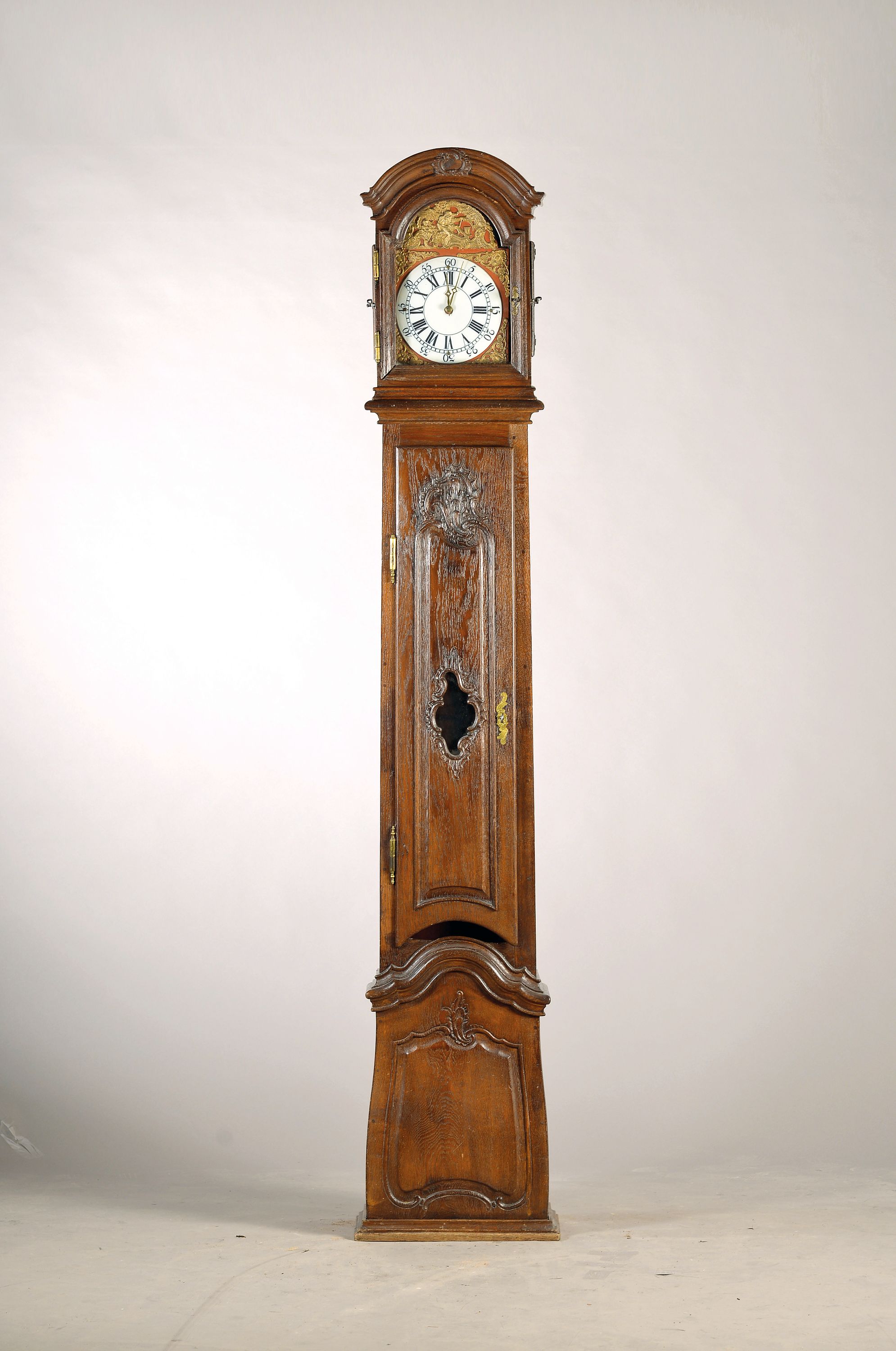 Standuhr, deutsch, um 1760/80, Eichengehäuse mit kräftigen Schnitzarbeiten, geschnitzte Rokoko-Elemente, Kopf abnehmbar, an oberer Tür Abplatzer und fehlende Verzierung an unterem Abschluss, Schlagwerk läuft nicht an - zu revidieren, im Giebel Chronos, Fayencezifferblatt in Tellerform, Zeiger sek., Eisenplatinen mit Abstandsdornen,Ankergang, Stundenschlag auf Glocke, großer ext. Windfang (selten), Antrieb über Ketten und Gewichte, H. ca. 241cm, WZ 4, GZ 3-4