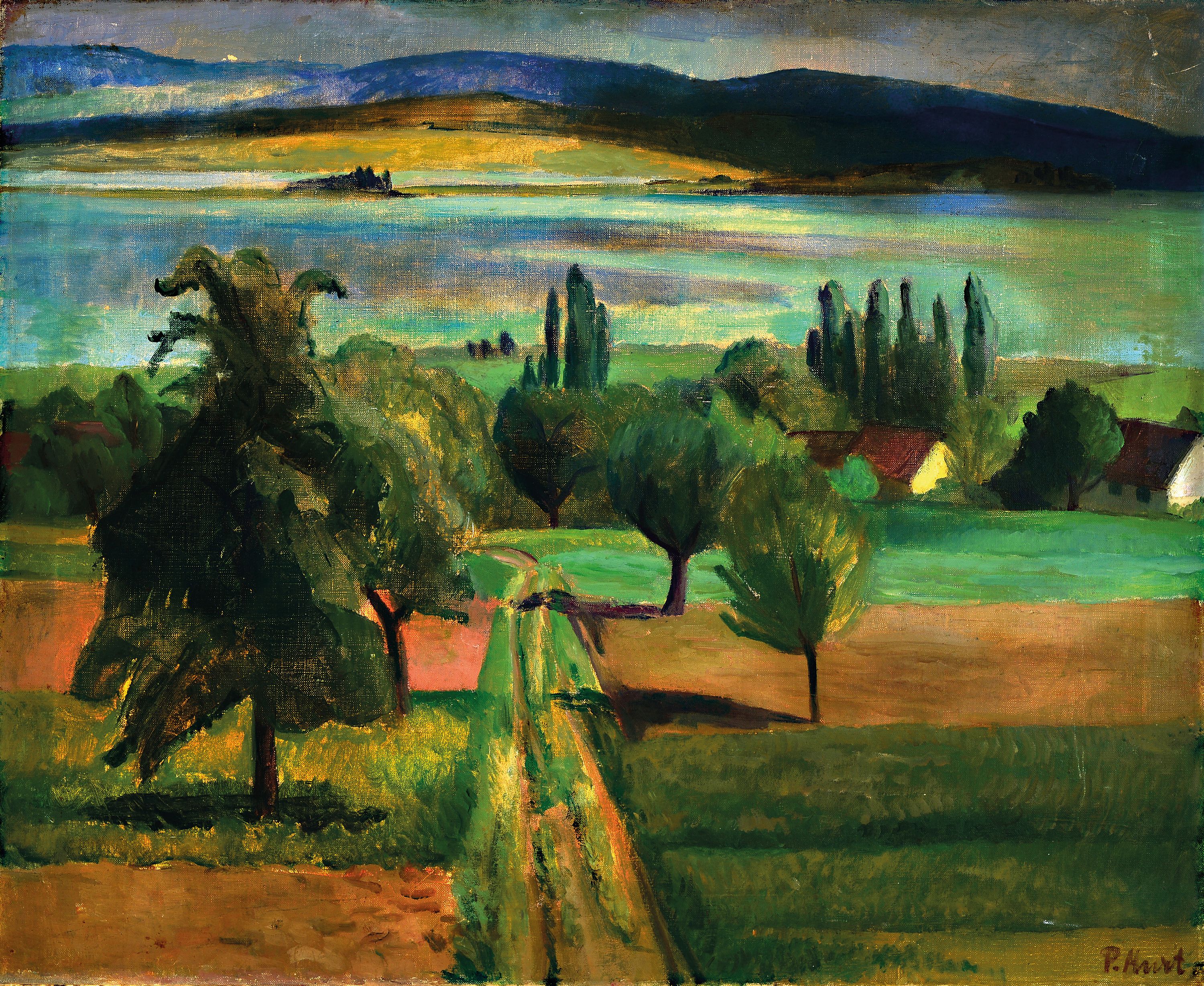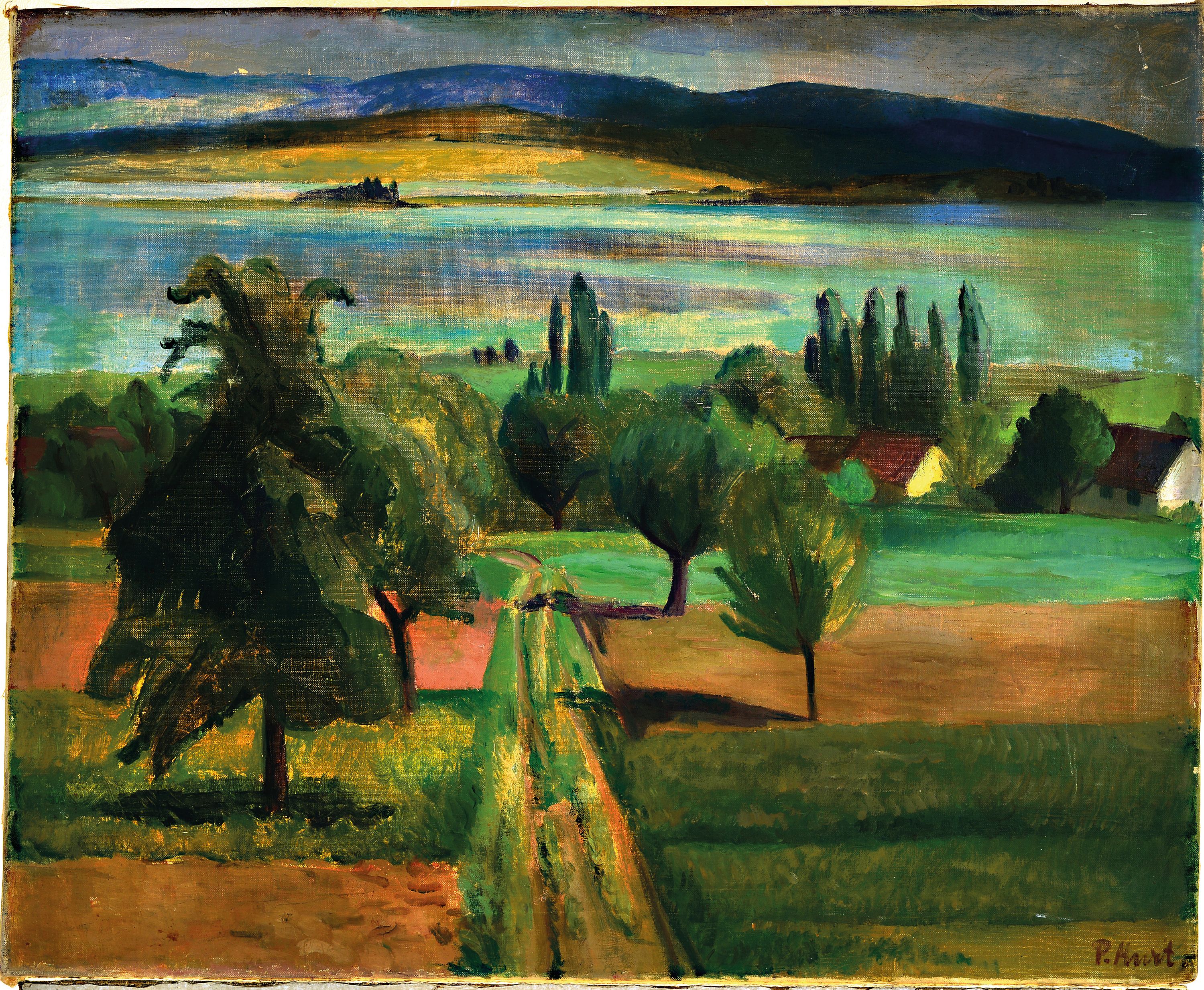 Paul Hart, Schweizer Künstler des 20.Jh., Blick entlang einer Allee auf einen See,