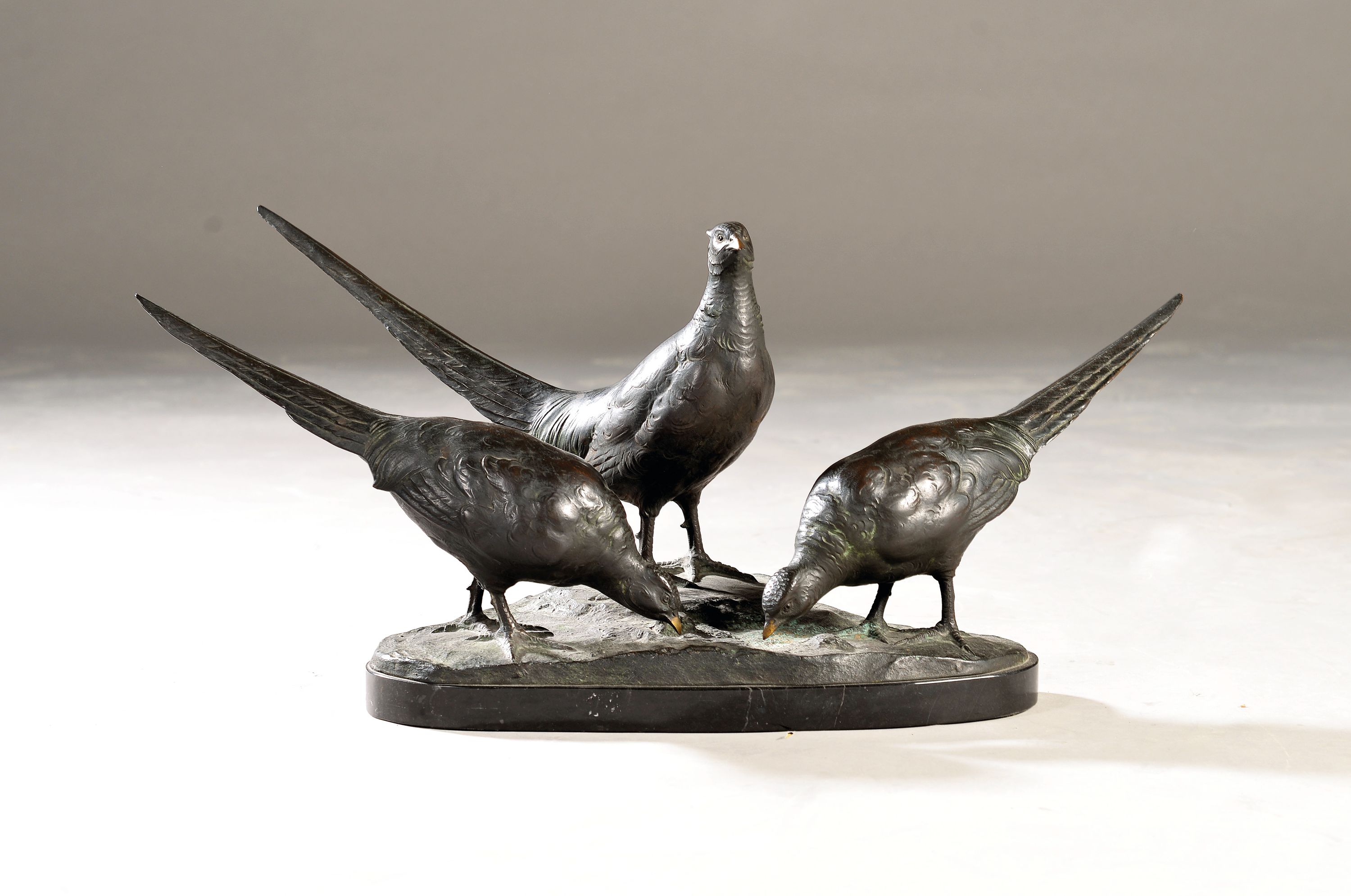Bronzeskulptur, Prof. Otto Poertzel, drei Fasane, signiert, Marmorplinthe, ca. 25x72x44cm