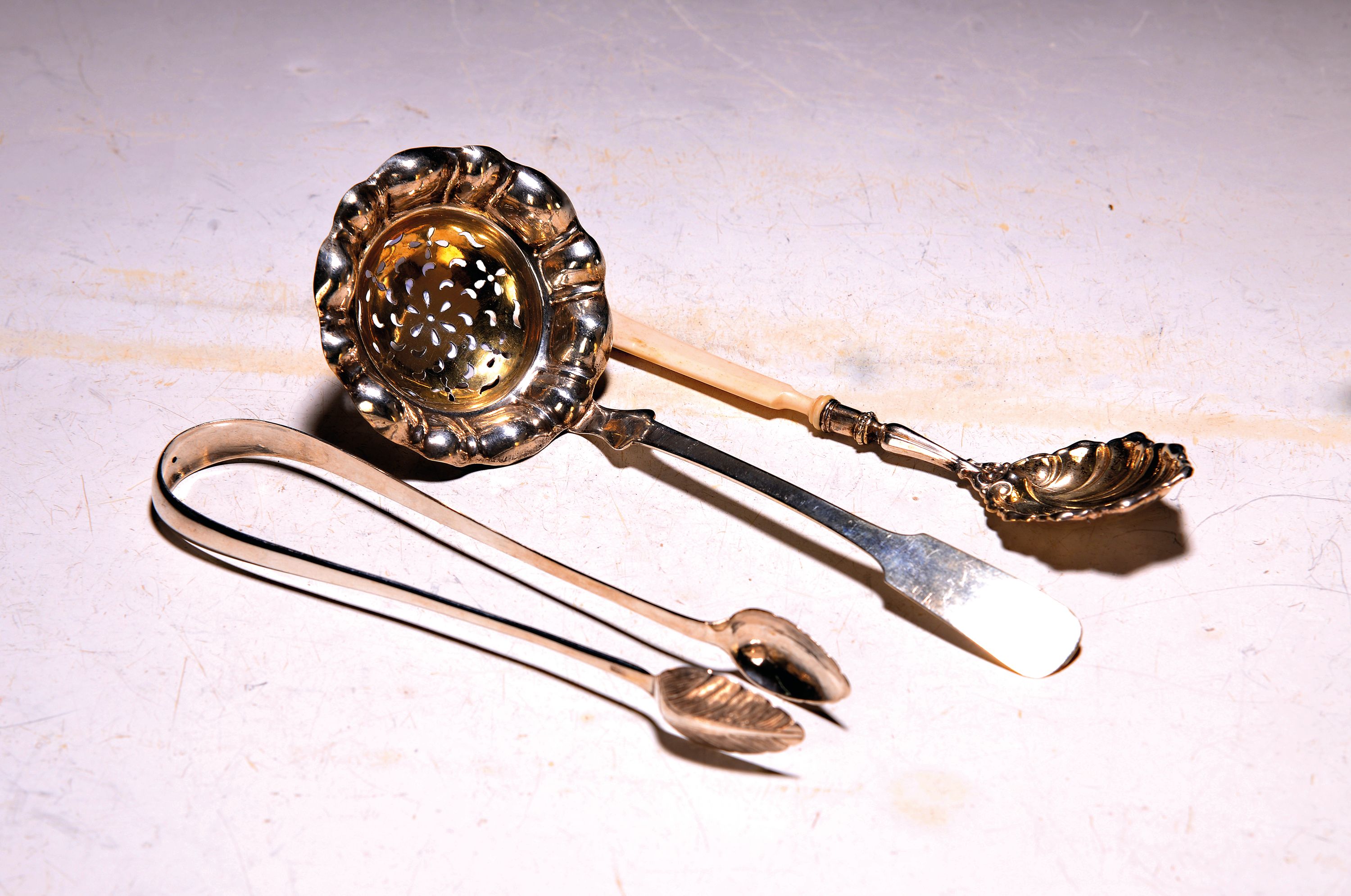 3 Serviceteile aus Silber, 19.Jh., Teesieb Gottschalk, Zuckerlöffel, Zuckerzange