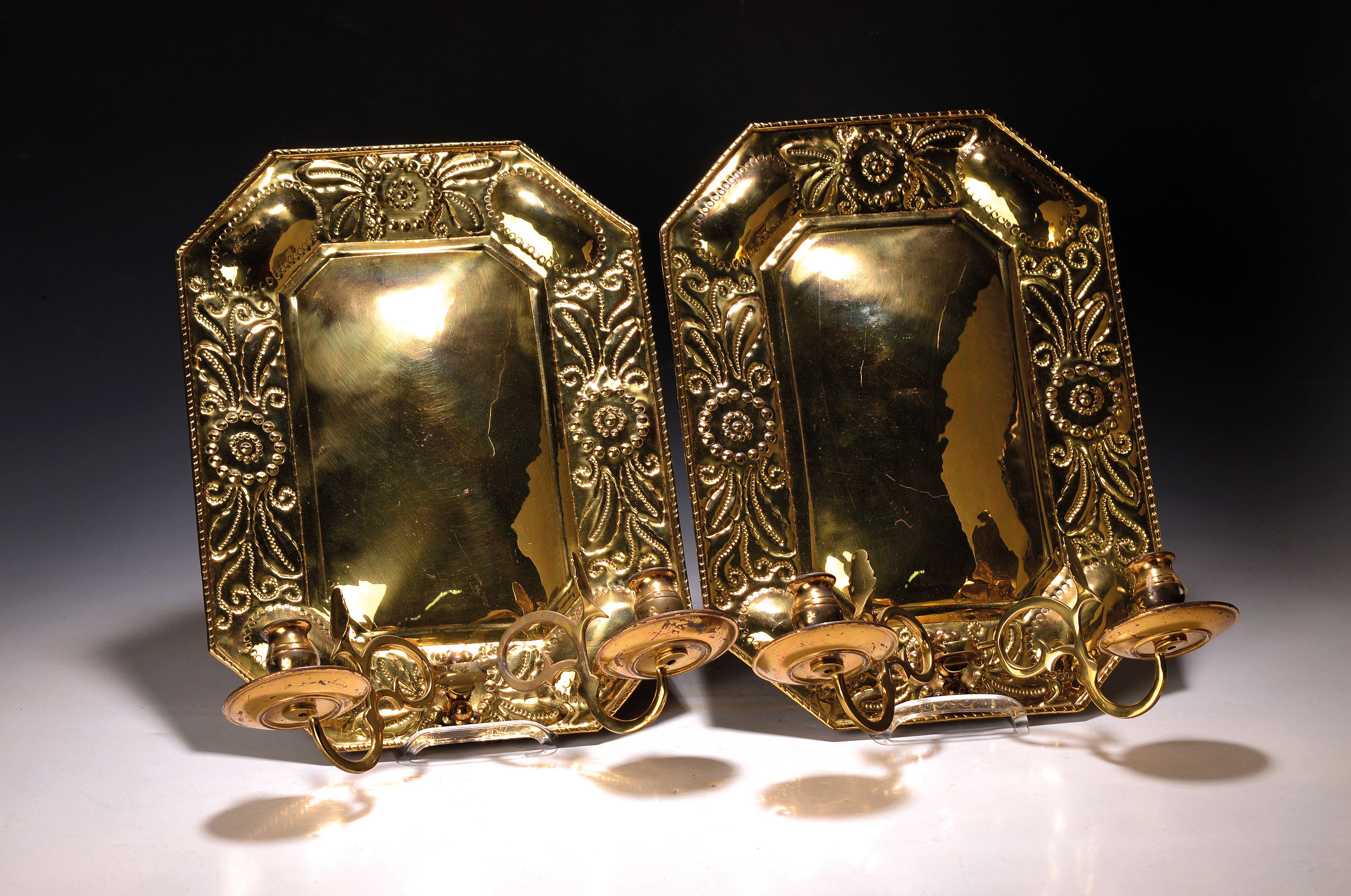 Paar Schild- bzw. Spiegelleuchter, 19.Jh., Messing poliert, zwei Brennstellen, je