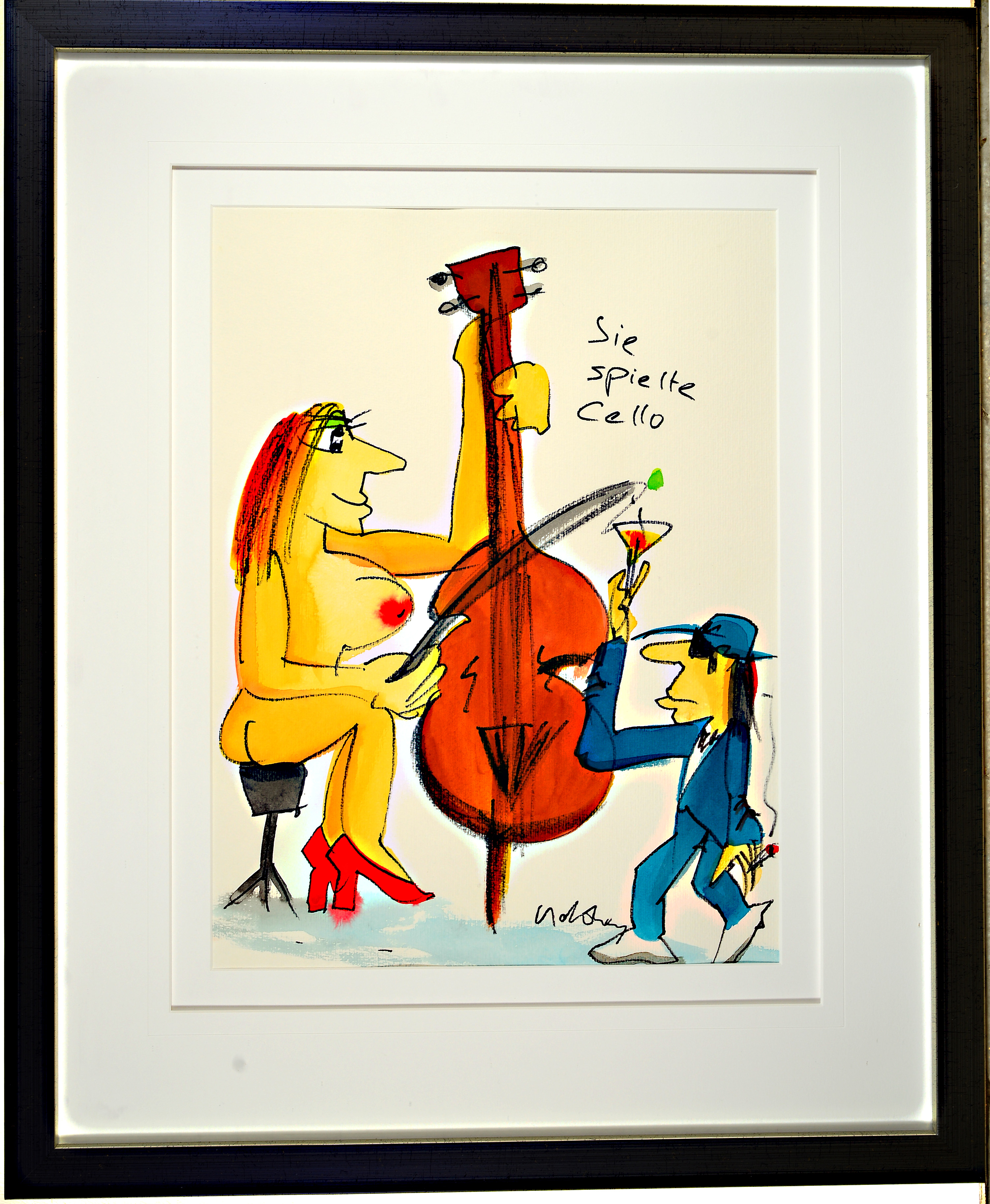 weiblicher Akt das Cello spielend, seitlich er selbst, Aquarell von 2010, handsigniert,