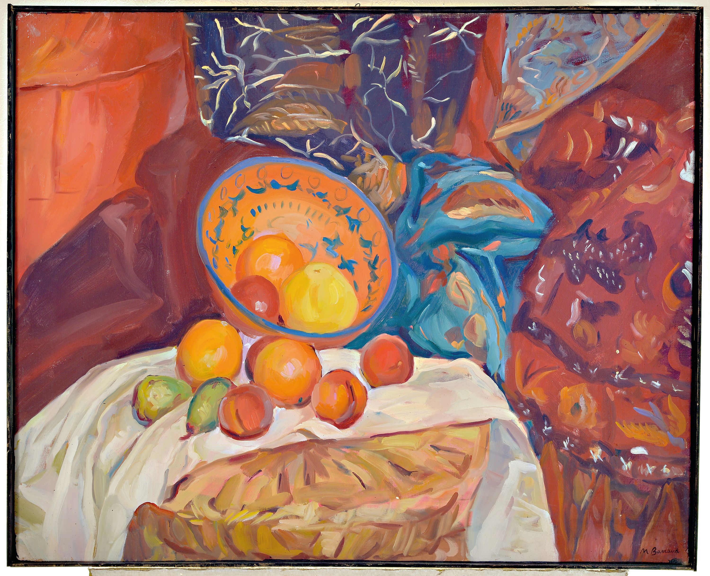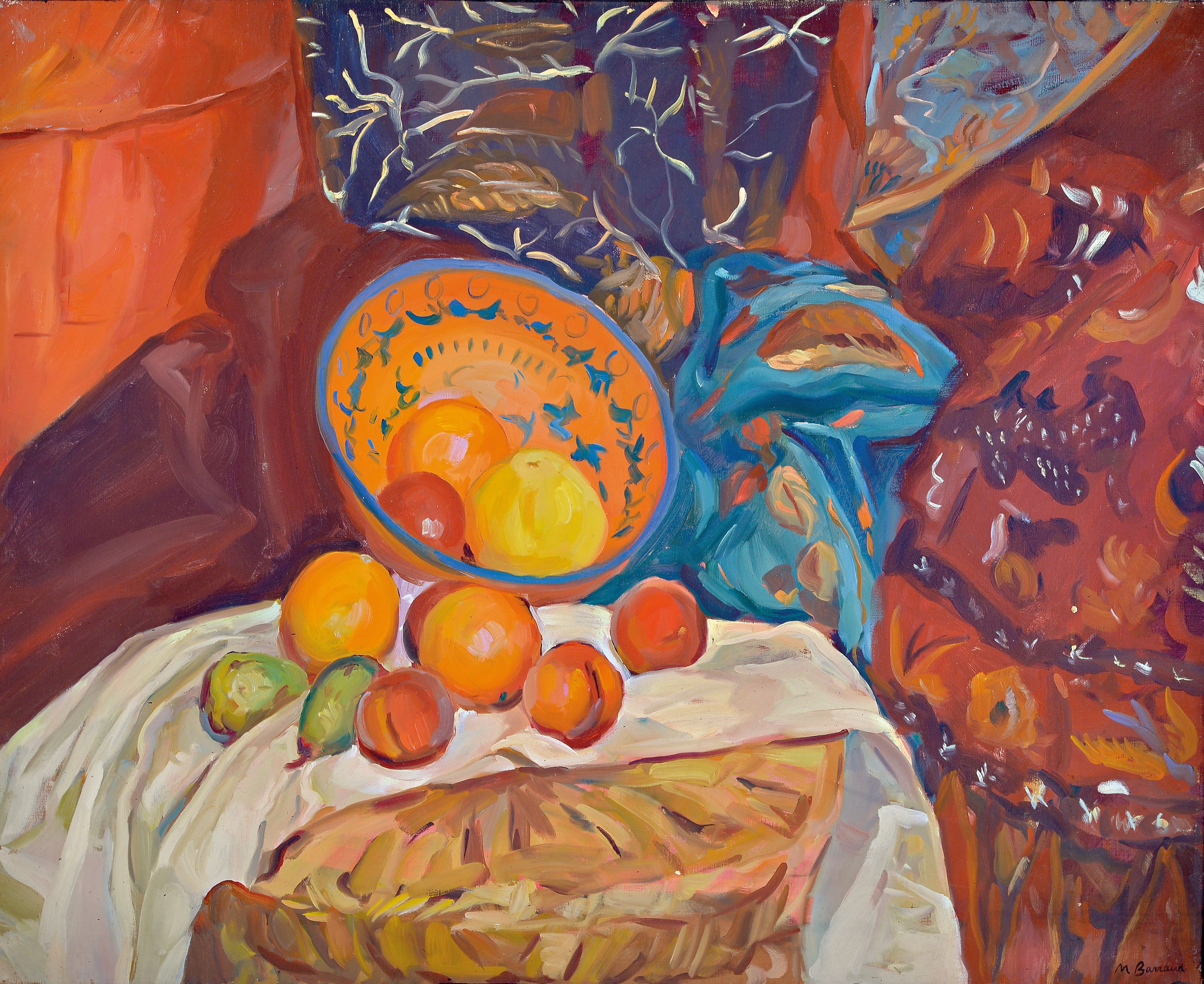 Maurice Barraud, 1889-1954, Stillleben mit Keramikschale und Obst vor bunten Draperien,