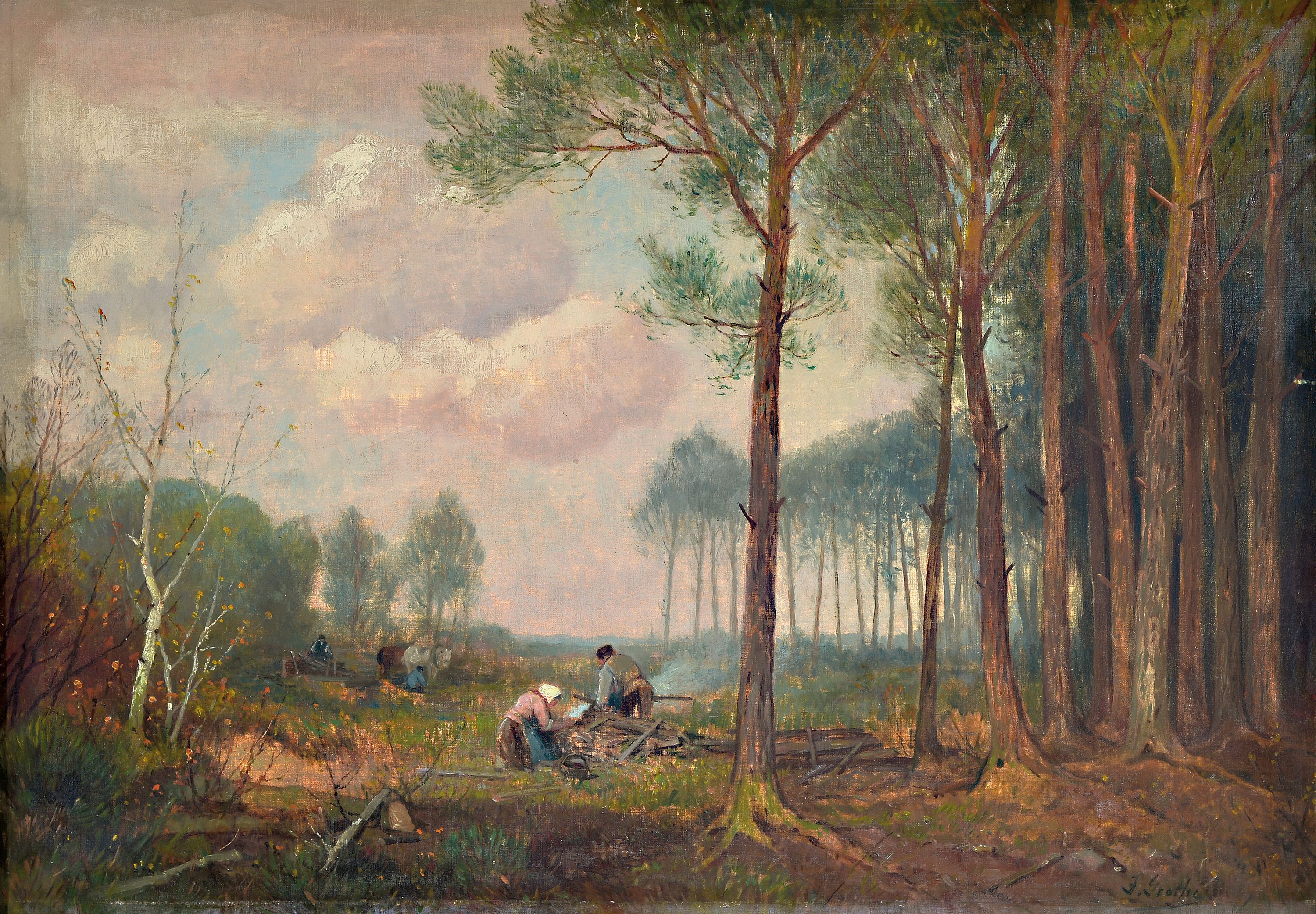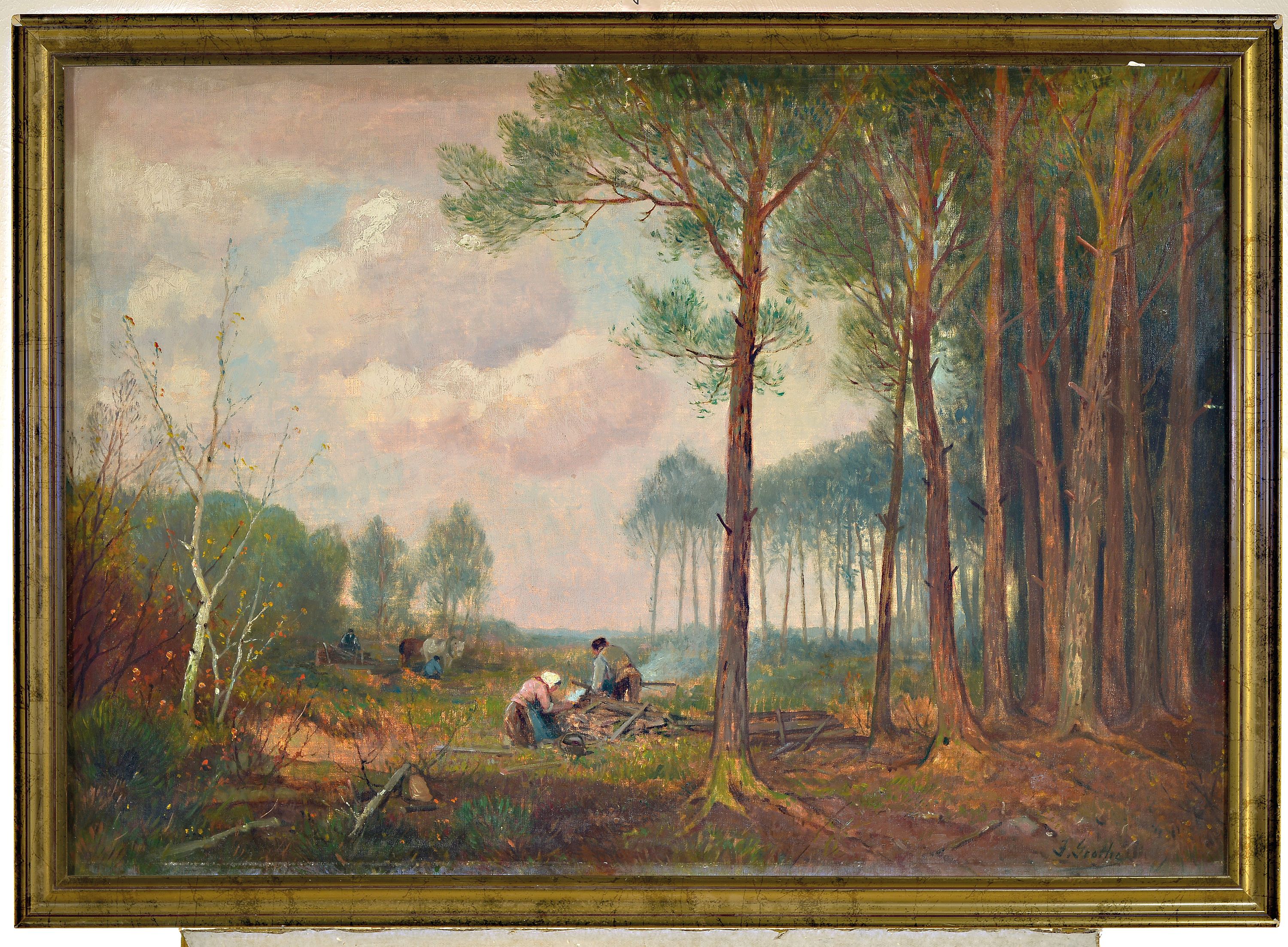 Jean Grothe, 1865-1925, Arbeiter auf einer Waldlichtung, Öl/Lwd, rechts unten sign.,