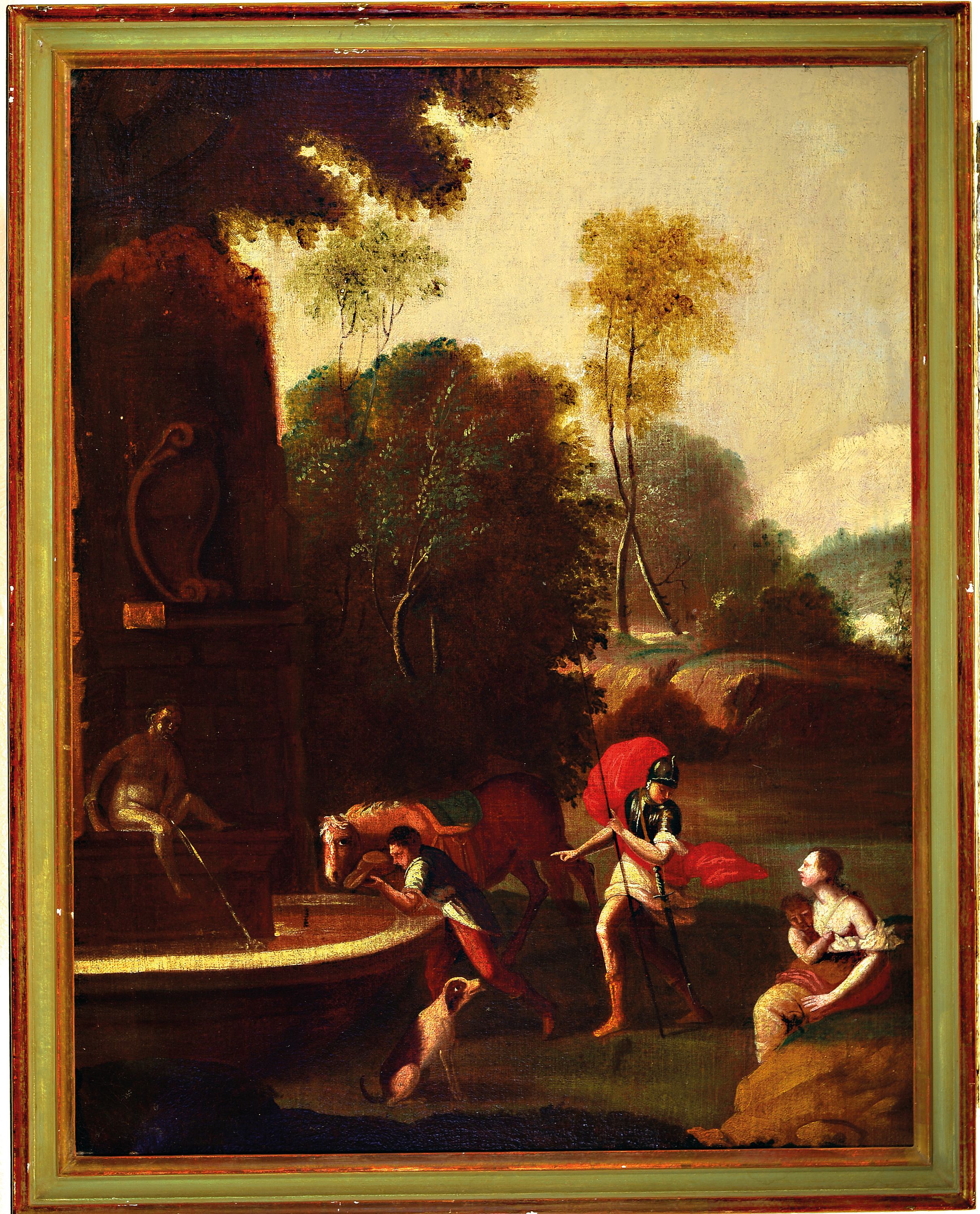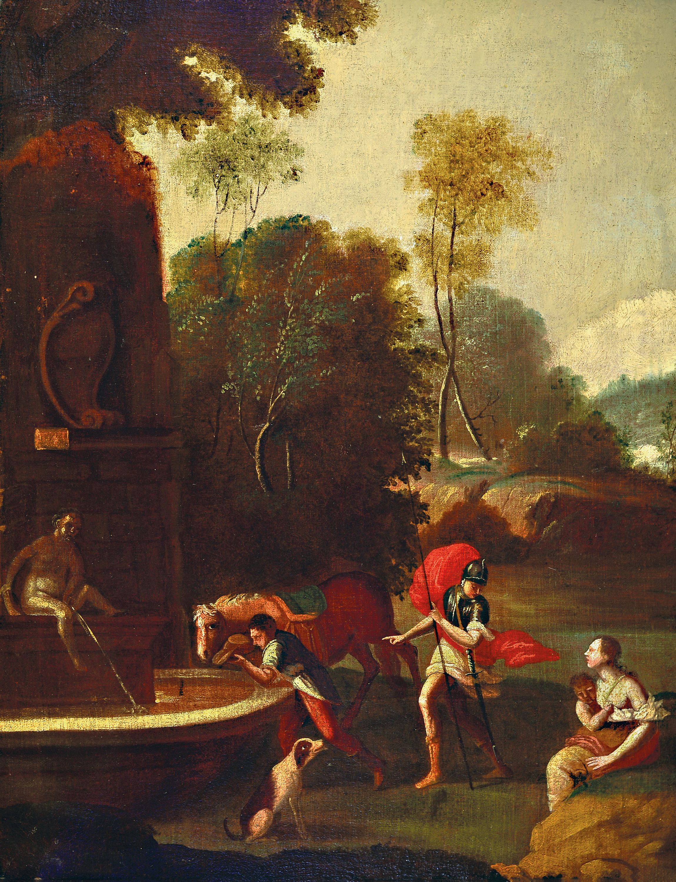 Unbekannter Niederländer des 18.Jh., Figurengruppe um einen Brunnen, Öl/Lwd, restauriert