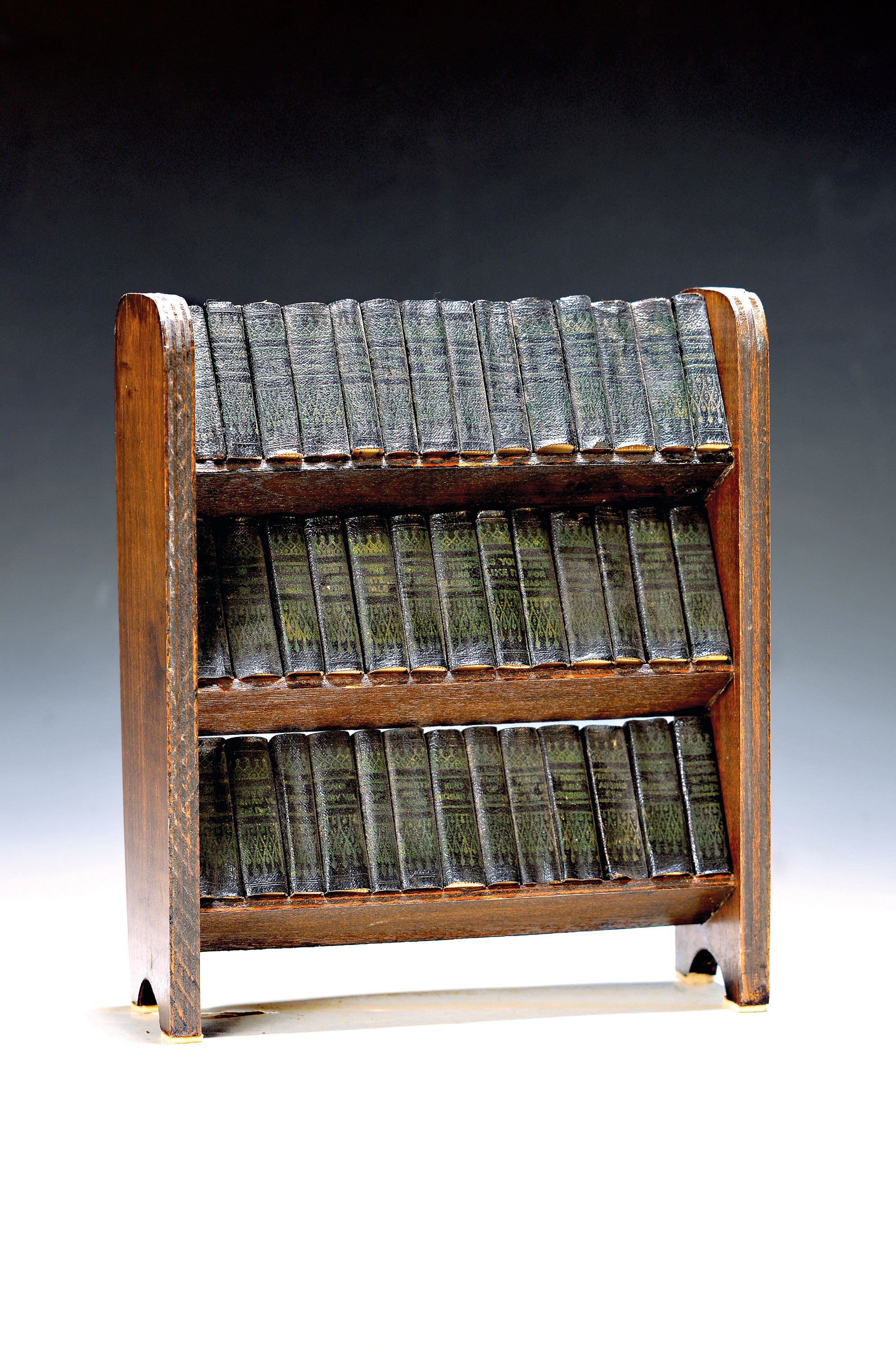 Jh., auf kleinem Holzregal ca. 22.5 x 19.5 x 6.5 cm, Miniaturbände ca. 5 x 3.5 cm,